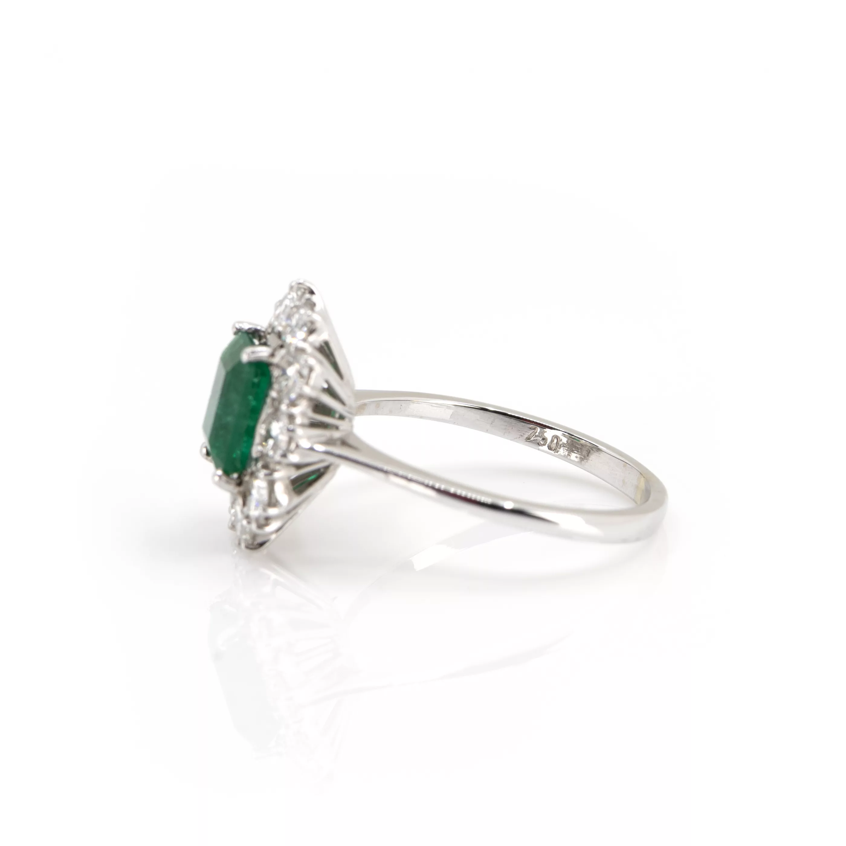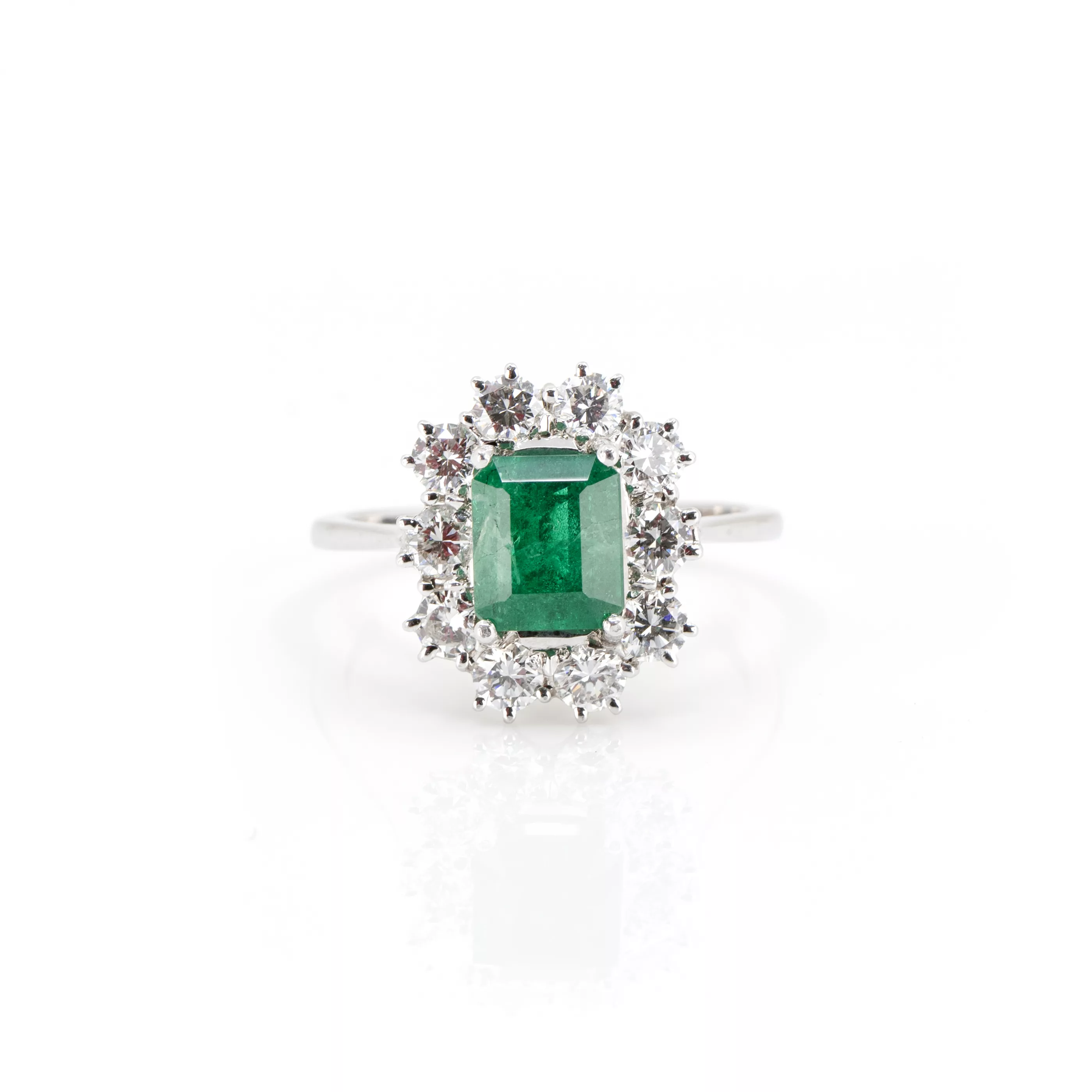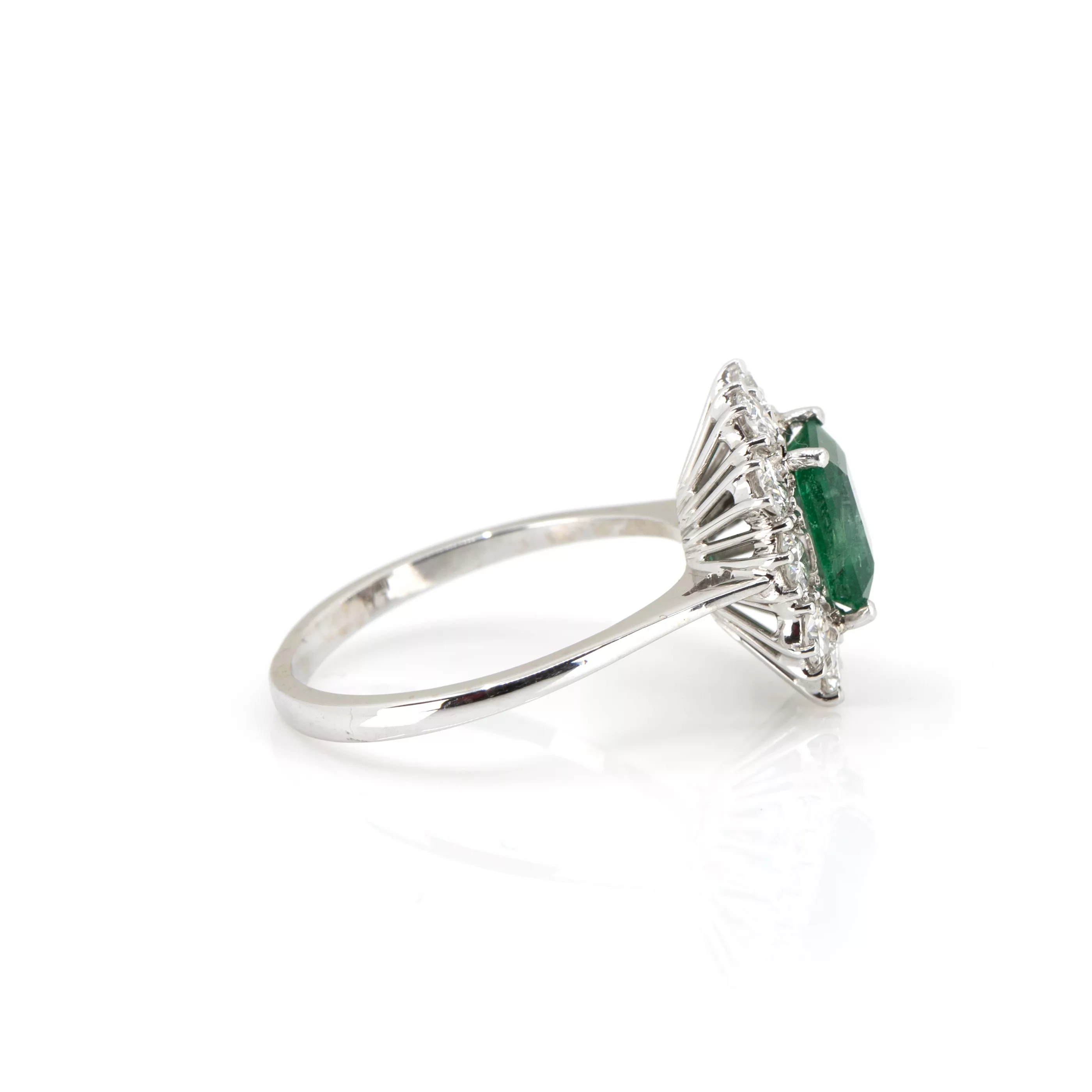 750 white gold, hallmarked, 10 brilliant-cut diamonds, total approx. 1.00 ct, F-G, vvs-vs, faceted emerald, Colombia, approx. 1.65 ct, RW 56, weight approx. 4.7 g