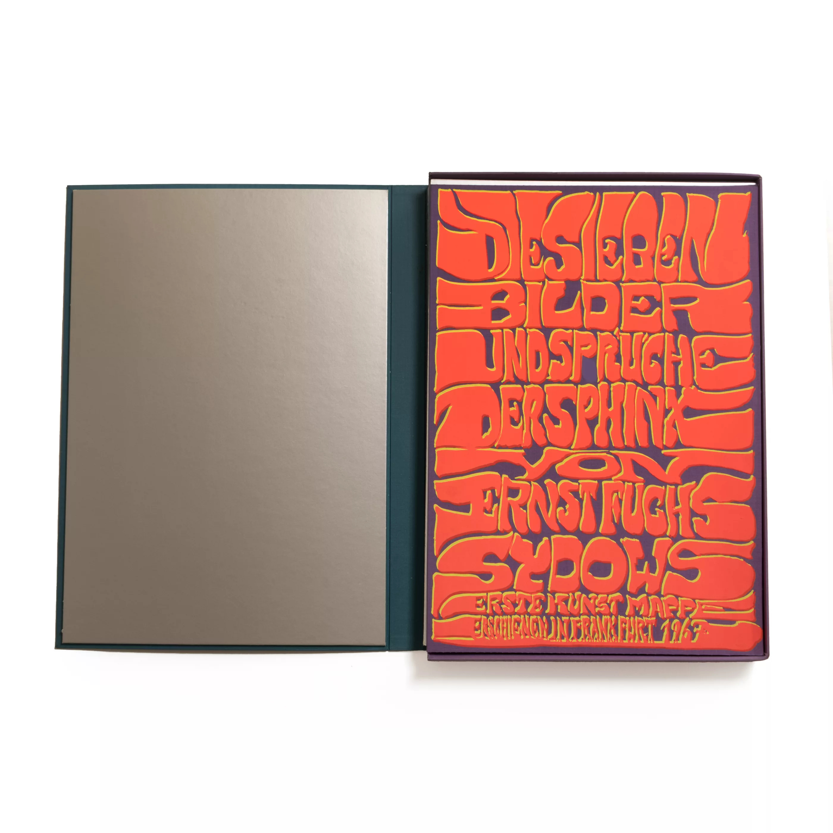 Portfolio 'The seven images and sayings of the Sphinx', in original canvas cassette, 6 colour etchings on wove paper, 1967, 59 cm x 41.5 cm sheet dimensions, each signed, numbered 95/99, contents page with texts and imprint in each passepartout, cardboard passepartout, with silkscreen title on the inside, published by Galerie Sydow, sheet 7 absent, sheet 2 stained, sheet corner torn at lower left, sheet 6 slightly creased, lower sheet margin slightly torn, passepartouts partially slightly bumped, cassette partially stained, rubbed, darkened, damaged on the back