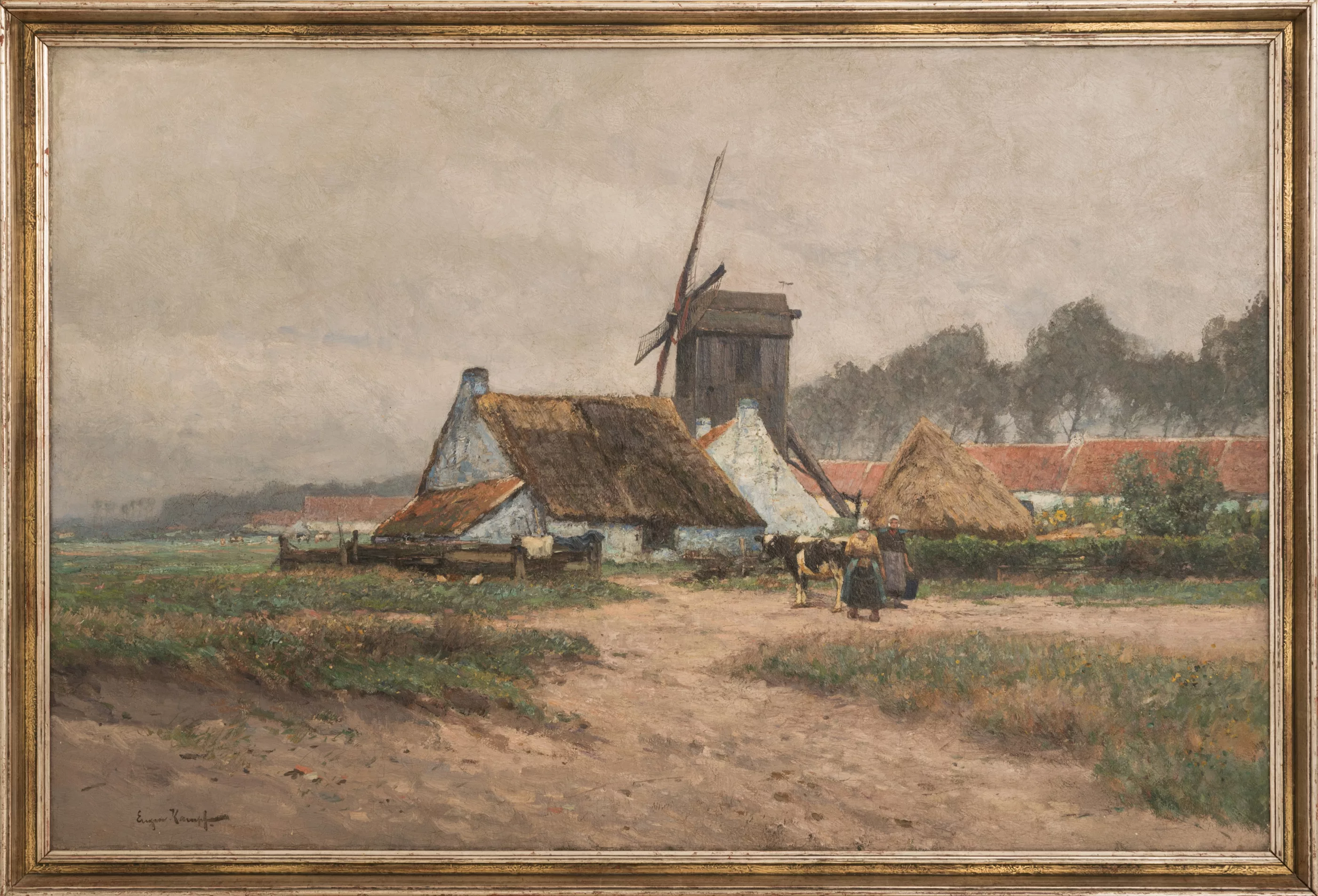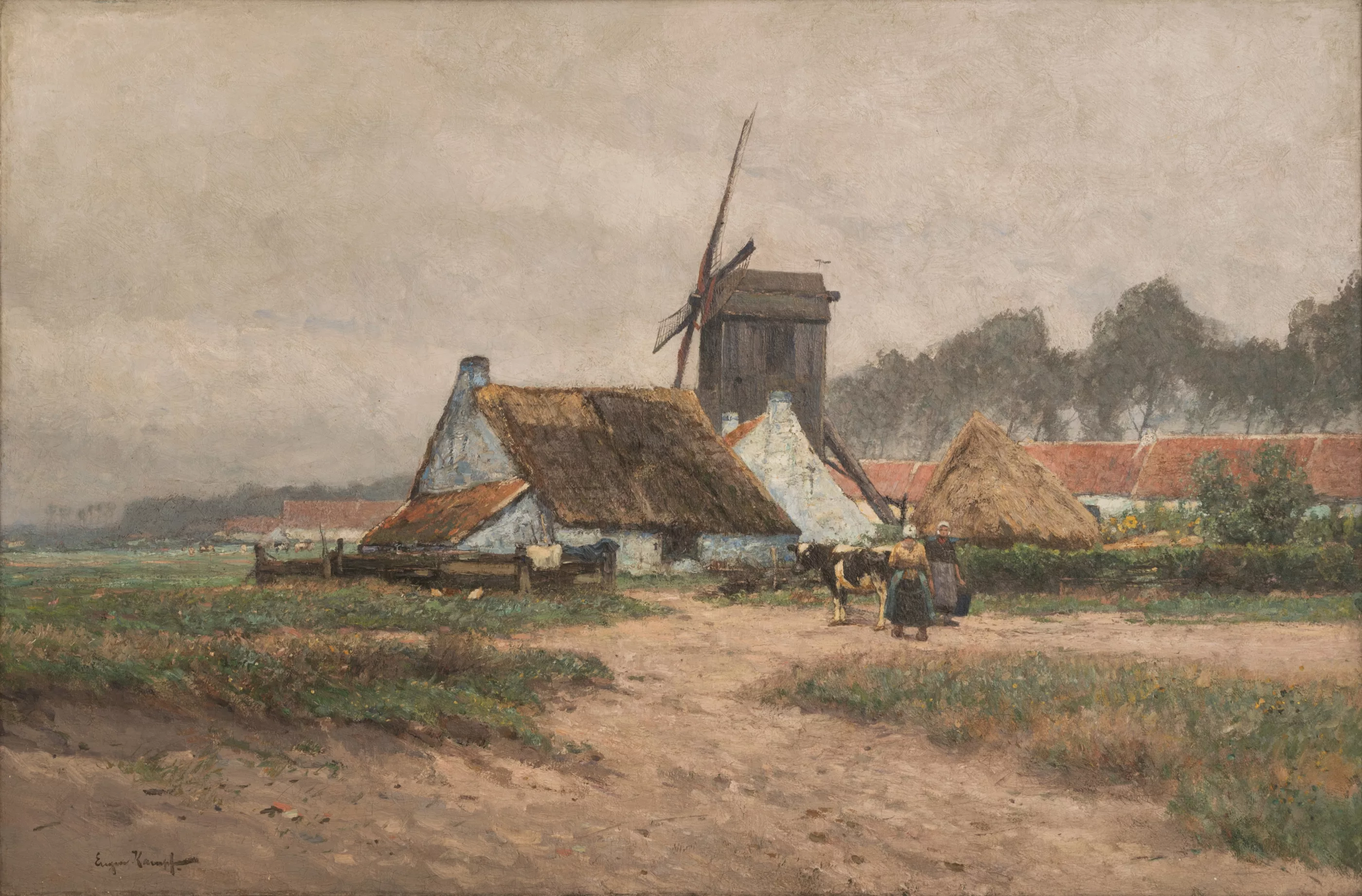 Flandrisches Gehöft mit Mühle, Öl auf Leinwand auf Platte aufgezogen, 74 cm x 109,5 cm Werkmaß, signiert, partiell craqueliert, kleine...