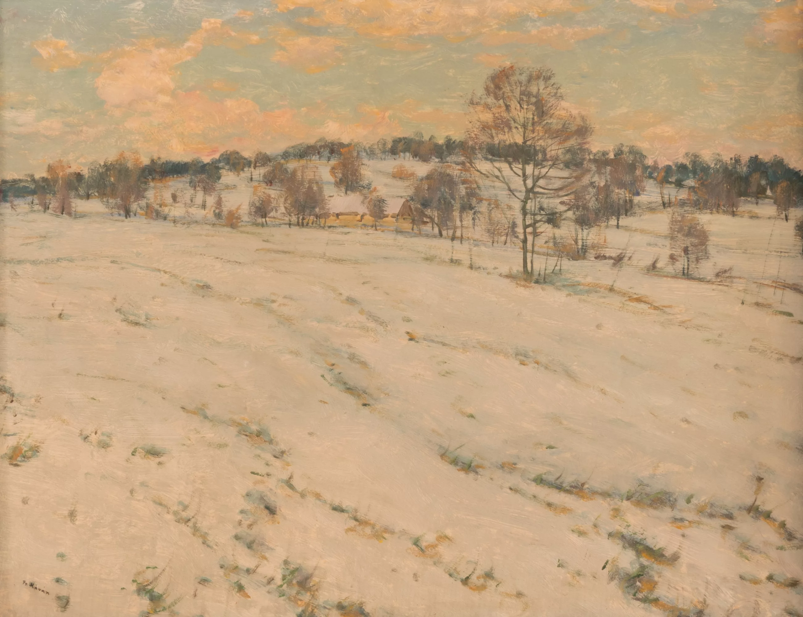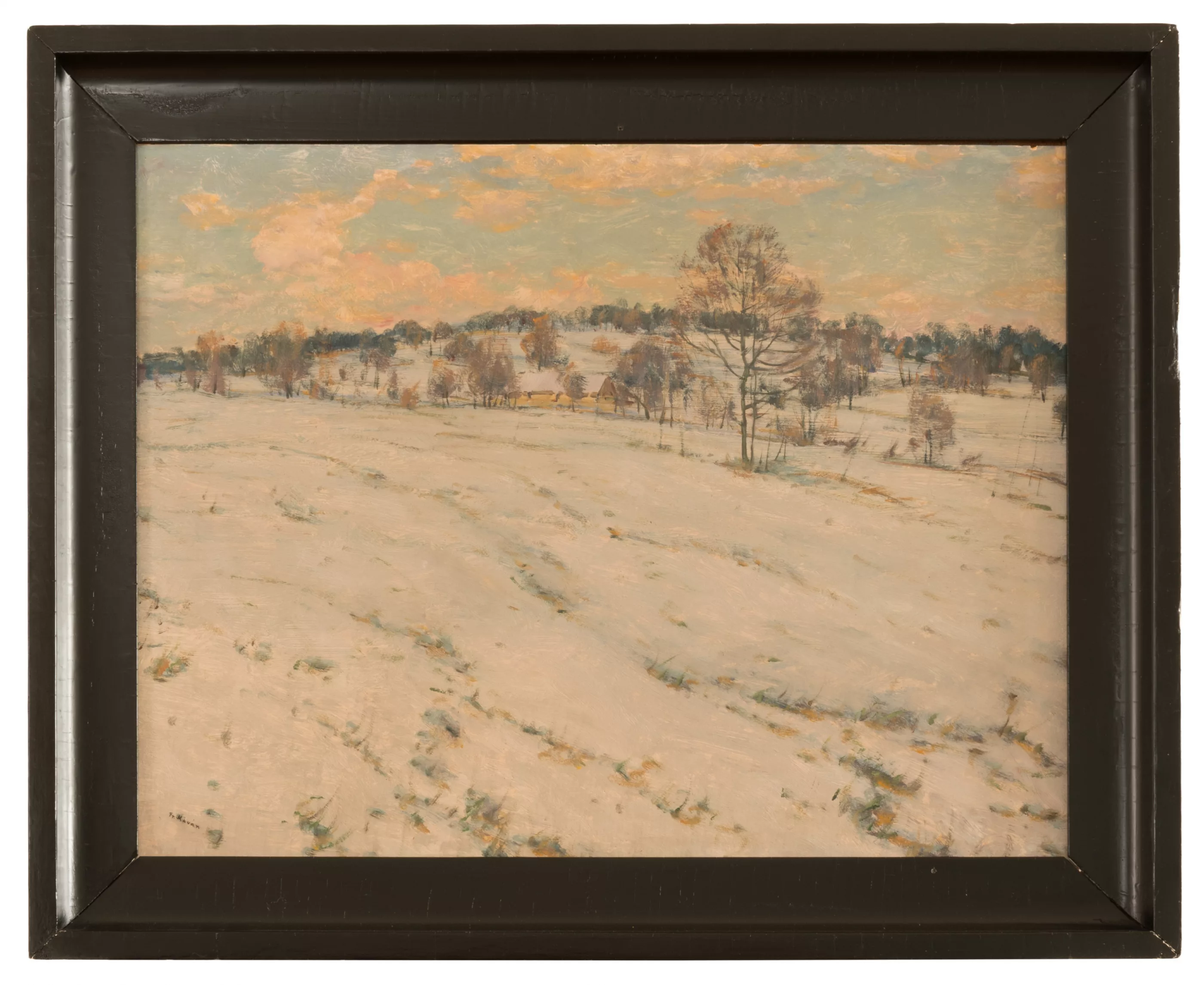 Winterlandschaft, Öl auf Karton auf Platte aufgezogen, 49 cm x 64,5 cm Werkmaß, signiert, verso zwei handschriftliche Echtheitsbestätigungen von Dr. F. X. Harlas (1930) und Maximilian Duchek (1943), an den Blatträndern partiell leichte Beschädigungen