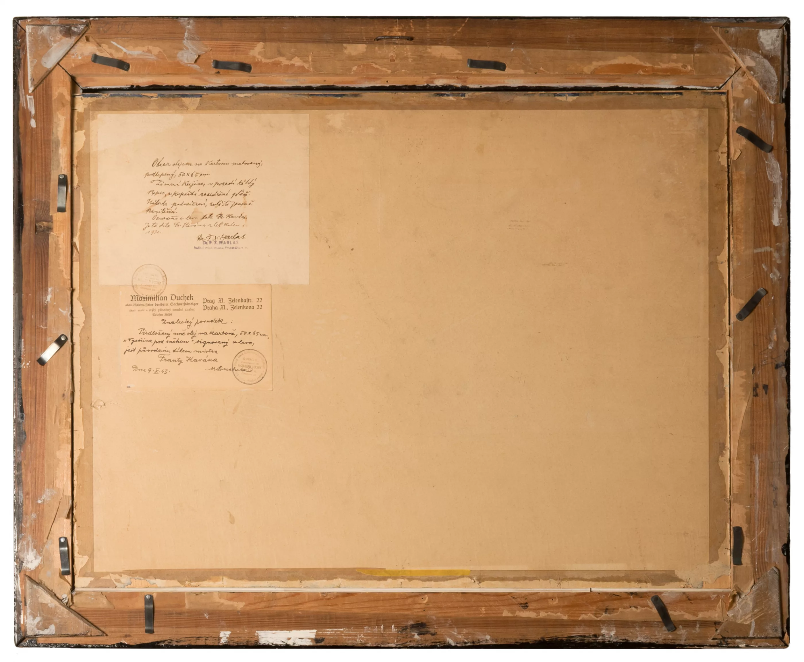 Winter landscape, oil on cardboard mounted on panel, 49 cm x 64.5 cm object dimensions, signed, on the verso two handwritten confirmations of authenticity by Dr F. X. Harlas (1930) and Maximilian Duchek (1943), some slight damages at the sheet edges