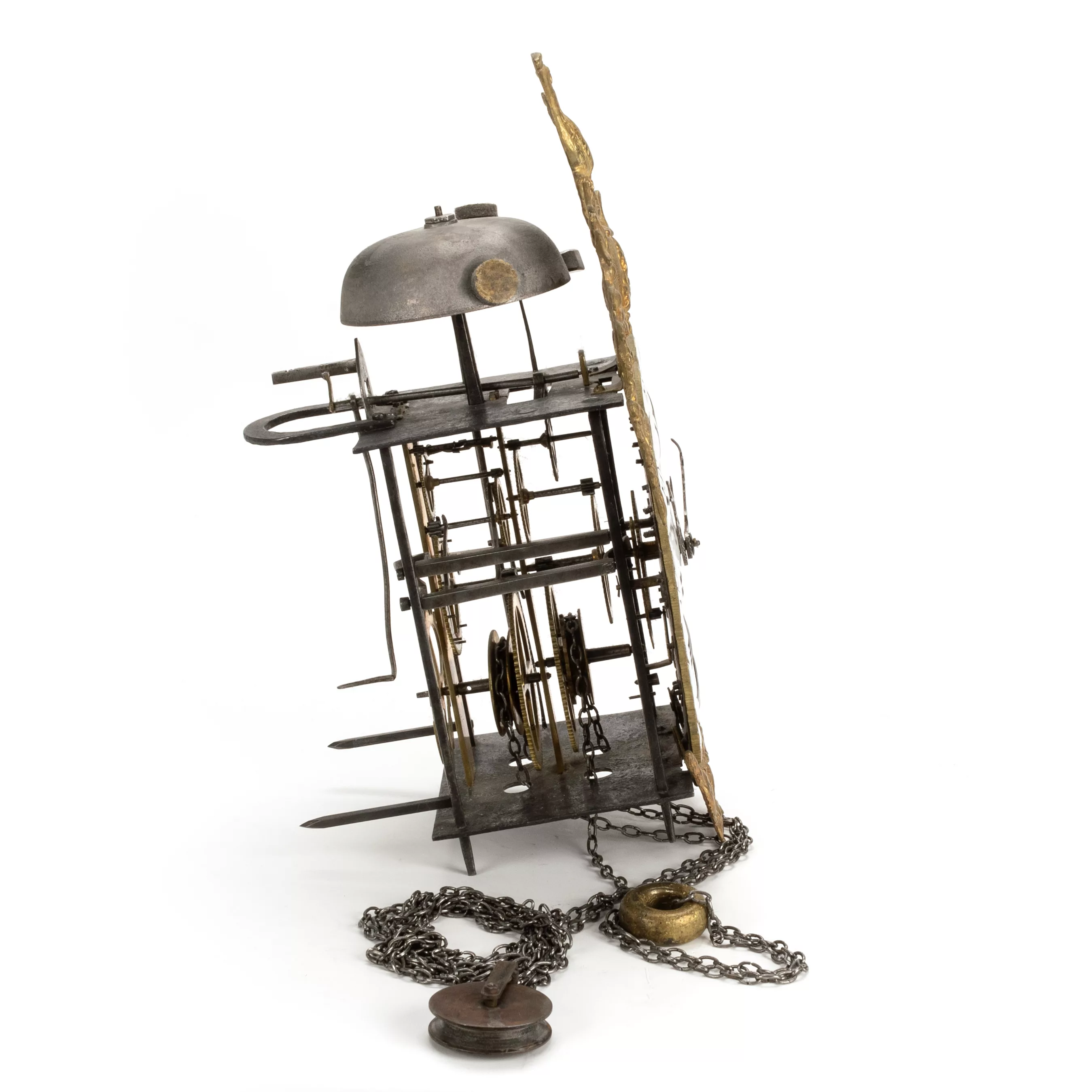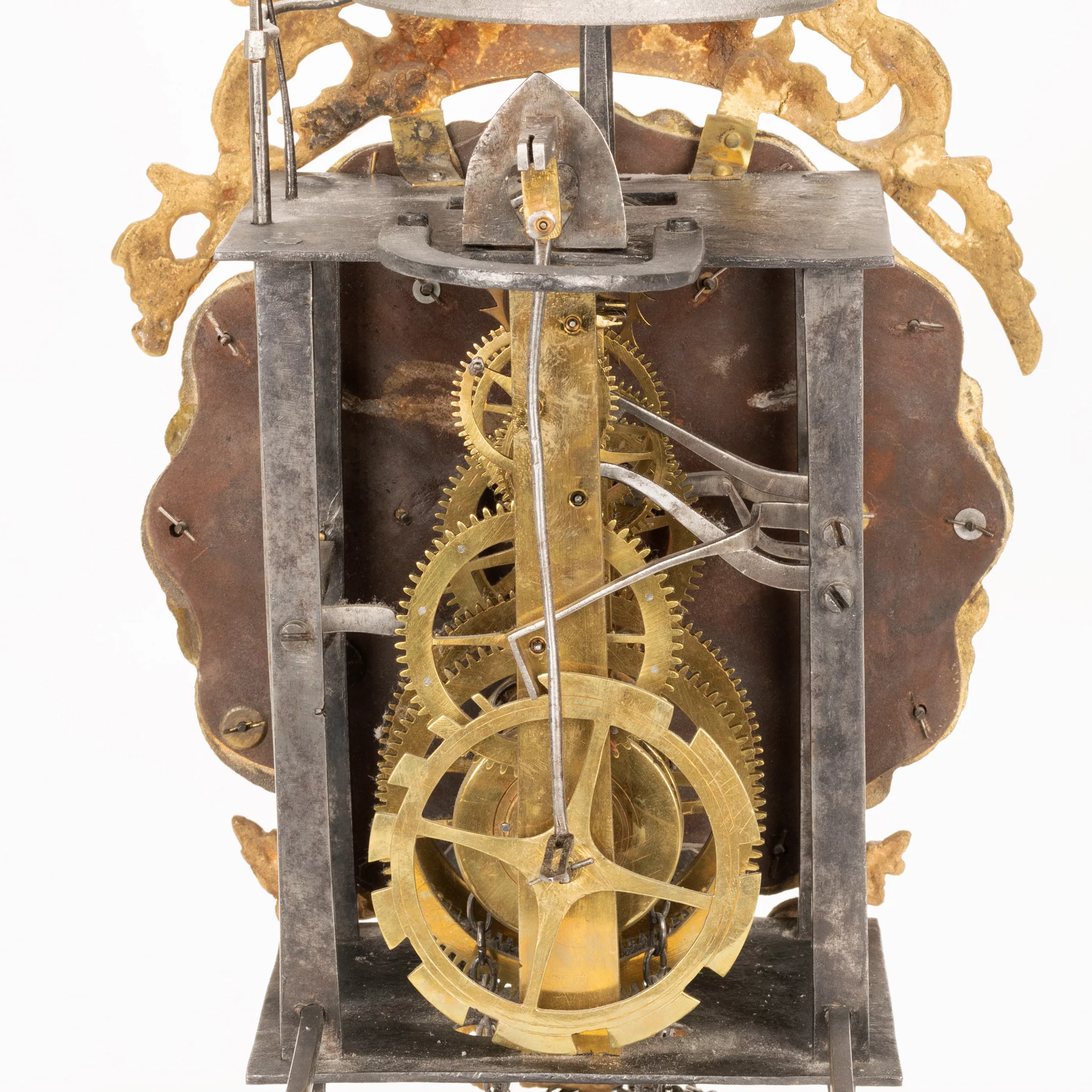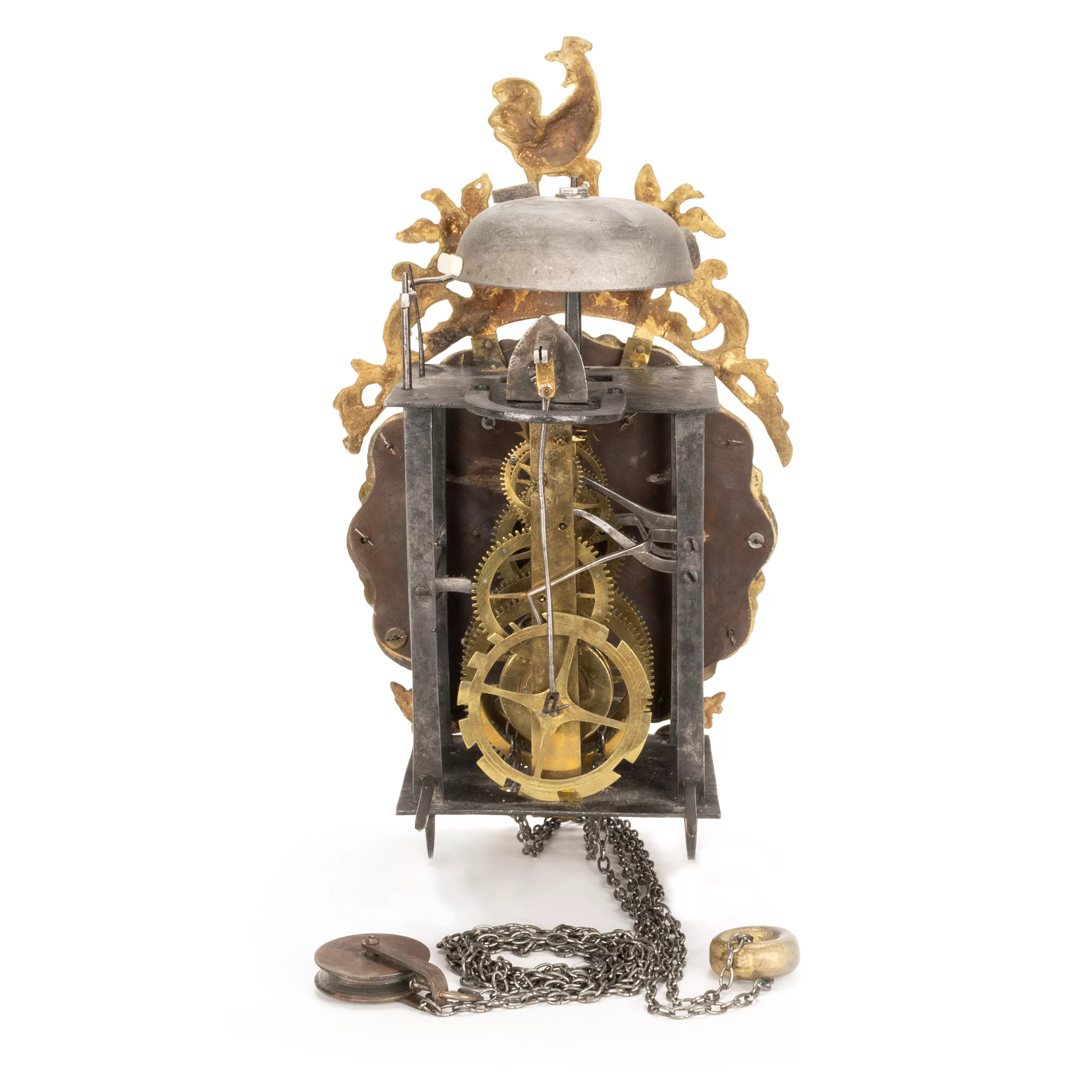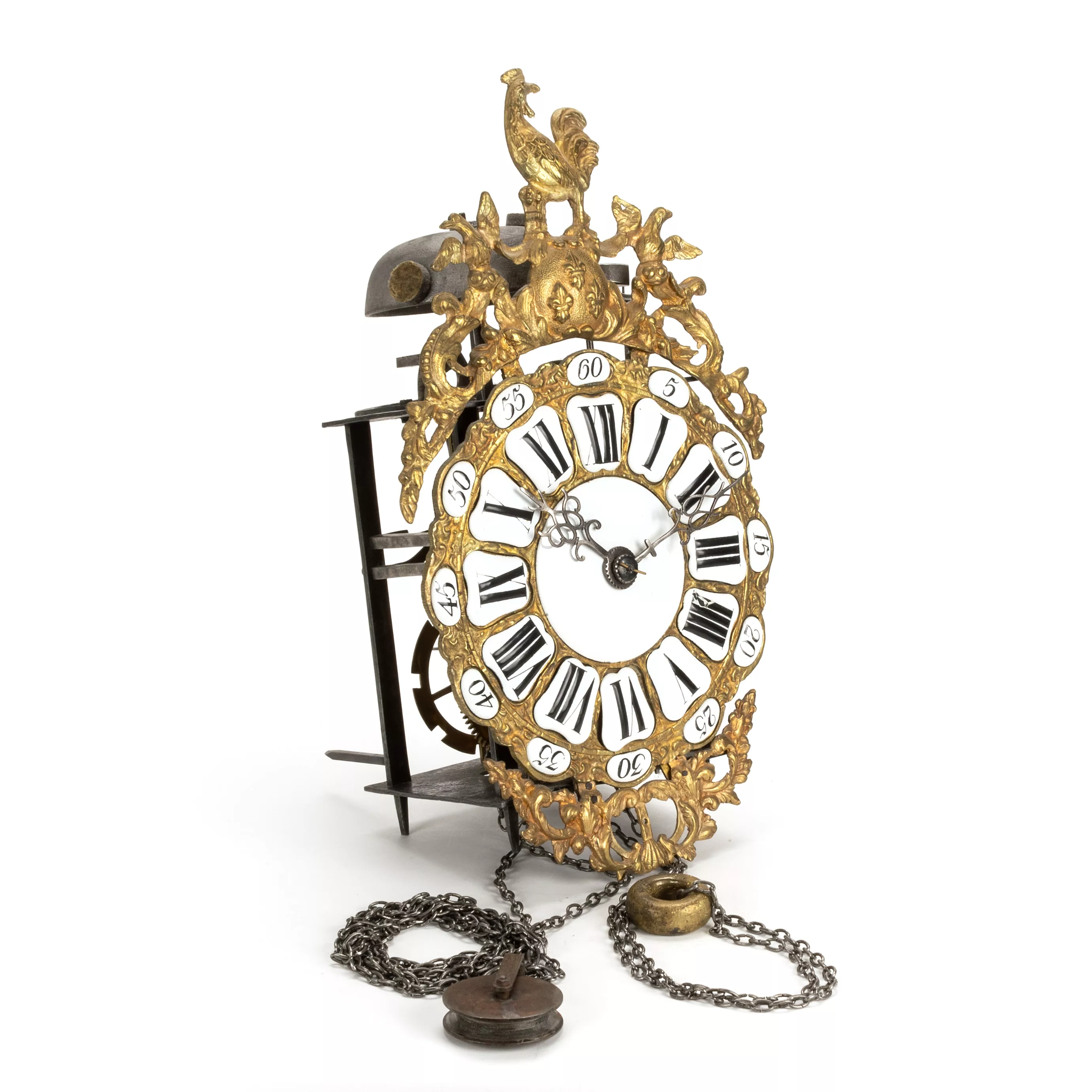circa 1750, bronze dial with enamel cartouches, black Roman hour and Arabic minute numerals, finely worked, hand-sawn hands, empty signature cartouche below the dial, bronze crown with Gaelic cock looking to the right, three Bourbon lilies in the medallion below the cock, 8-day lever movement, going and striking train, half and hour strike on bell over lock plate, weight drive via loose pulley and chain, long pendulum with pendulum bob, iron case with claw feet, height of case 40.5 cm, length of pendulum 126 cm, pendulum and weight enclosed, expertise from 1985 enclosed, enamel of figure 4 damaged, in need of repair