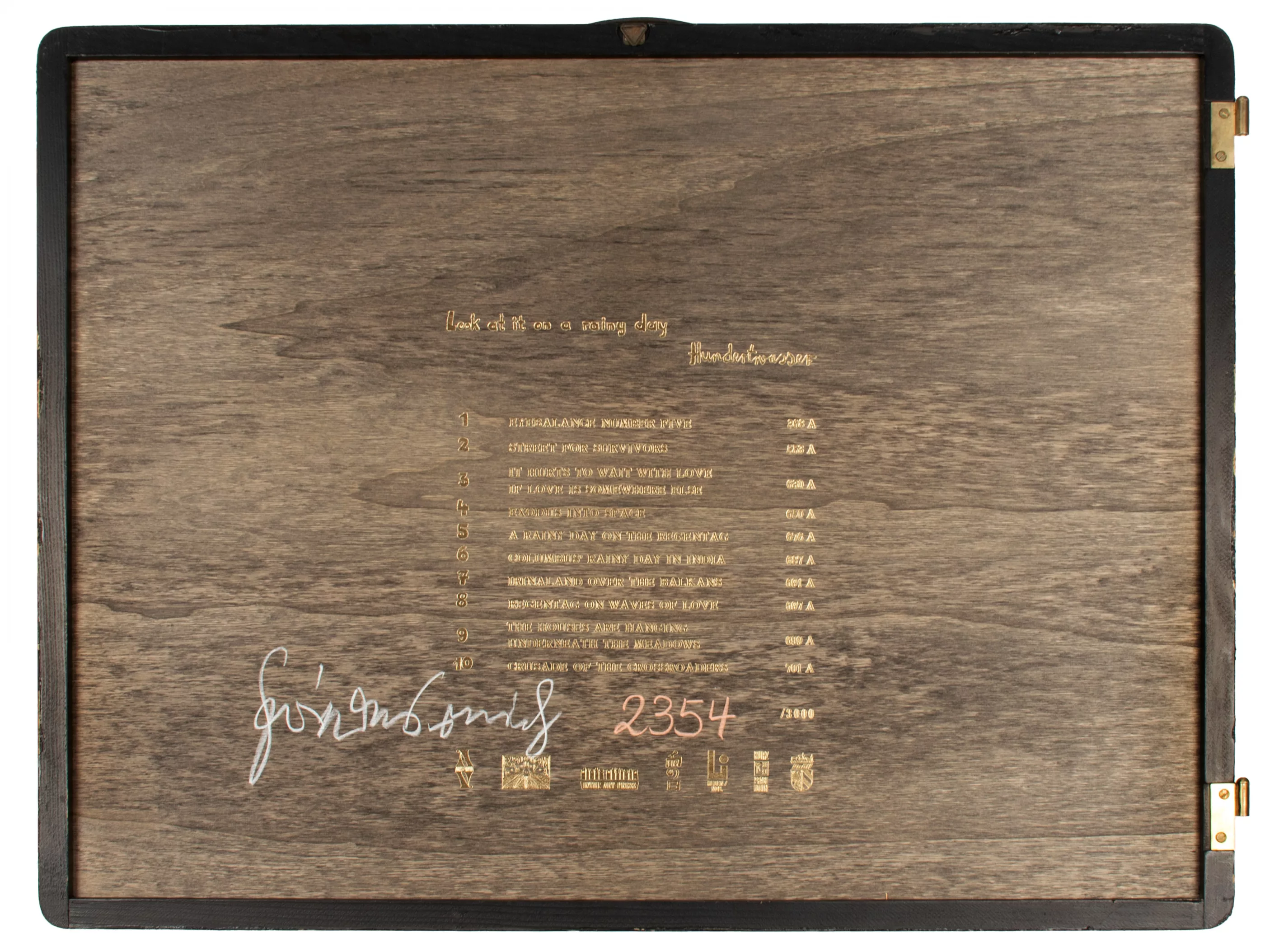 papers, two additional serigraphs with glass dust overlay, all serigraphs signed in the print form, all numbered, portfolio dimensions approximately 54.5 x 72.5 x 4.7 cm, paper size up to 49 x 67 cm, portfolio from an edition of 3,000 copies, loose sheets in original wooden box with lid illustration in color serigraphy with metal embossings, title list inside the lid, complete, signs of use on the wooden box, such as damaged hinges, scratches and wear of the wood and paint, serigraphs partially wavy, creased, and stained, one serigraph showing a medium-sized tear, another with a smaller hole, most serigraphs showing traces of adhesive tape on the back (some still present, some already removed), dated 1971