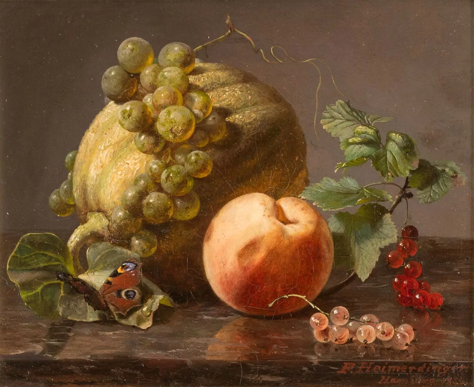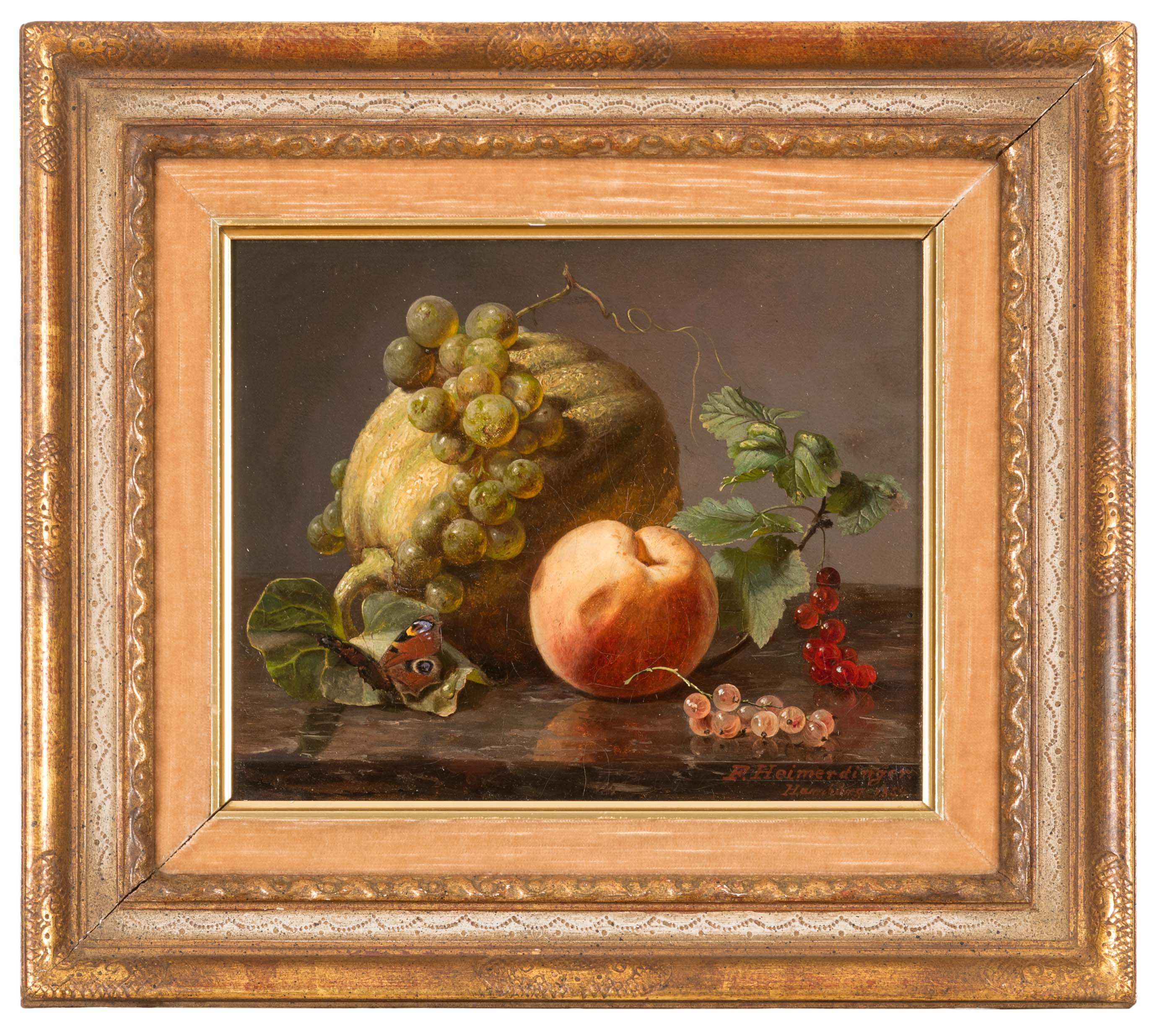Stillleben mit Pfirsich, Melone und Schmetterling, Öl auf Holz, 19,5 cm x 23,5 cm Werkmaß, signiert, Hamburg 1854 ortsbezeichnet und datiert, craqueliert, partiell retuschiert