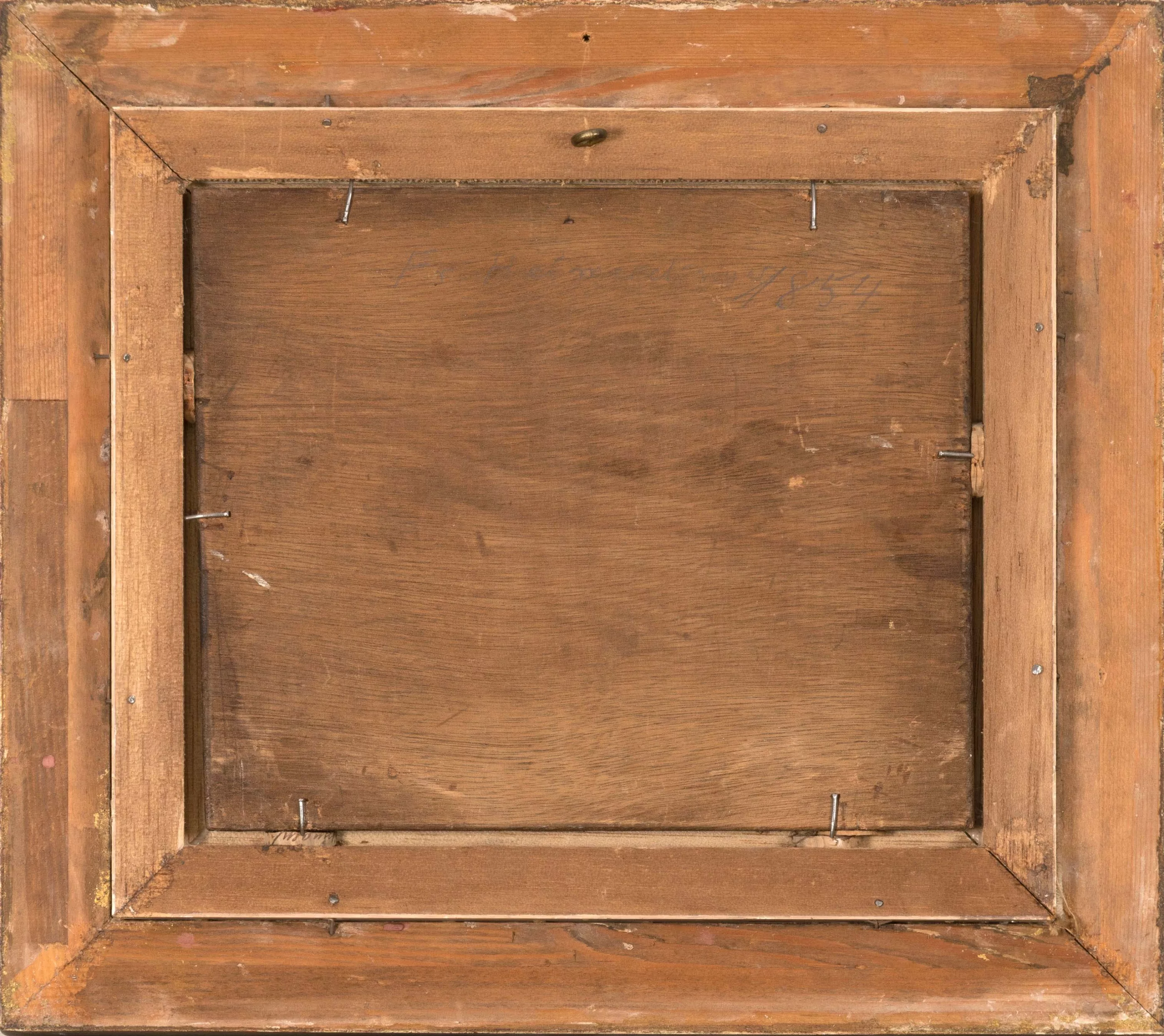 Still life with peach, melon and butterfly, oil on wood, 19.5 cm x 23.5 cm object dimensions, signed, Hamburg 1854 inscribed and dated, craquelured, partially retouched