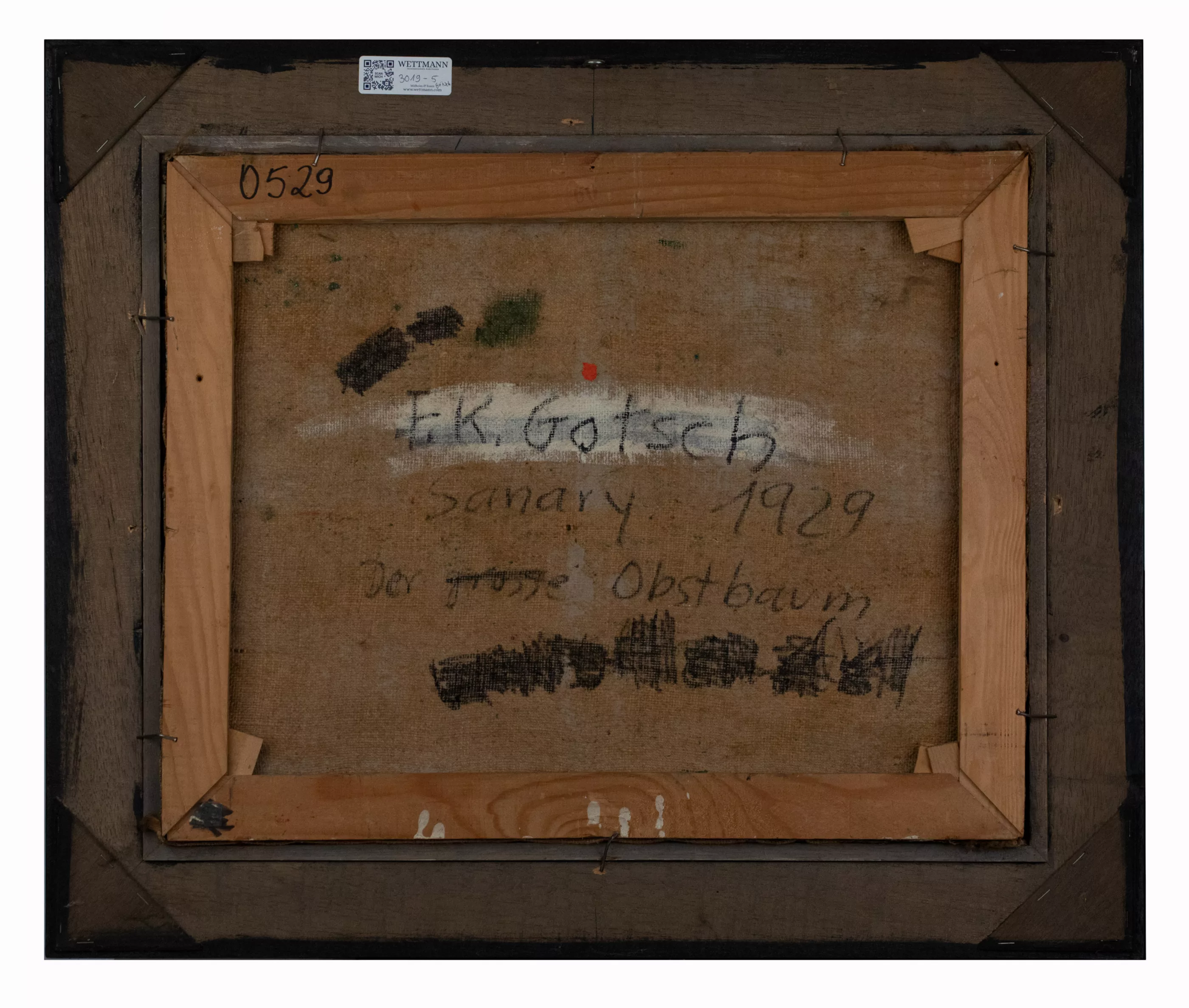 Der Obstbaum, Öl auf Leinwand, 48,5 × 60,5 cm, FKG monogrammiert, rückseitig signiert, 1929 datiert, beschriftet Sanary, aufgrund der groben Leinwandstruktur (Sackleinen) partiell kleine, materialbedingte Löcher im Träger, kein Durchstoß, Provenienz: Galerie Koch, Hannover, Privatsammlung Hannover, beiliegend Originalbeleg der Galerie Koch, Rechnung über 48.000 DM vom 9. Juli 1986