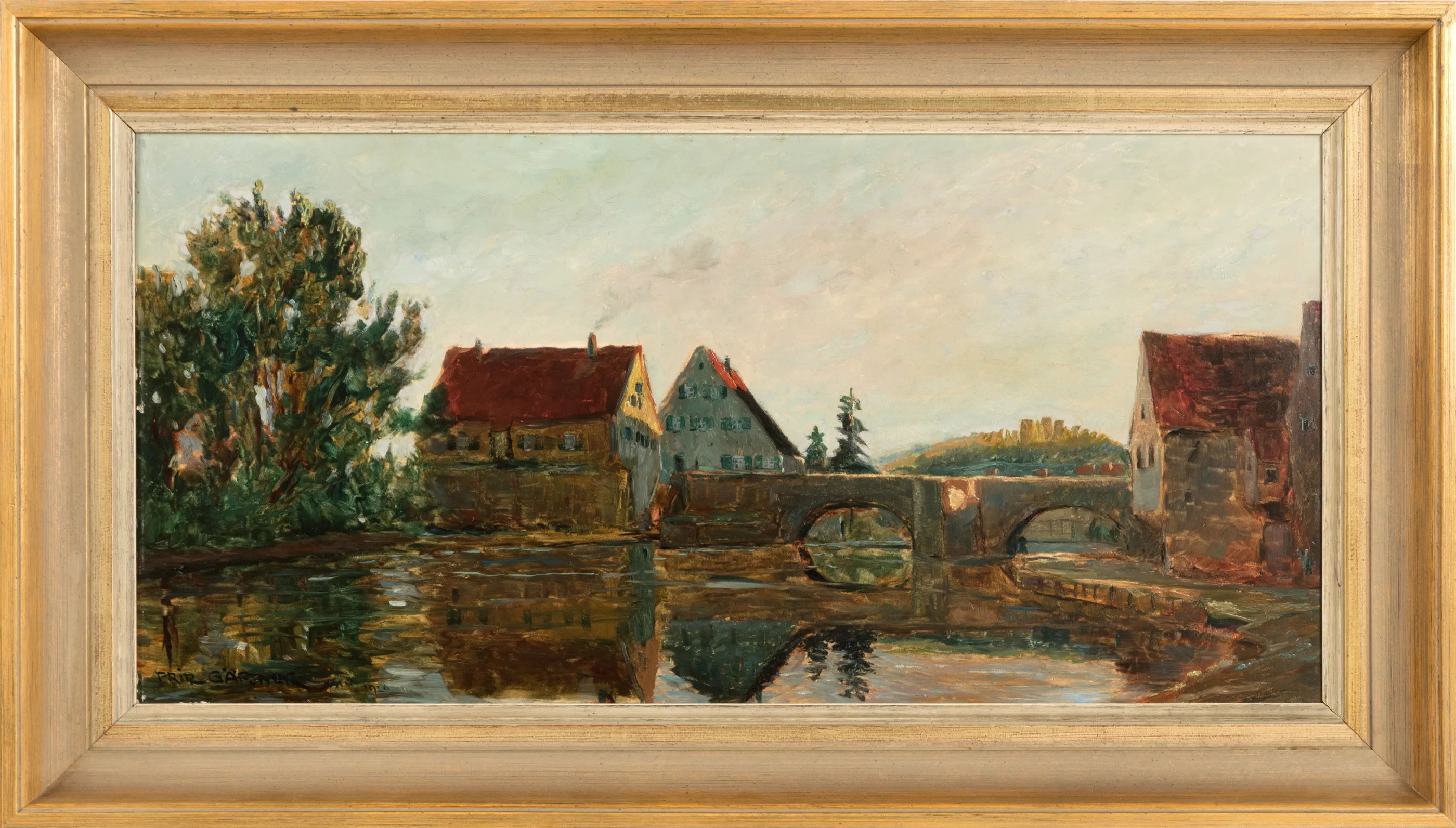 Fluss- und Dorflandschaft, Öl auf Holz, 30,5 cm x 60 cm Werkmaß, signiert, 1920 datiert, partiell retuschiert