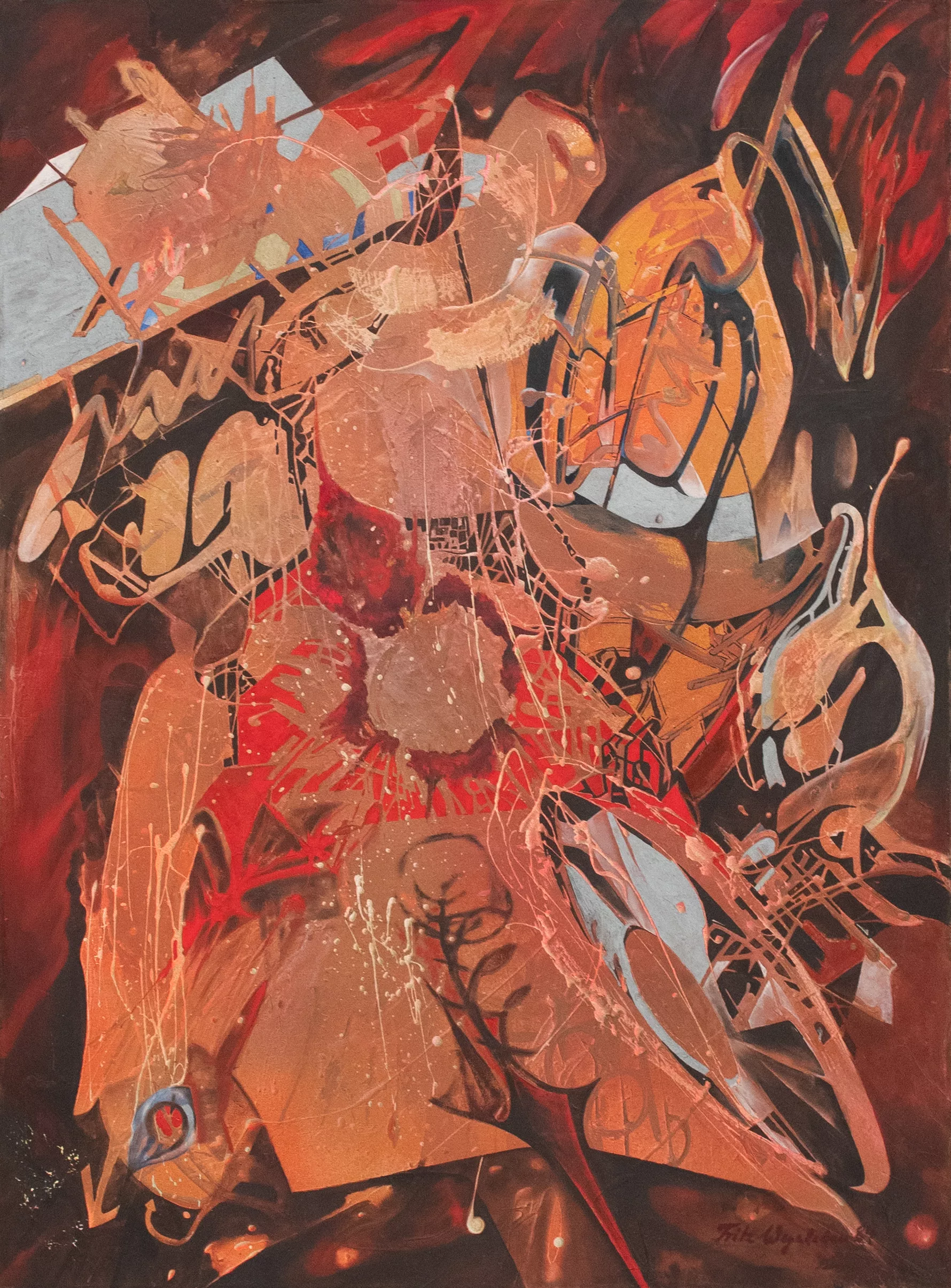 'Dance of the Volcano or the Hope of Fire', mixed media on canvas, 100 cm x 135 cm canvas dimensions, signed, titled, dated 1984 on verso, partially rubbed