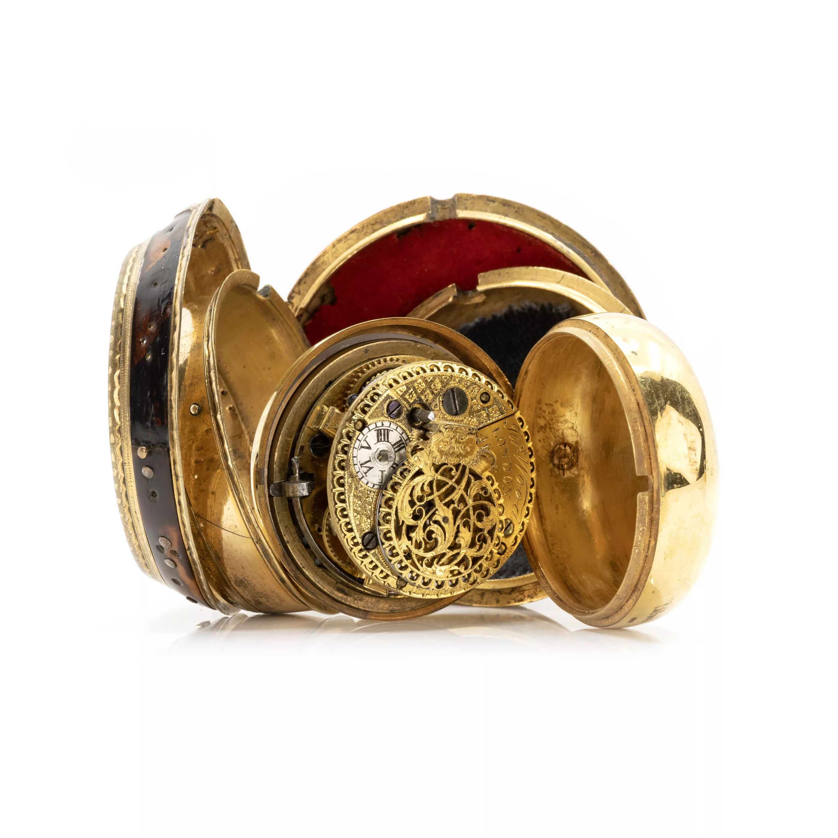 England, London, 1. Hälfte 19. Jh., gefertigt für den osmanischen Markt, vergoldetes Spindelwerk mit Aufzug über Kette und Schnecke, teils ziseliert und durchbrochen gearbeitet, Messing- oder Bronzegehäuse mit Vergoldung und doppeltem Übergehäuse, Schildpatt-Übergehäuse mit Zapfenverzierung, weißes Emaillezifferblatt mit schwarzen, osmanischen Ziffern, schwarze äußere Minuterie, Stahlzeiger, originales Mineralglas, Werk bezeichnet 'Ja. Wood London 4646', Funktion geprüft, läuft an, reparaturbedürftig, Zustand befriedigend, Gehäuse beschädigt, Glas berieben