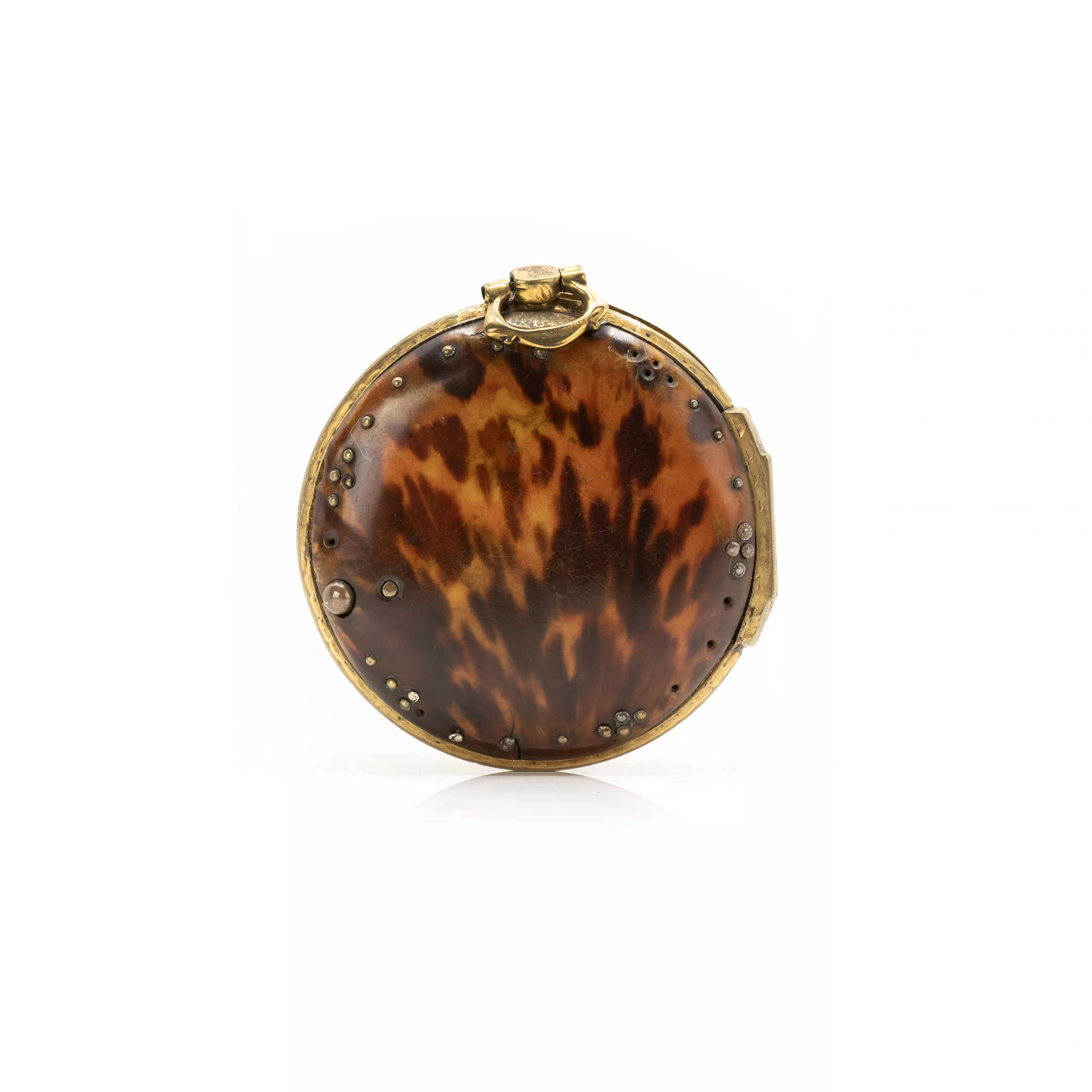 England, London, 1st half of the 19th cent, made for the Ottoman market, gilt verge movement with chain and fusee winding, partly chased and pierced, brass or bronze case with gilding and double overcase, tortoiseshell overcase with tenon decoration, white enamelled dial with black Ottoman numerals, black outer minute scale, steel hands, original mineral glass, movement marked 'Ja. Wood London 4646', function tested, starts, in need of repair, satisfactory condition, case damaged, glass rubbed