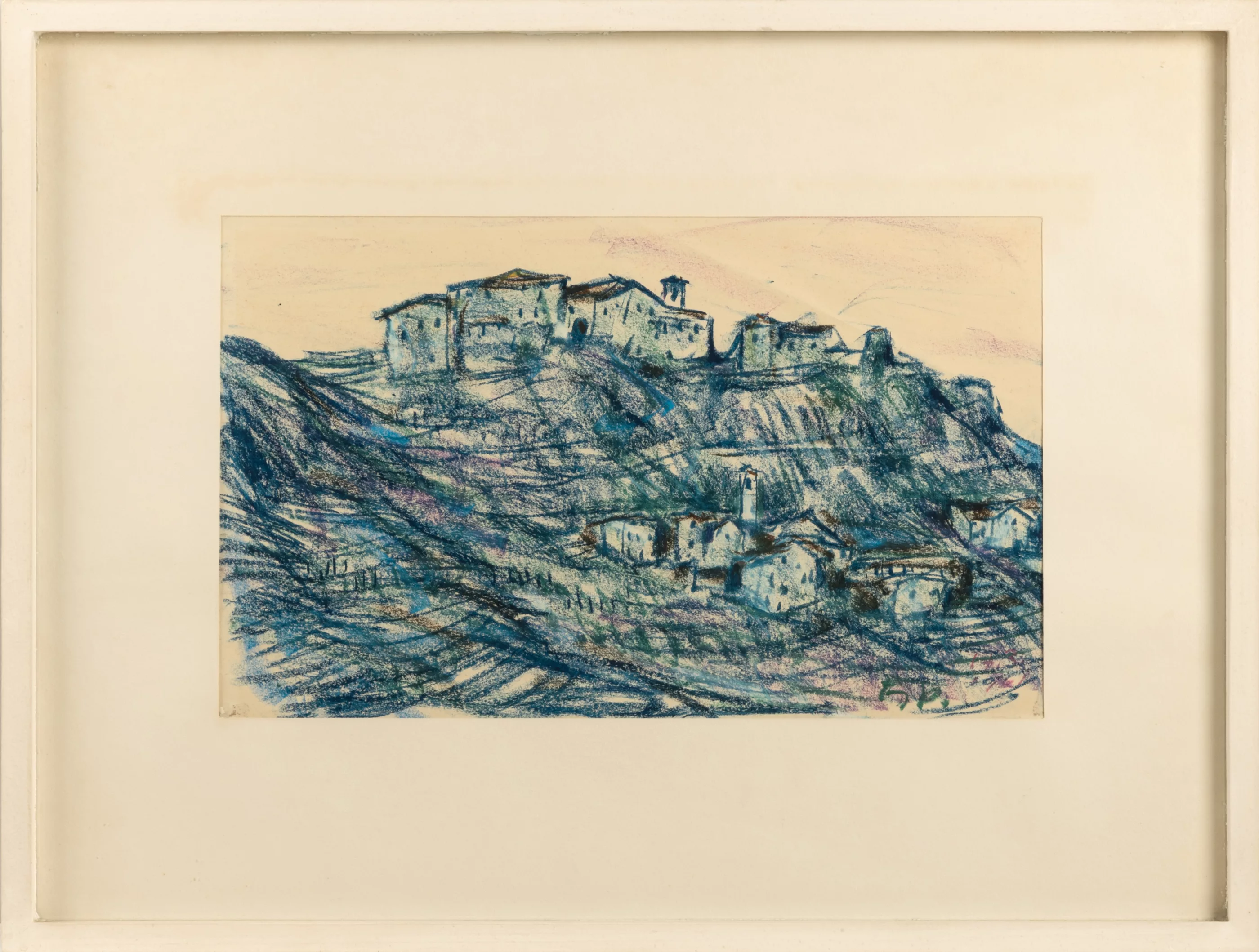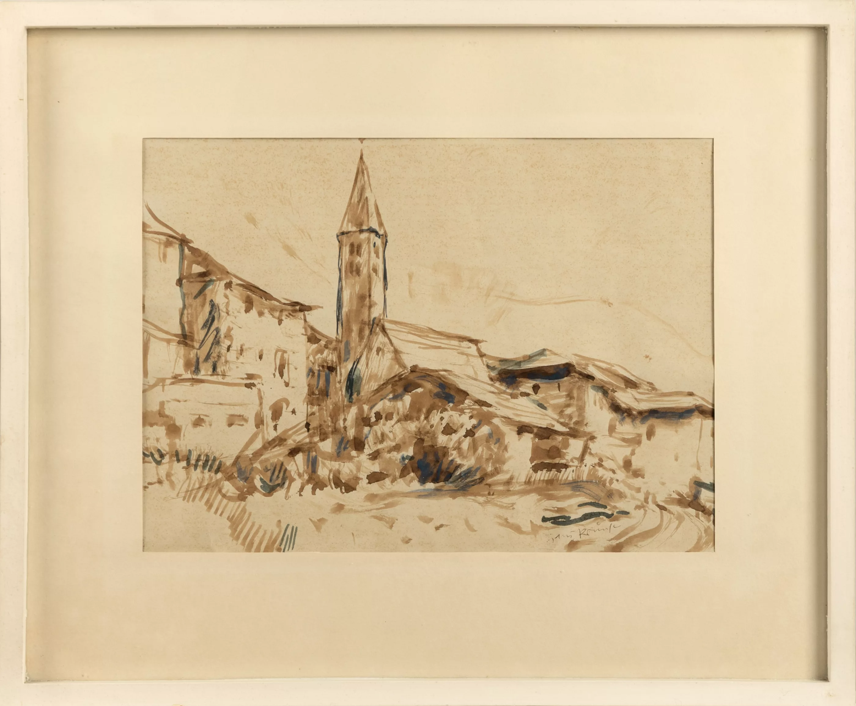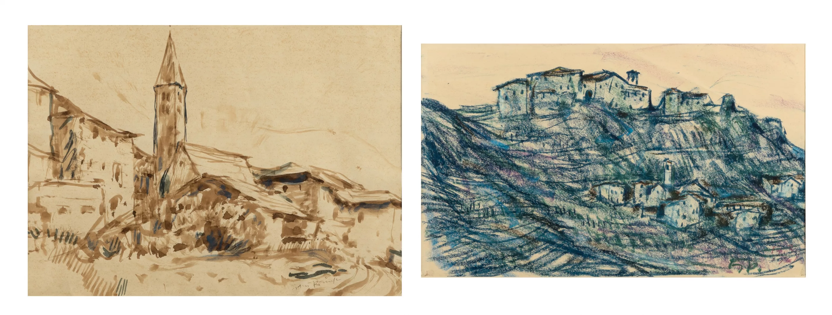 'Schrambach' und Dorf in den Südtiroler Bergen, zwei Alpenansichten, 'Schrambach' Aquarell auf chamoisefarbenem Papier, 27 cm x 37,5 cm Sichtmaß, signiert und betitelt, montiert, unten rechts knickfaltig, Blatt stockfleckig, Dorf in den Südtiroler Bergen, Farbkreide auf Papier, 24,5 cm x 40 cm Sichtmaß, monogrammiert, montiert, leichter Lichtrand, leicht stockfleckig