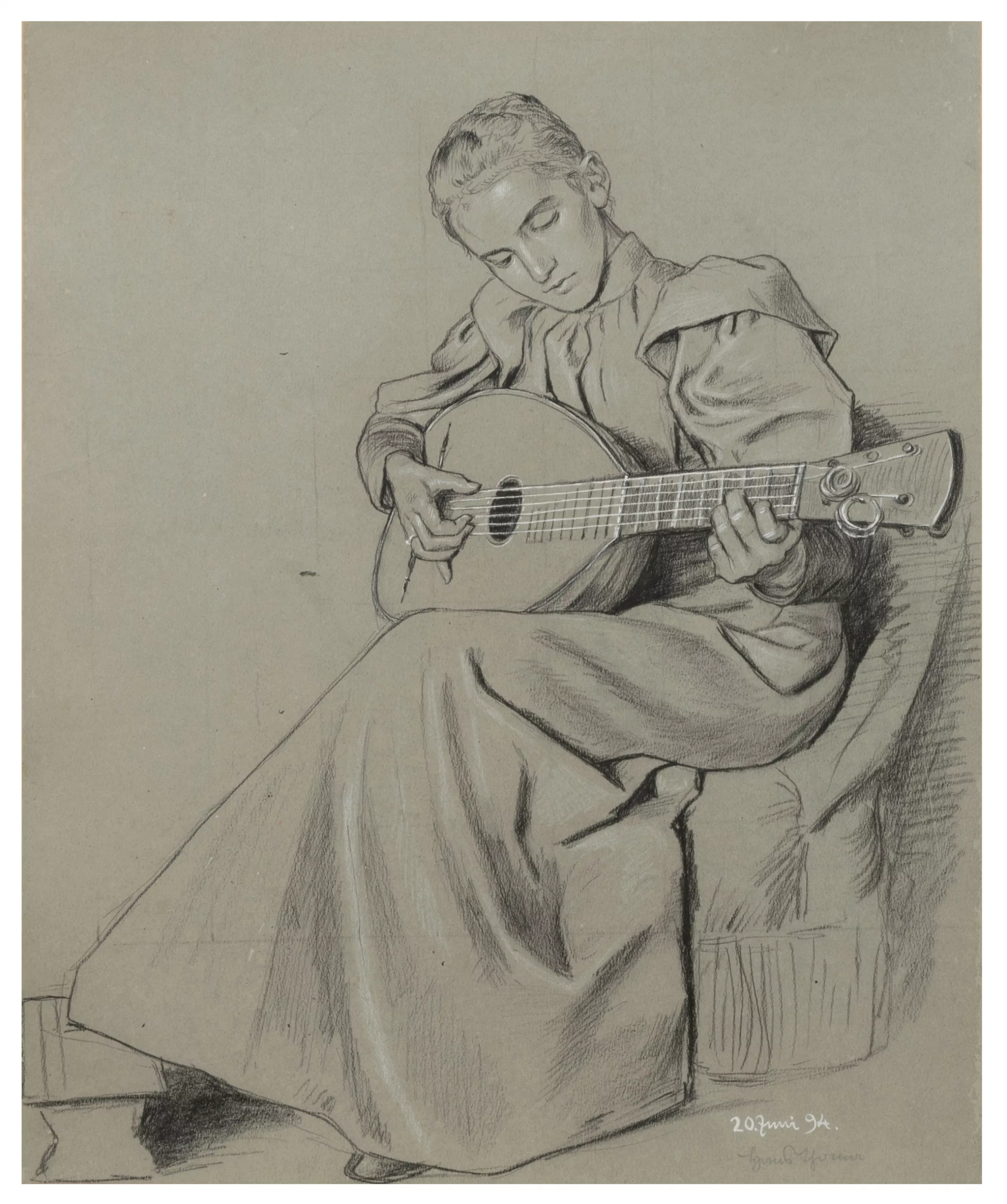Female lute player, graphite on light cardboard, 51 cm x 43 cm sheet dimensions, signed, dated 20 June 94, mounted, partial superficial paper abrasion, small tear in lower area, minimal staining