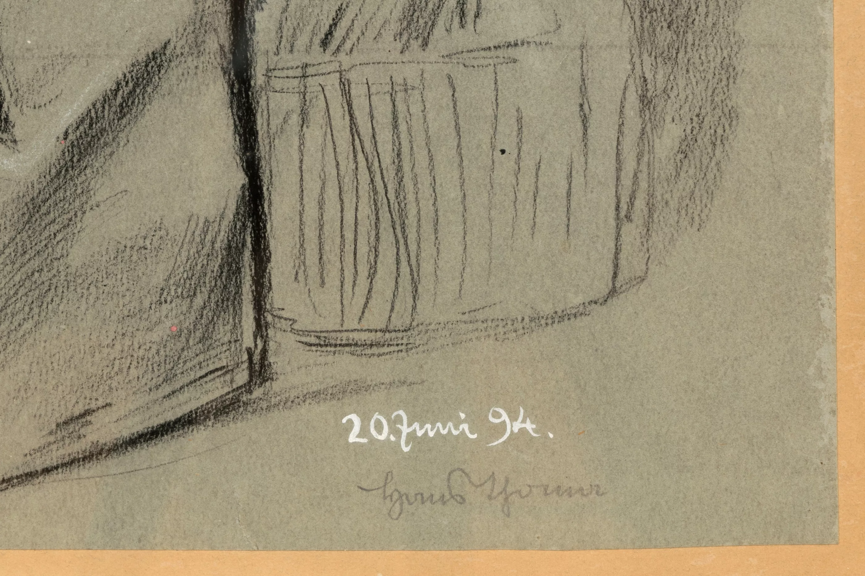 Lautenspielerin, Graphit auf leichtem Karton, 51 cm x 43 cm Blattmaß, signiert, 20. Juni 94 datiert, montiert, partiell oberflächlicher Papierabrieb, kleiner Einriss im unteren Bereich, minimal stockfleckig