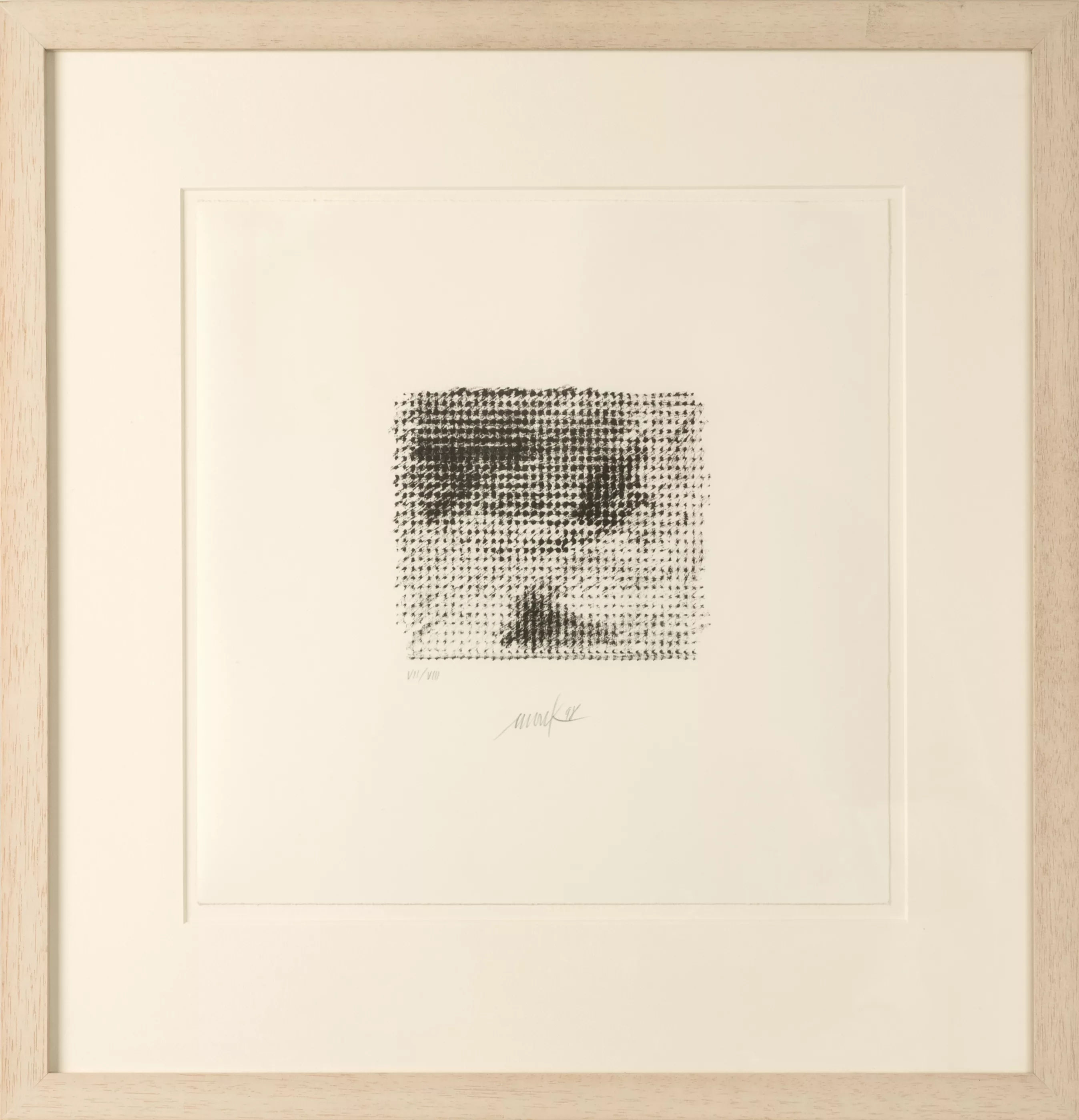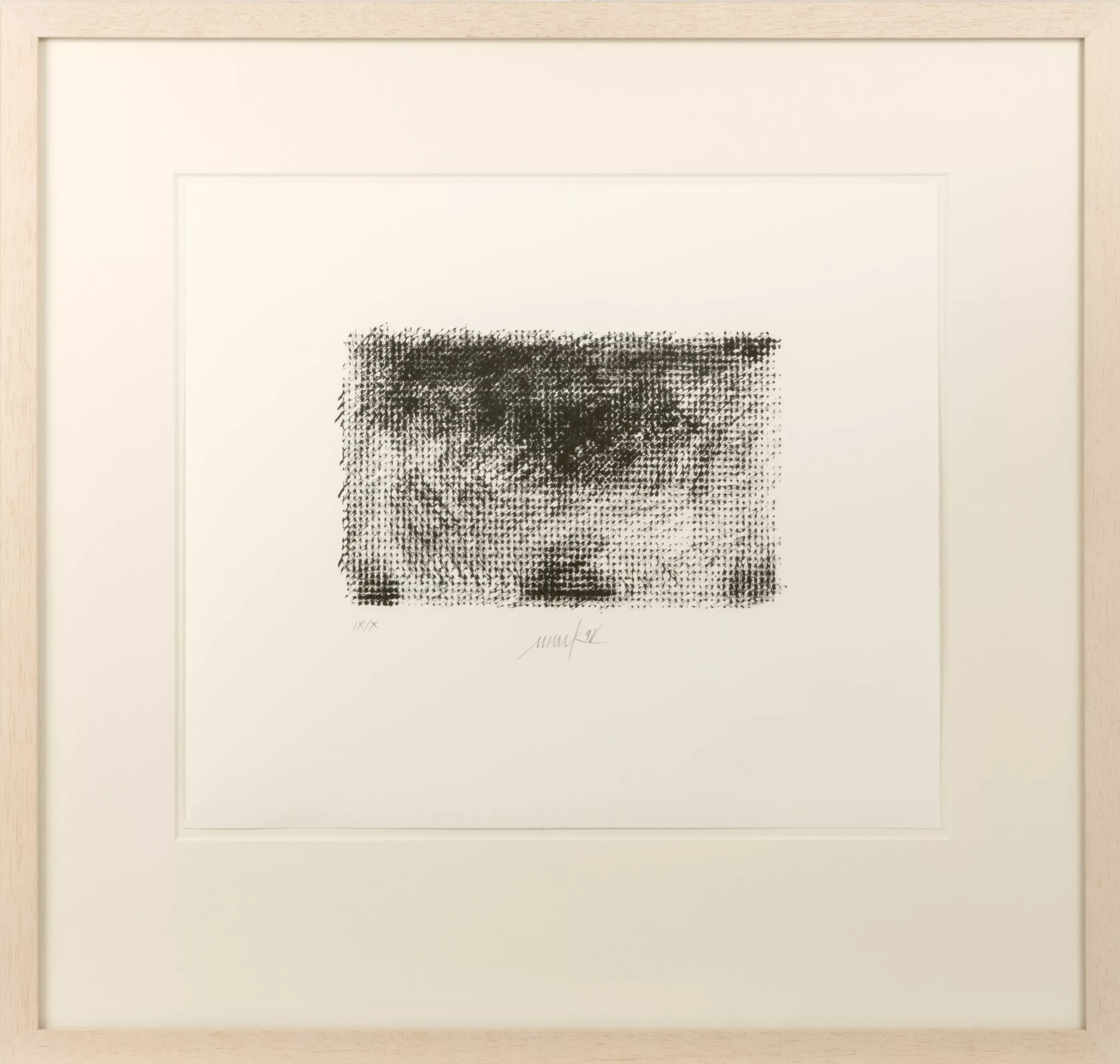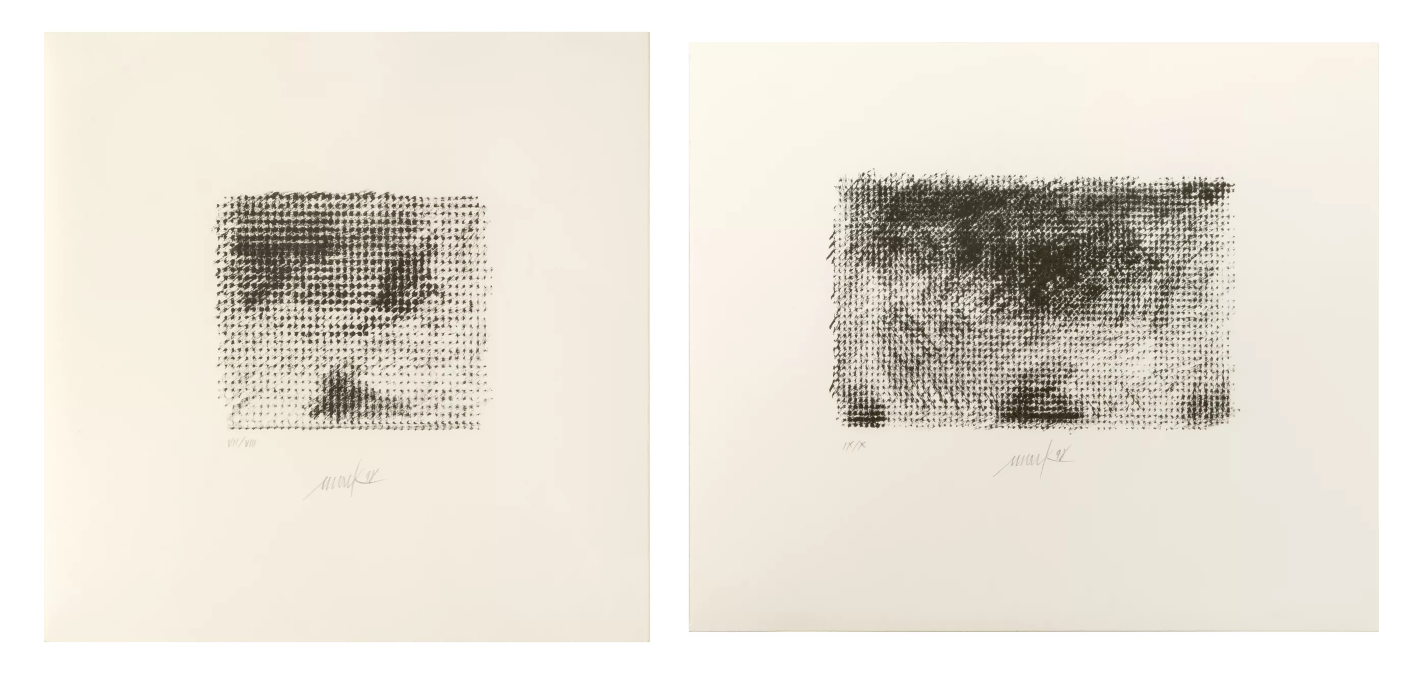 Kleines und großes schwarz-weiß Raster, zwei Grafiken, jeweils Lithografie auf Velin, kleines schwarz-weiß Raster 29 cm x 28,5 cm Blattmaß, signiert, 98 datiert, VII/VIII nummeriert, großes schwarz-weiß Raster 35 cm x 41 cm Blattmaß, signiert, 98 datiert, IX/X nummeriert, jeweils montiert
