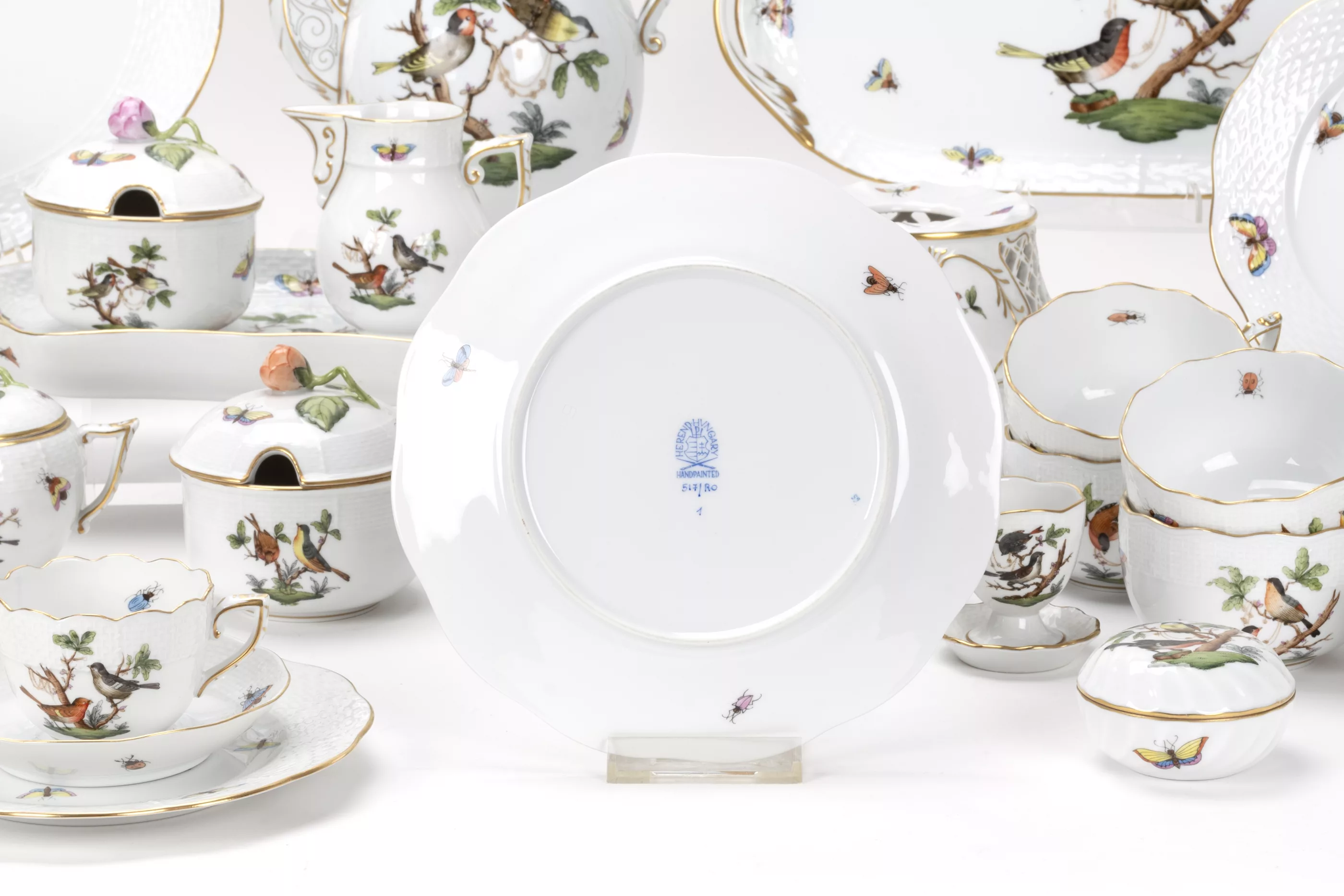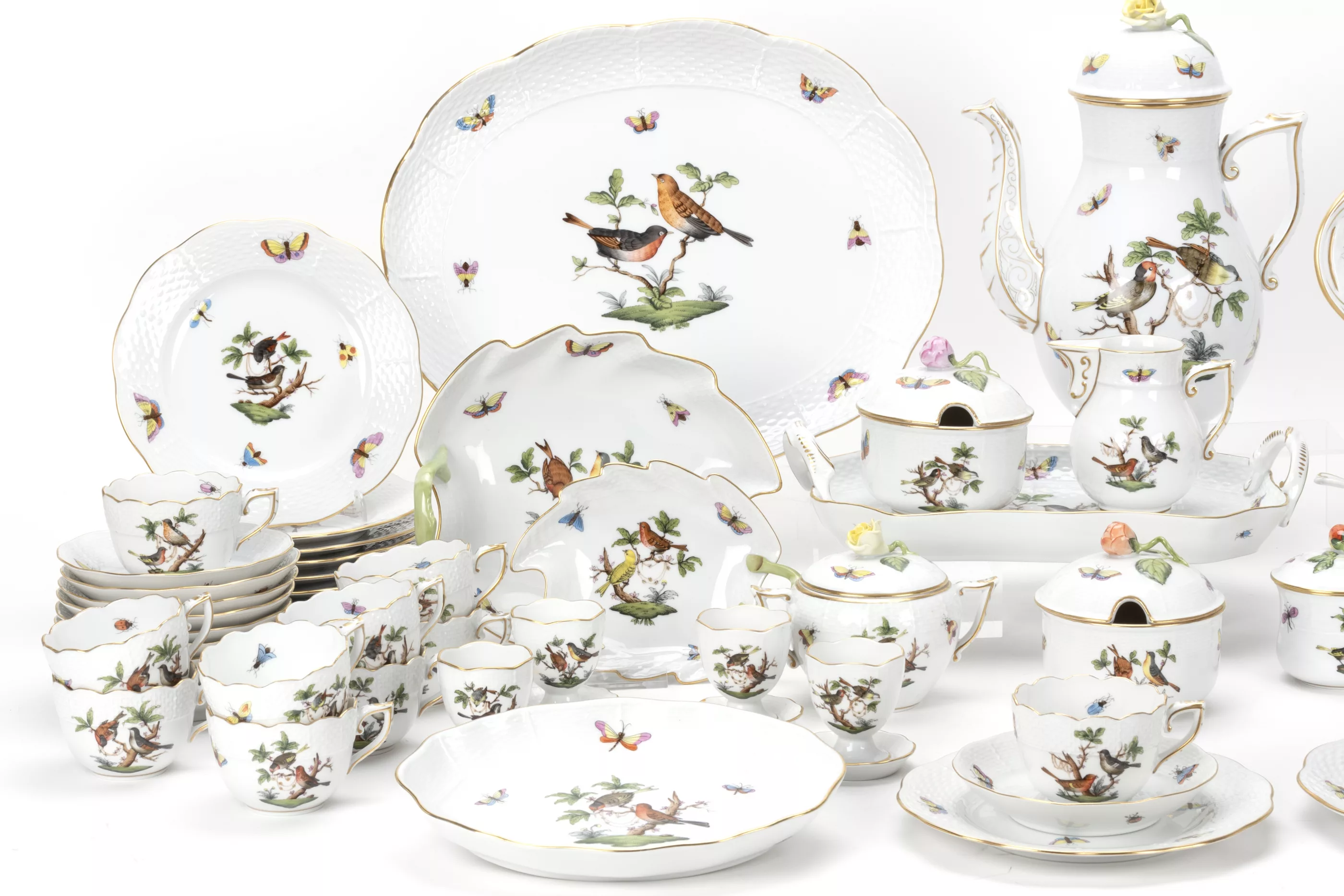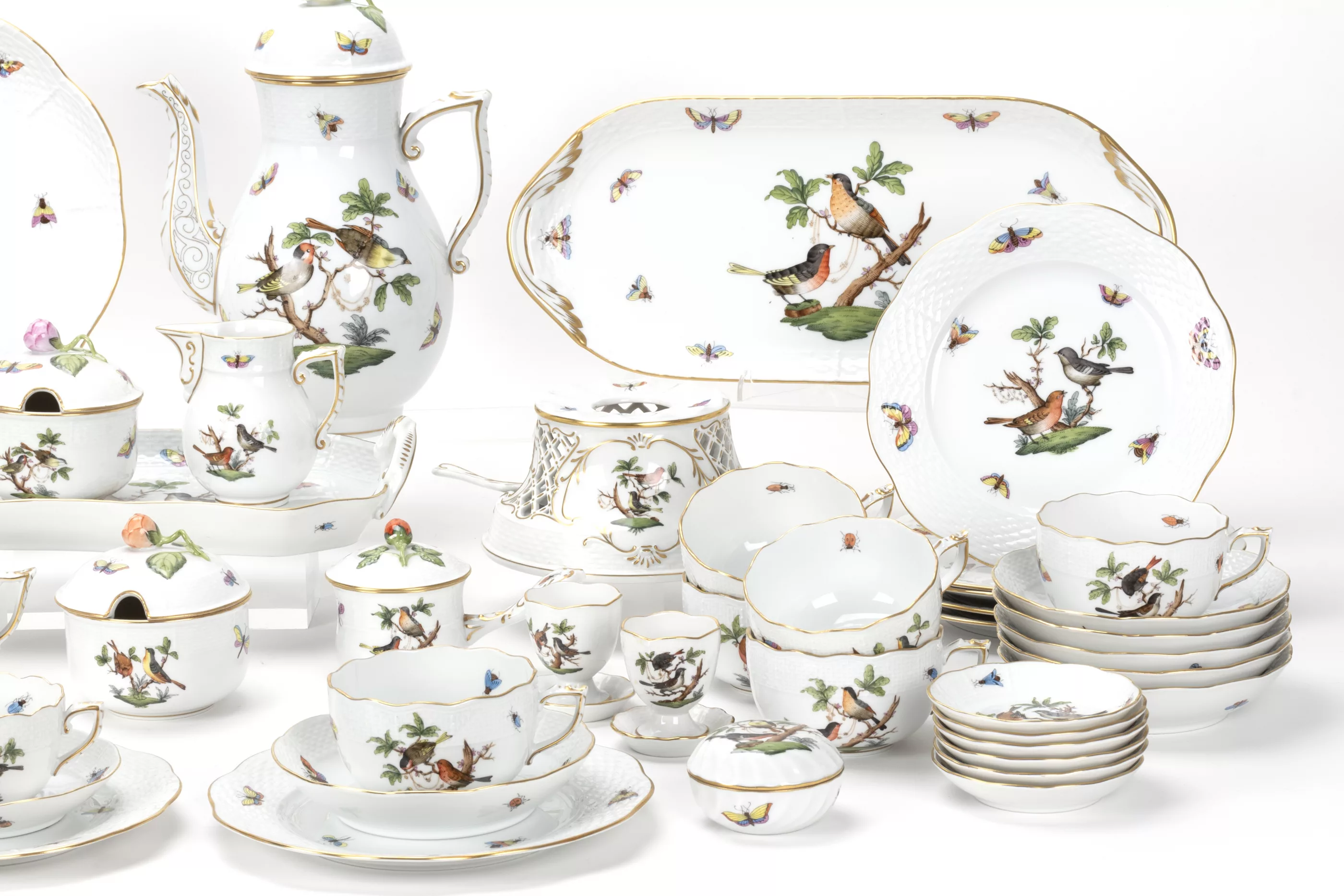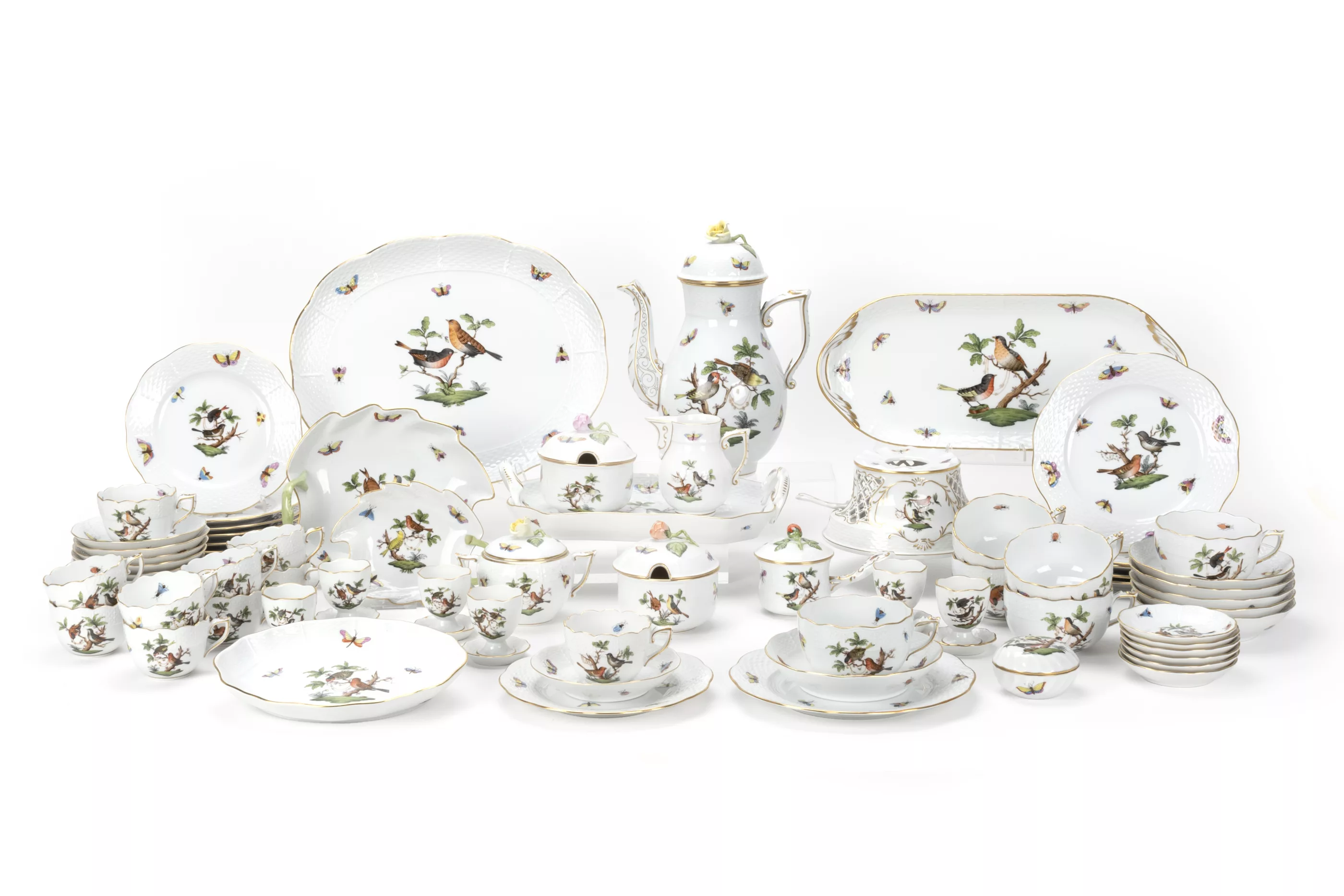 73 pcs, Herend, Hungary, mid/late 20th century, porcelain, white, color painted and gold painted, 1 coffee pot, h 26 cm, 6 teacups, 6 saucers, 3 sugar bowls, 1 milk jug, h 9 cm, 1 cream jug, 6 egg cups, h 5.5 cm, 6 cl. chocolate bowls, Ø 9.2 cm, 1 teapot, h 7.5 cm, 6 breakfast or cake plates, Ø 18.7 cm, 10 demitasse cups, 10 saucers, 10 pastry or cake plates, Ø 16.5 cm, 2 leaf bowls, 1 small lidded jar, 1 small oval bowl, 1 small oval dish, Ø 16.5 cm. lidded box, 1 small oval bowl, 1 oblong cake plate, l 36 cm, 1 large oval cake plate and 1 pastry plate with handles, l 27 cm, all pieces with maker's mark, painter's mark and model number, condition A/B, one mocha saucer with hairline crack
