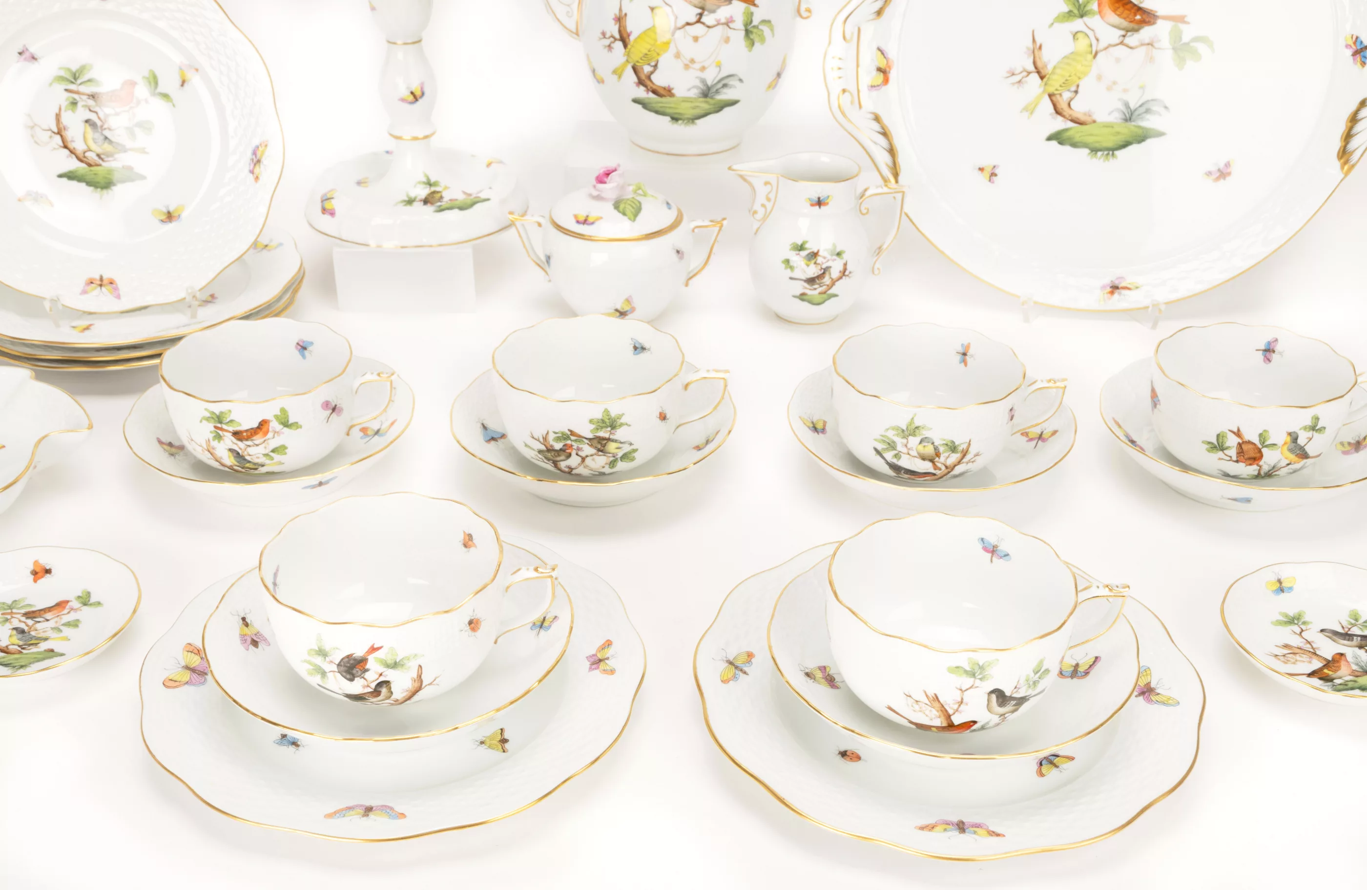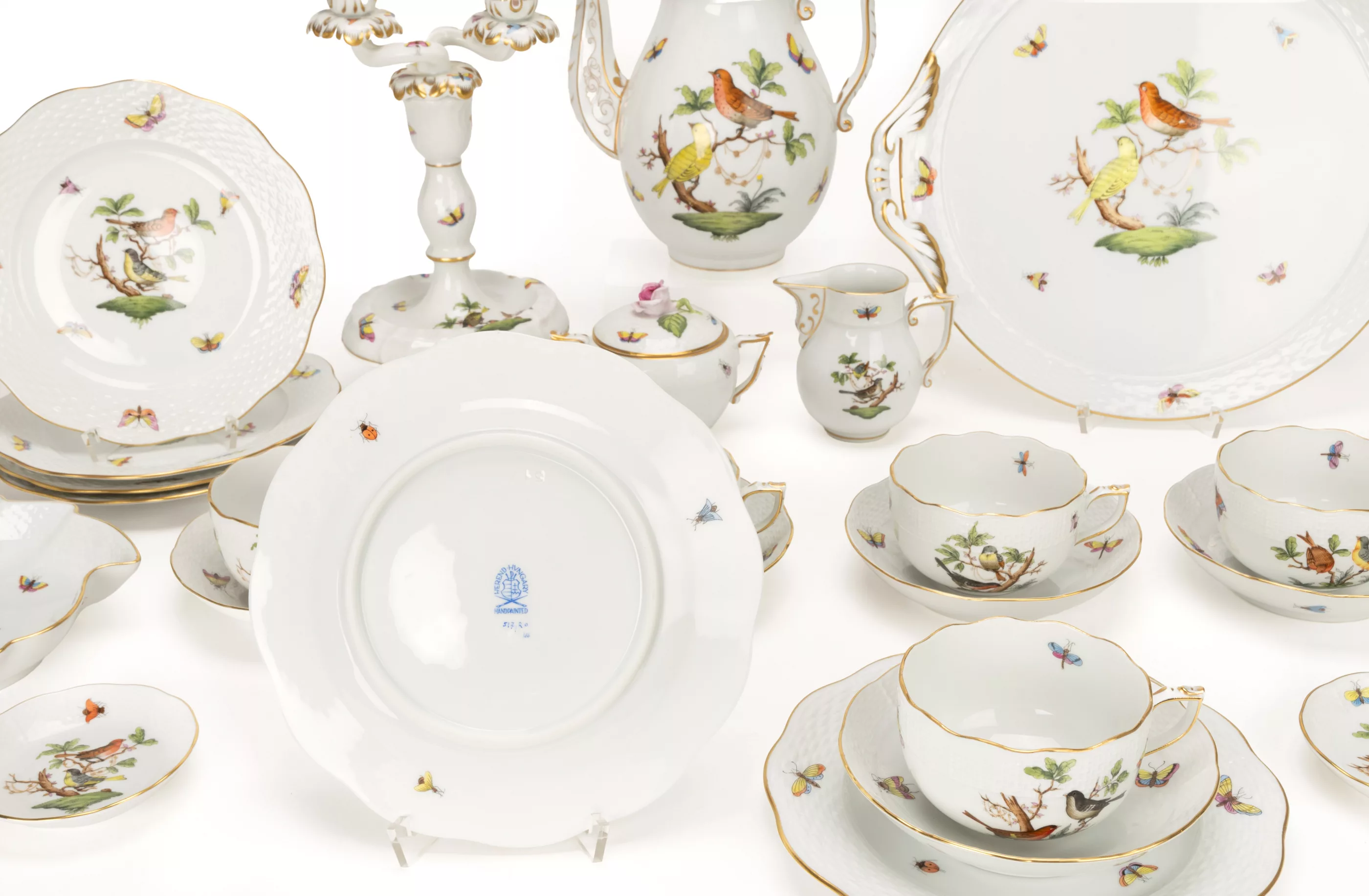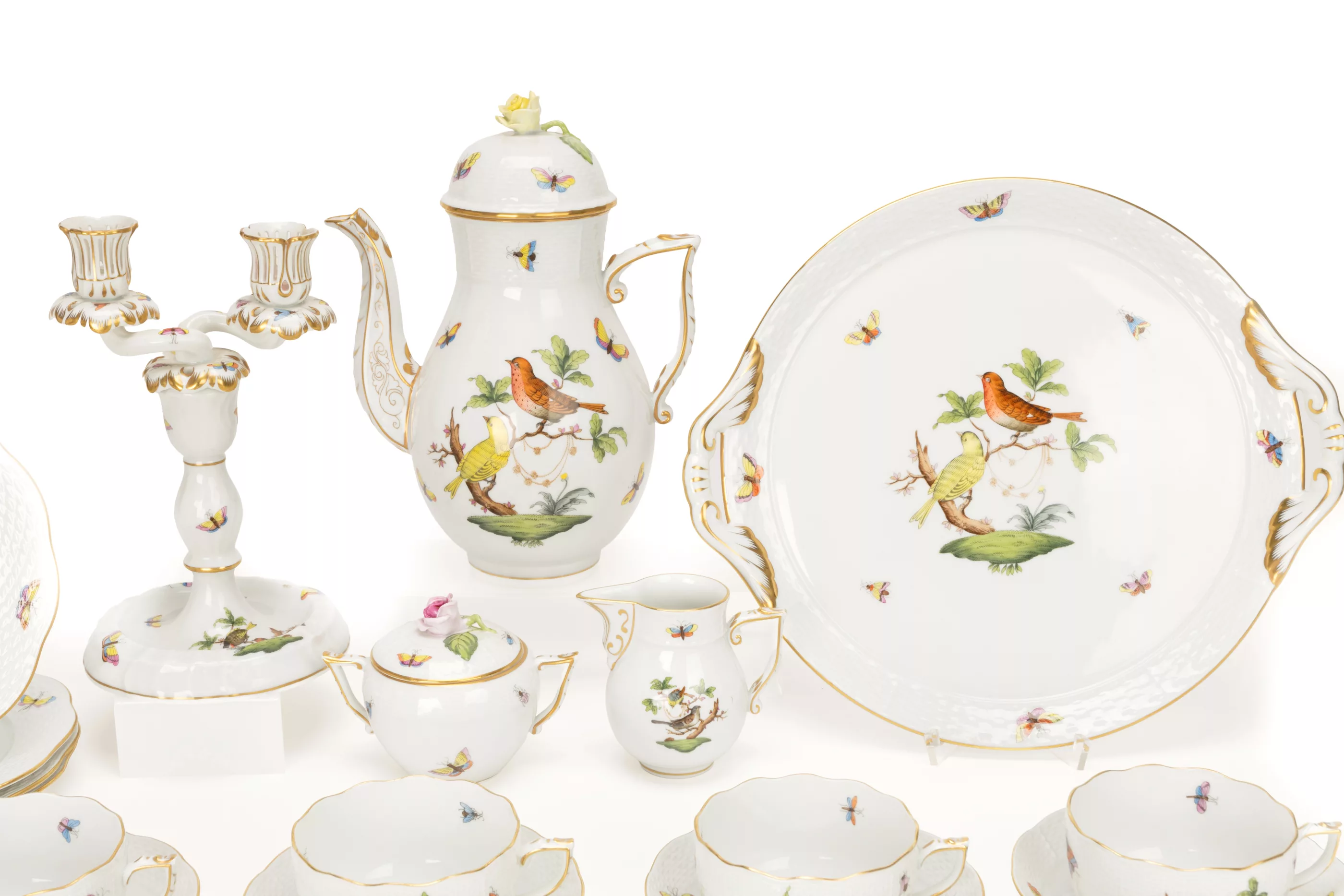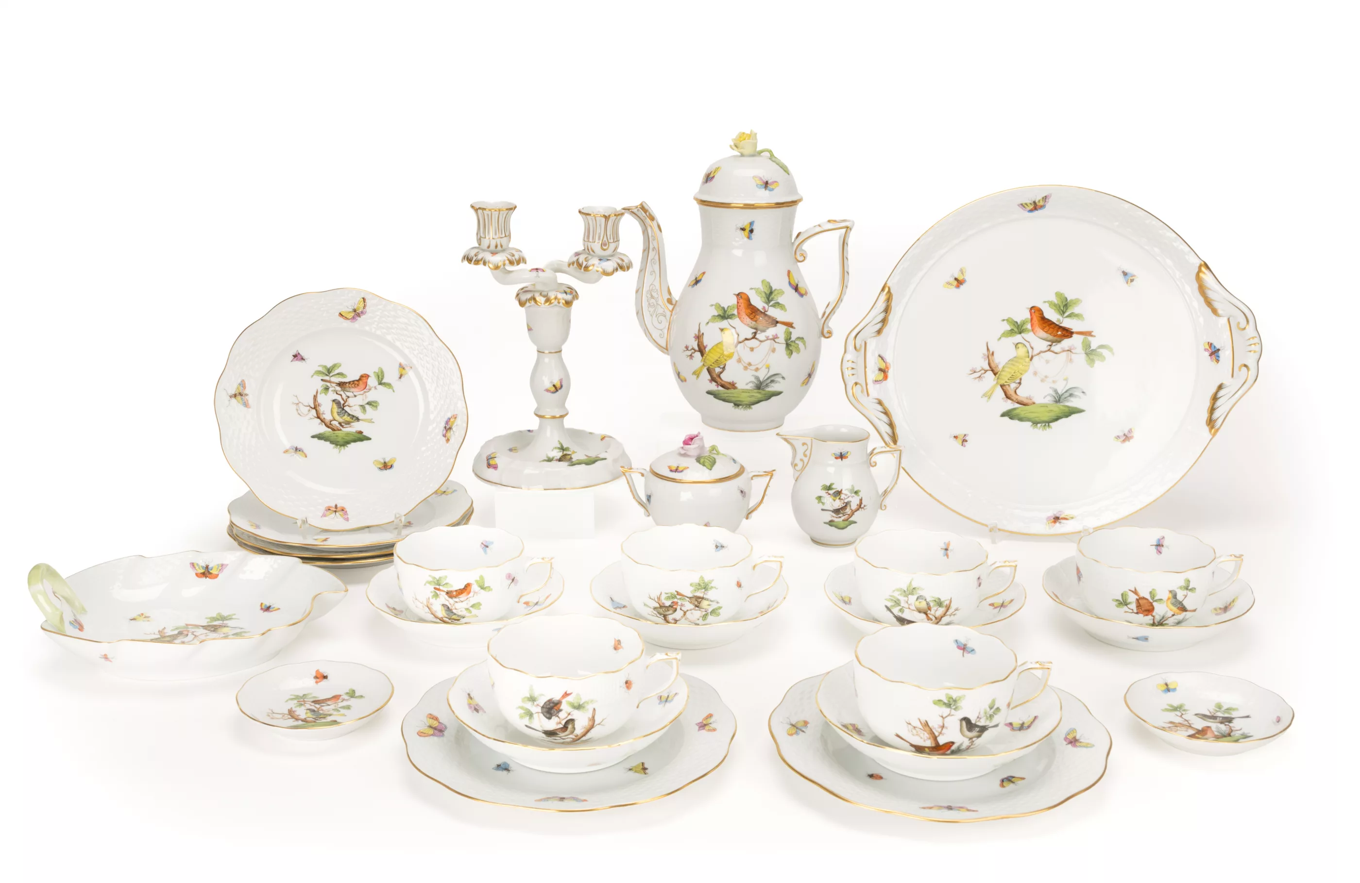 26-tlg., Herend, Ungarn, 20. Jh., Porzellan, weiß, polychrom bemalt und gold staffiert, 1 Kaffeekanne, H 25,5 cm, 1 Milchkännchen, 1 Zuckerdose mit Deckel, 6 Kaffeetassen und 6 Untertassen, 6 Gebäckteller, Ø 19 cm, 2 kleine Schälchen, Ø 9 cm, 1 Platte, Ø 28,5 cm, 1 Schale in Blattform, L 18 cm, 1 zweiflammiger Kerzenleuchter, H 22 cm, alle Teile unterseitig mit Manufakturmarke, Malermarke und Modellnummer, Zustand A/B
