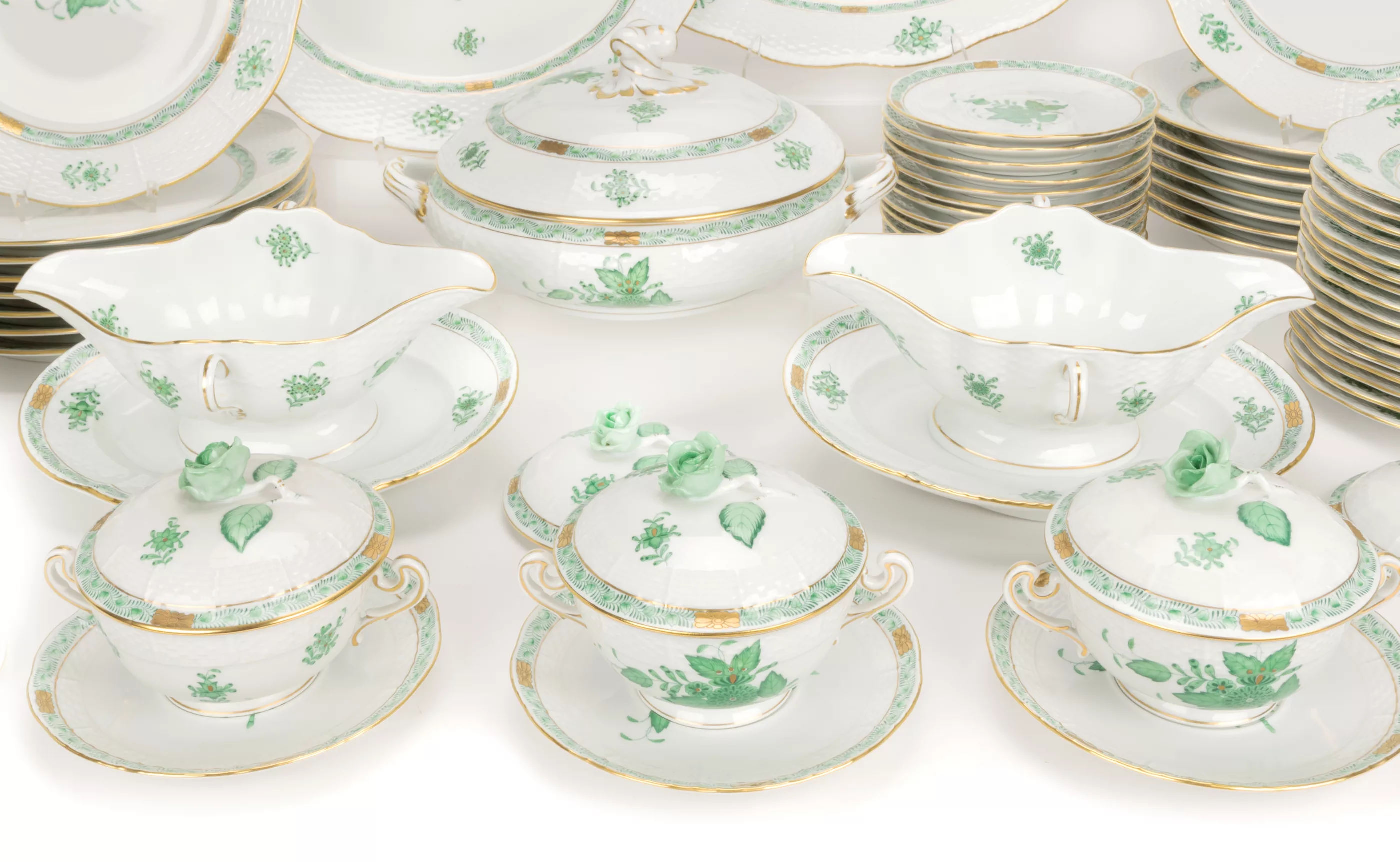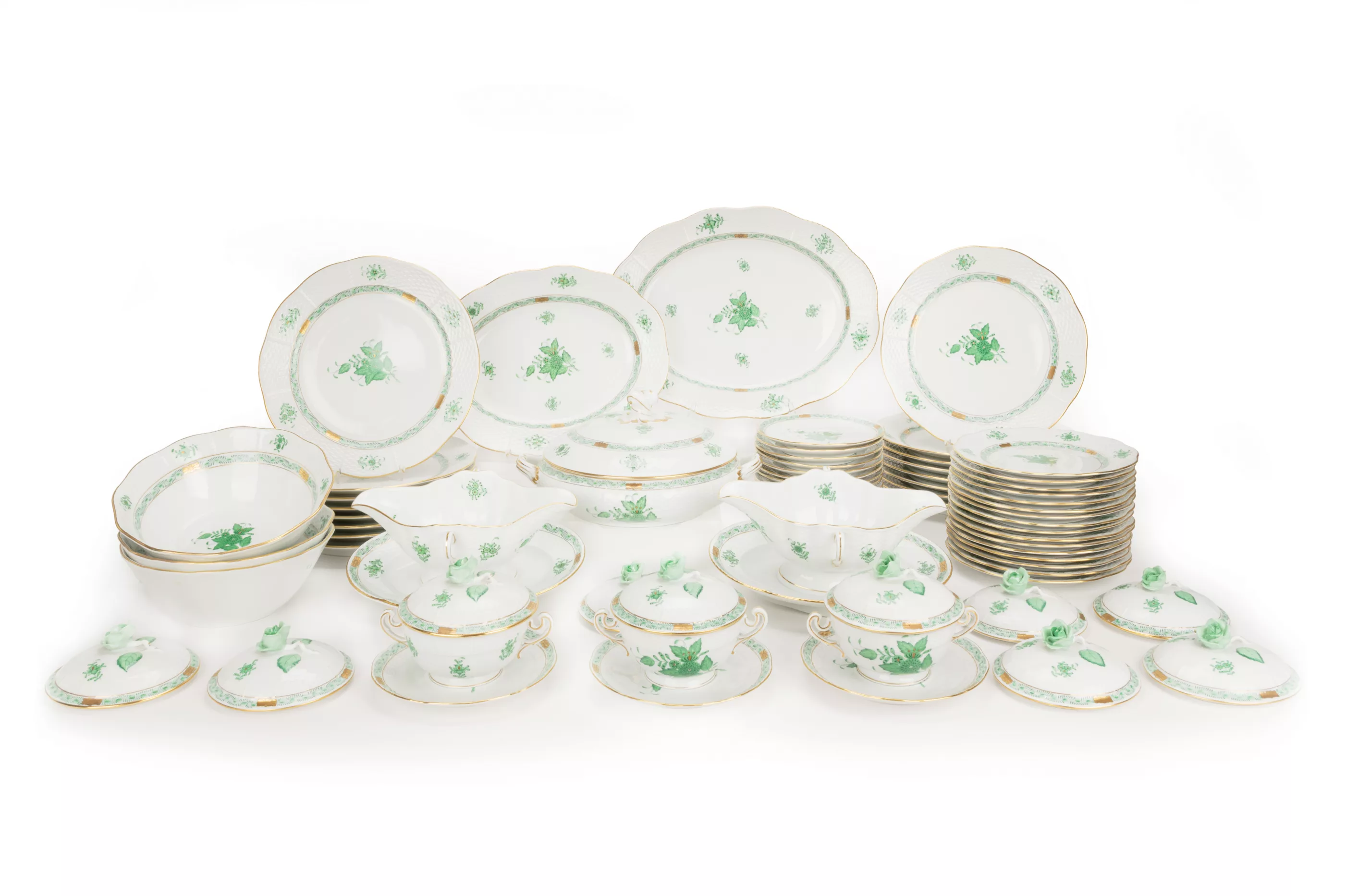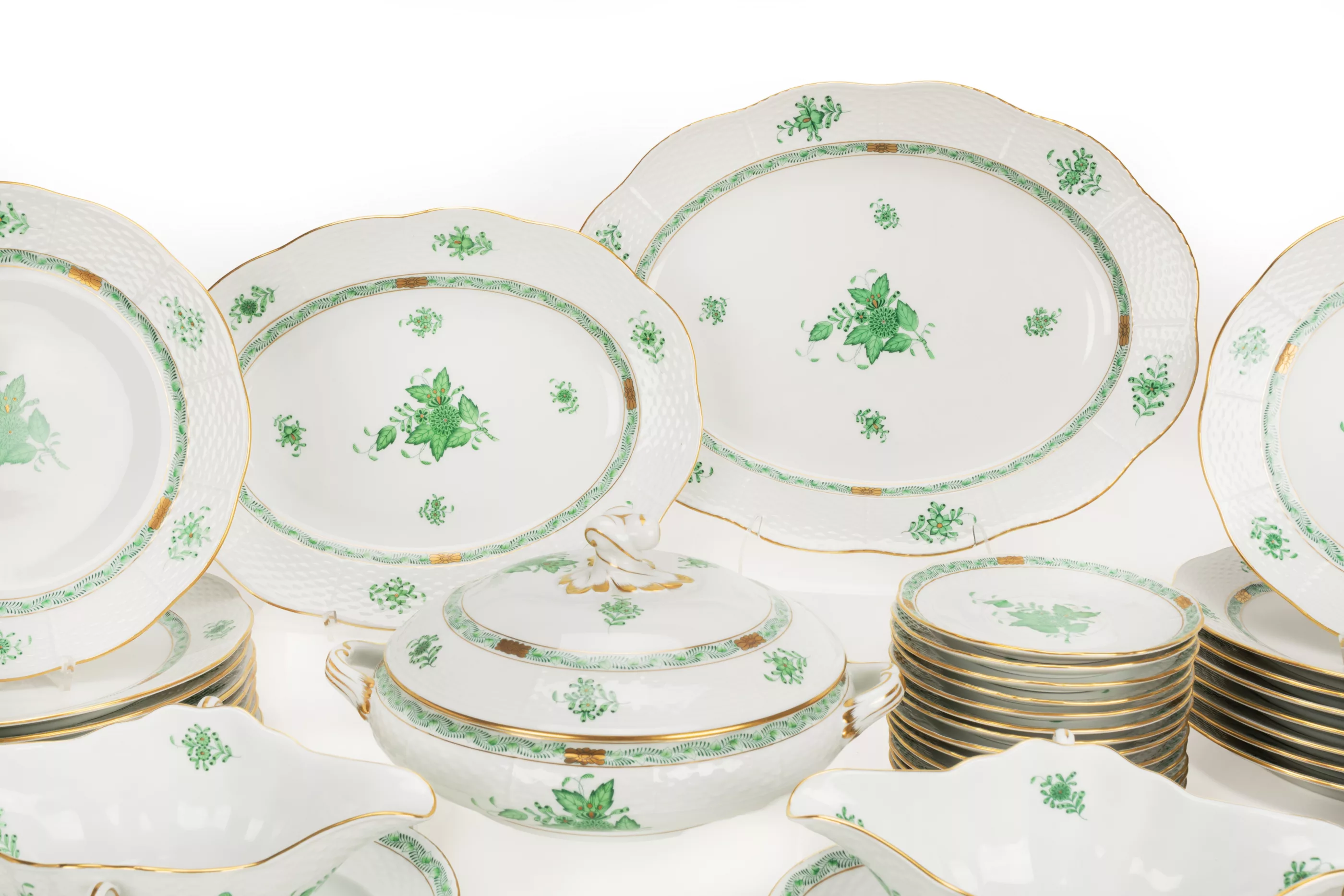 74-tlg., Herend, Ungarn, Mitte/Ende 20. Jh., Porzellan, weiß, grün bemalt, gold staffiert, 16 Speiseteller, Ø 25 cm, 16 Vorspeiseteller, Ø 18,5 cm, 2 Vorlegeplatten, L 31 cm und 36,7 cm, 1 Suppenterrine, L 28,5 cm, H 13 cm, 2 Saucieren, L 23 cm, 3 Vorlegeschüsseln, Ø 20 cm, 16 Suppendeckeltassen, 16 Suppenuntertassen, 2 kleine Langhalsvasen, H 13 cm, Manufakturmarke, teilweise Pressnummern und Malermarke, Zustand B