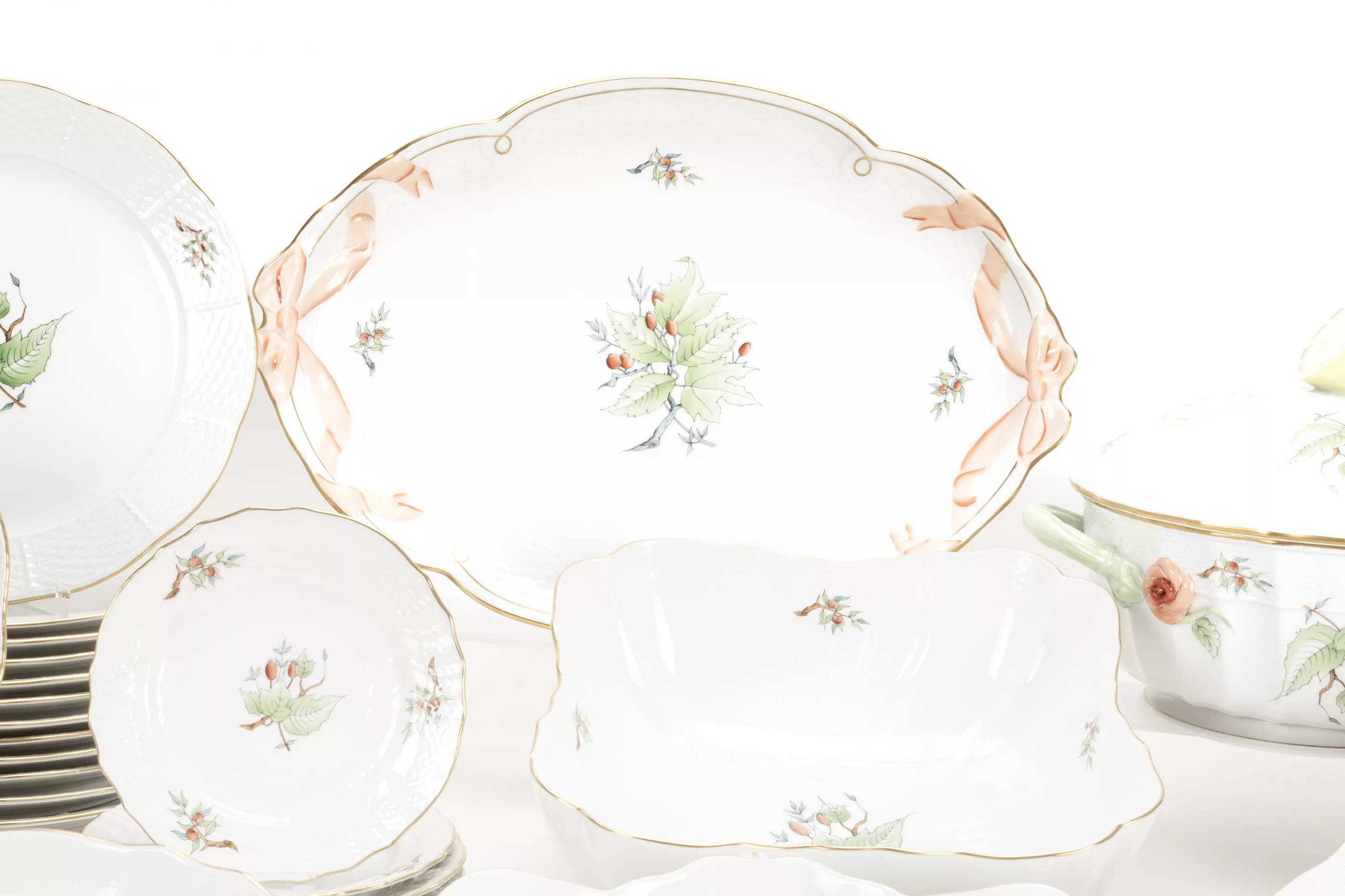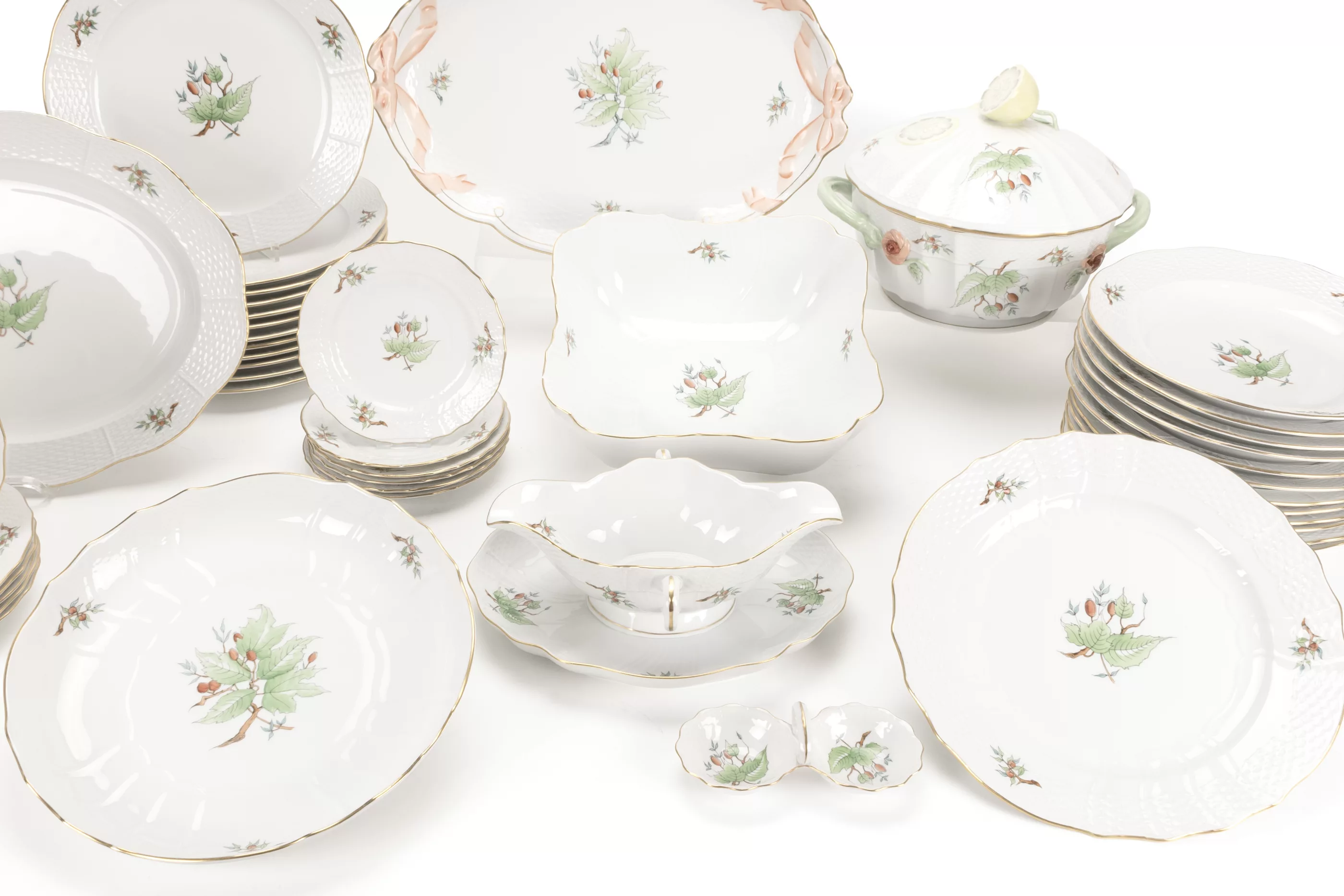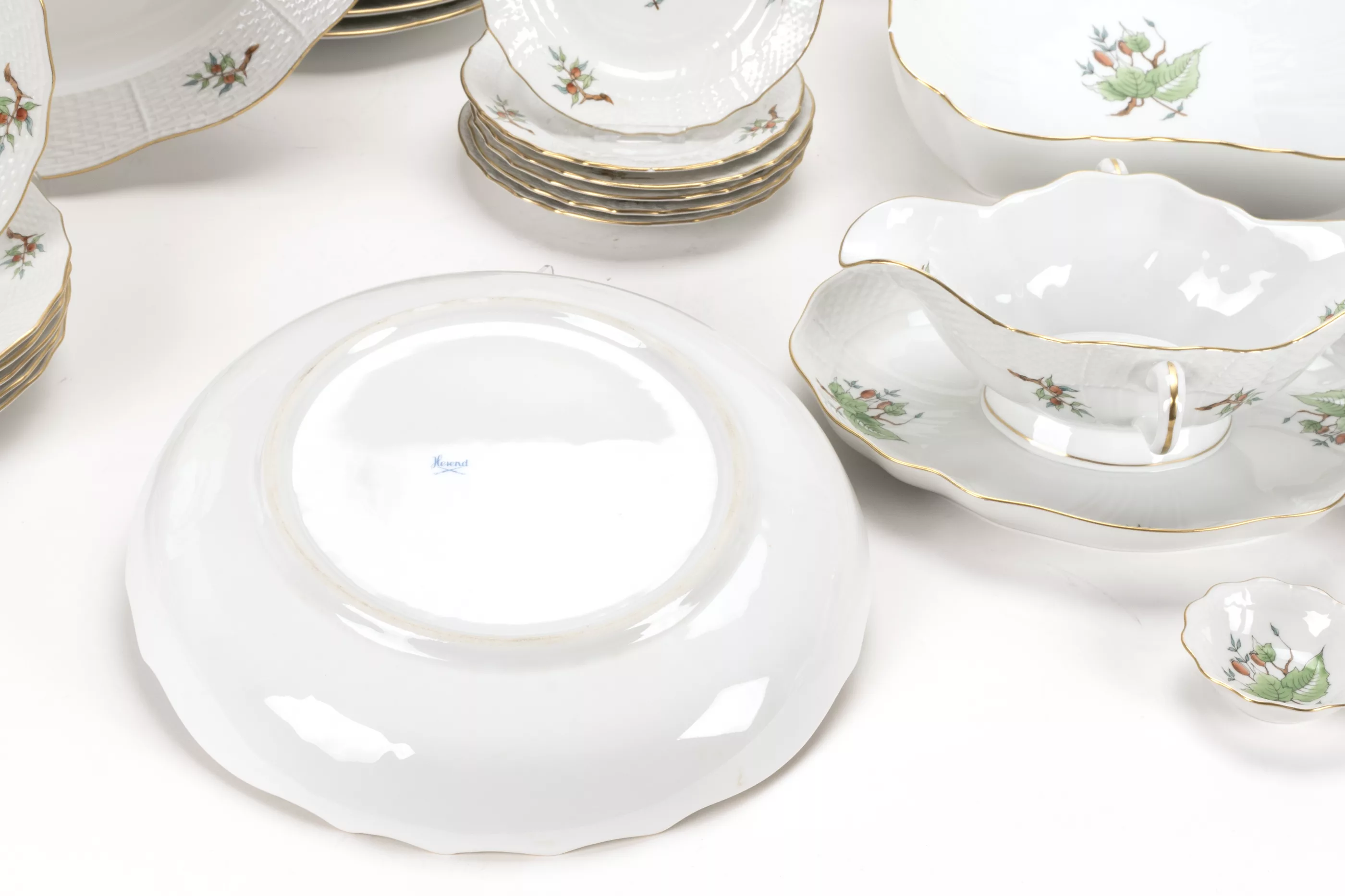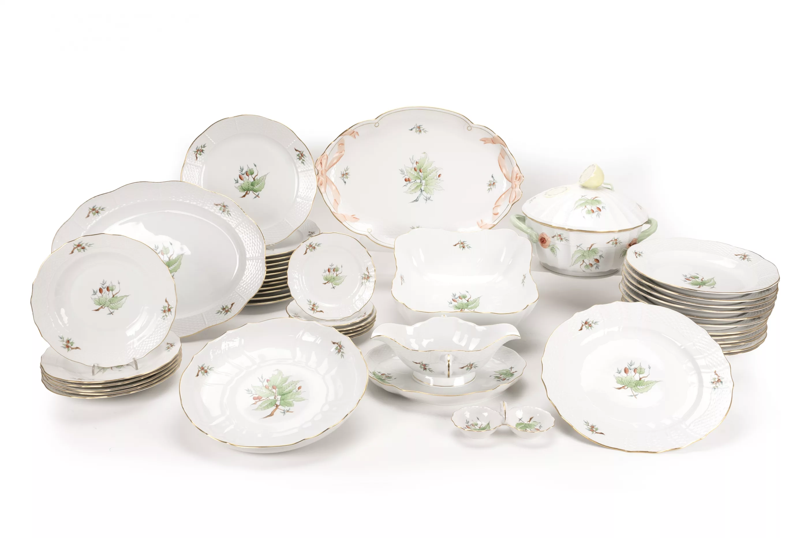 44-tlg., Herend, Ungarn, Mitte/Ende 20. Jh., Porzellan, weiß, farbig bemalt und gold staffiert, 12 Speiseteller, Ø 25,5 cm, 6 Brotteller, Ø 15,5 cm, 6 Vorspeiseteller, Ø 21 cm, 6 Suppenteller, 6 tiefe Teller, 2 runde Vorlegeplatten, 26,5 und 27,5 cm, 1 Sauciere, L 26,5 cm, 2 ovale Vorlegeplatten, davon 1 mit Schleifen-Handhaben, L 36,5 und 40,5 cm, 1 quadratische Vorlegeschüssel, 25,5 x 25,5 cm, 1 Saliere, L 15 cm, 1 Deckelterrine mit Zitronenknauf, H 21 cm, Manufakturmarke, Malermarken, Modellnummern, Zustand B