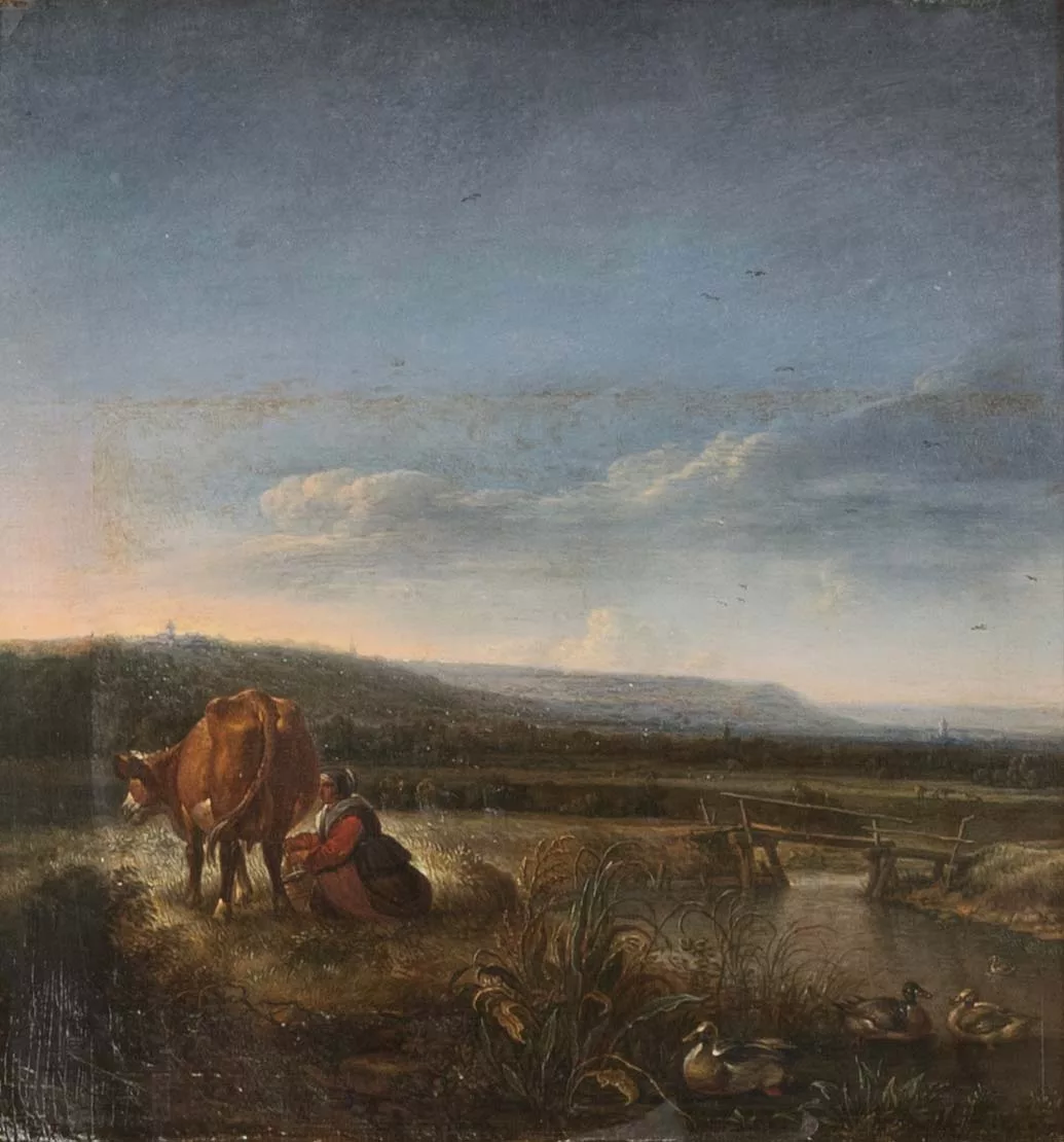Idyllic Pasture Landscape with Animals, oil on wood, parquetted, 29.5 cm x 25.5 cm object dimensions, signed, dated 1679, slightly rubbed, scratches in places, partially retouched