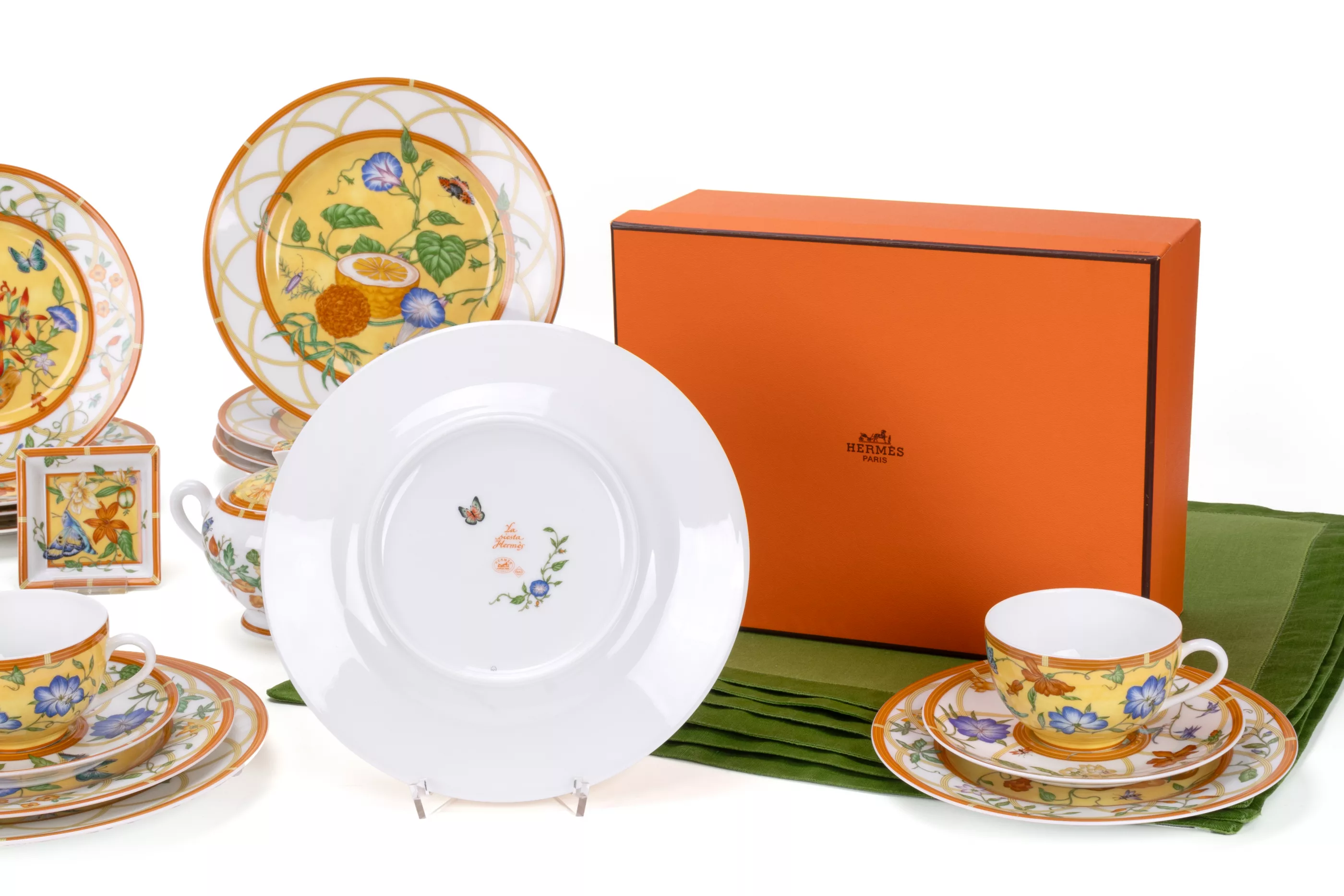 28 pcs, Hermès, France, late 20th century, porcelain, white, hand-applied screen-printed decoration, 6 cups and 6 saucers, height 6.3 cm, 6 cake plates, Ø 19.5 cm, 6 dessert plates, Ø 21 cm, 1 sugar bowl, height 10 cm, 1 milk jug, height 9 cm, 2 bridge ashtrays, 8 x 8 cm, all with manufactory mark and inscription on the underside, condition A, all items with original box, with booklet and fabric placemats in green by Hermès