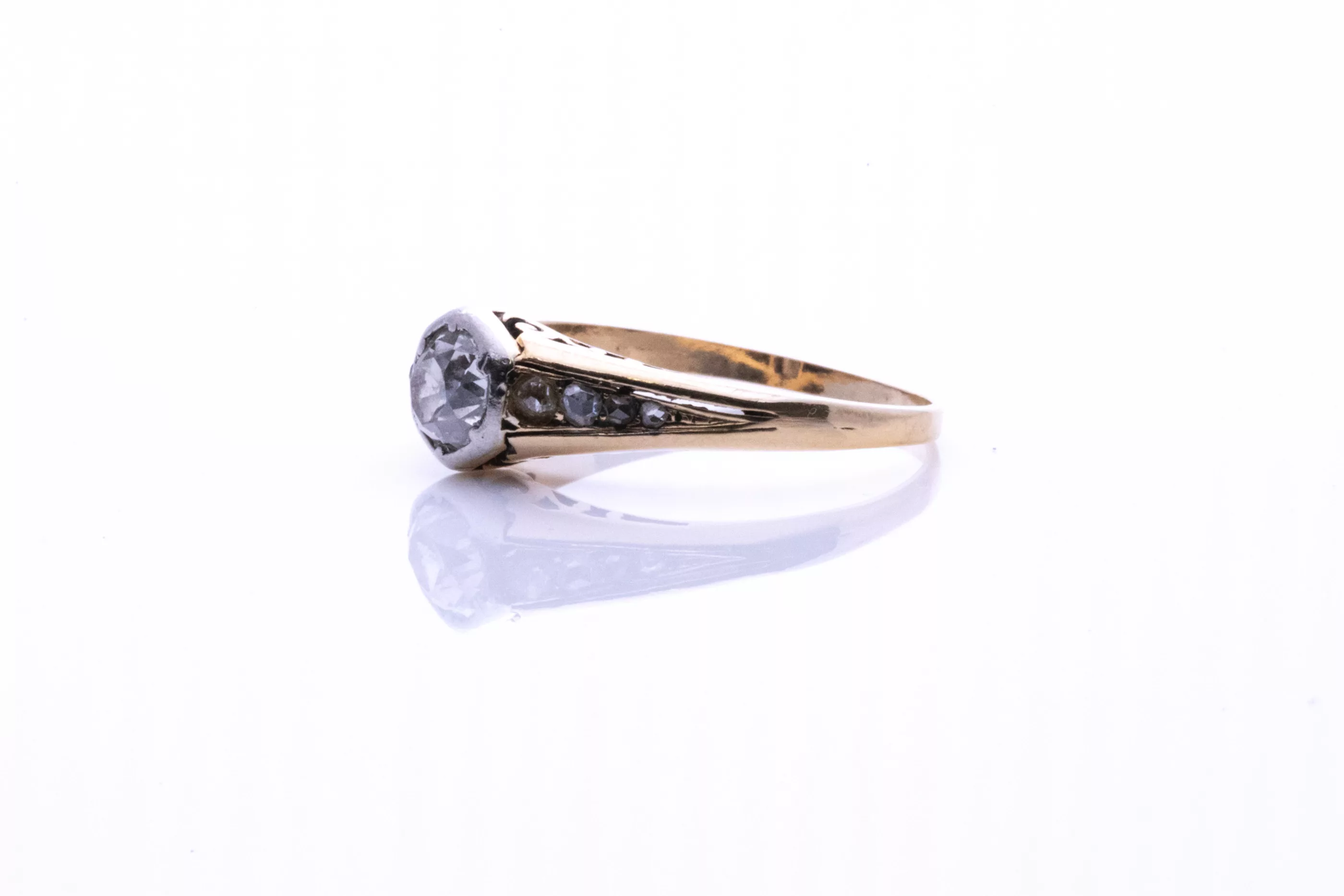 585 Gelbgold, geprüft, partiell rhodiniert, Diamant im Alt-Schliff, ca. 0,75 ct, H, SI, umgeben von Diamanten im Alt-Schliff, sowie Diamantrosen unterschiedlicher Farbe und Reinheit, zus. ca. 0,12 ct, Ringgröße 59, Gesamtgewicht ca. 2,9 g