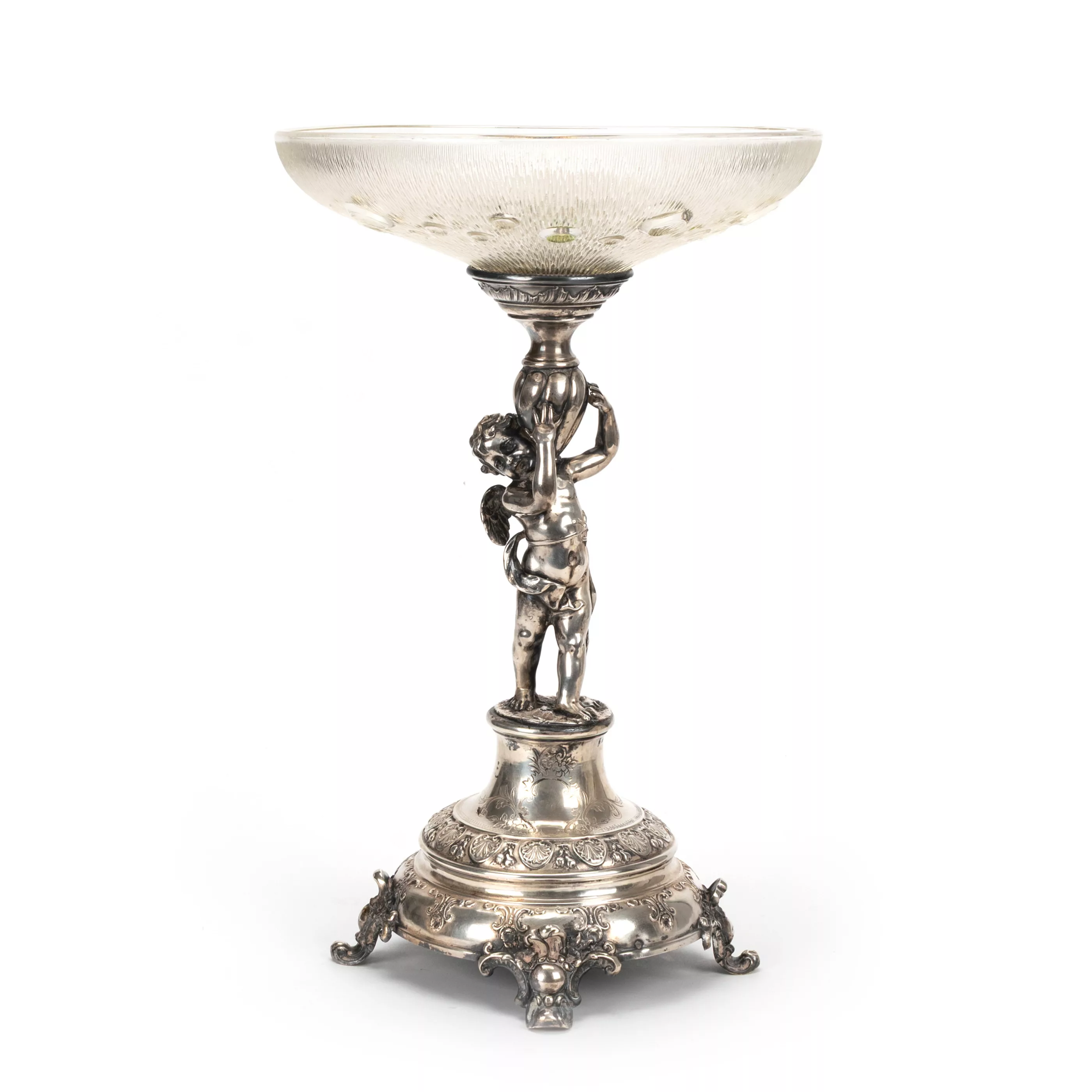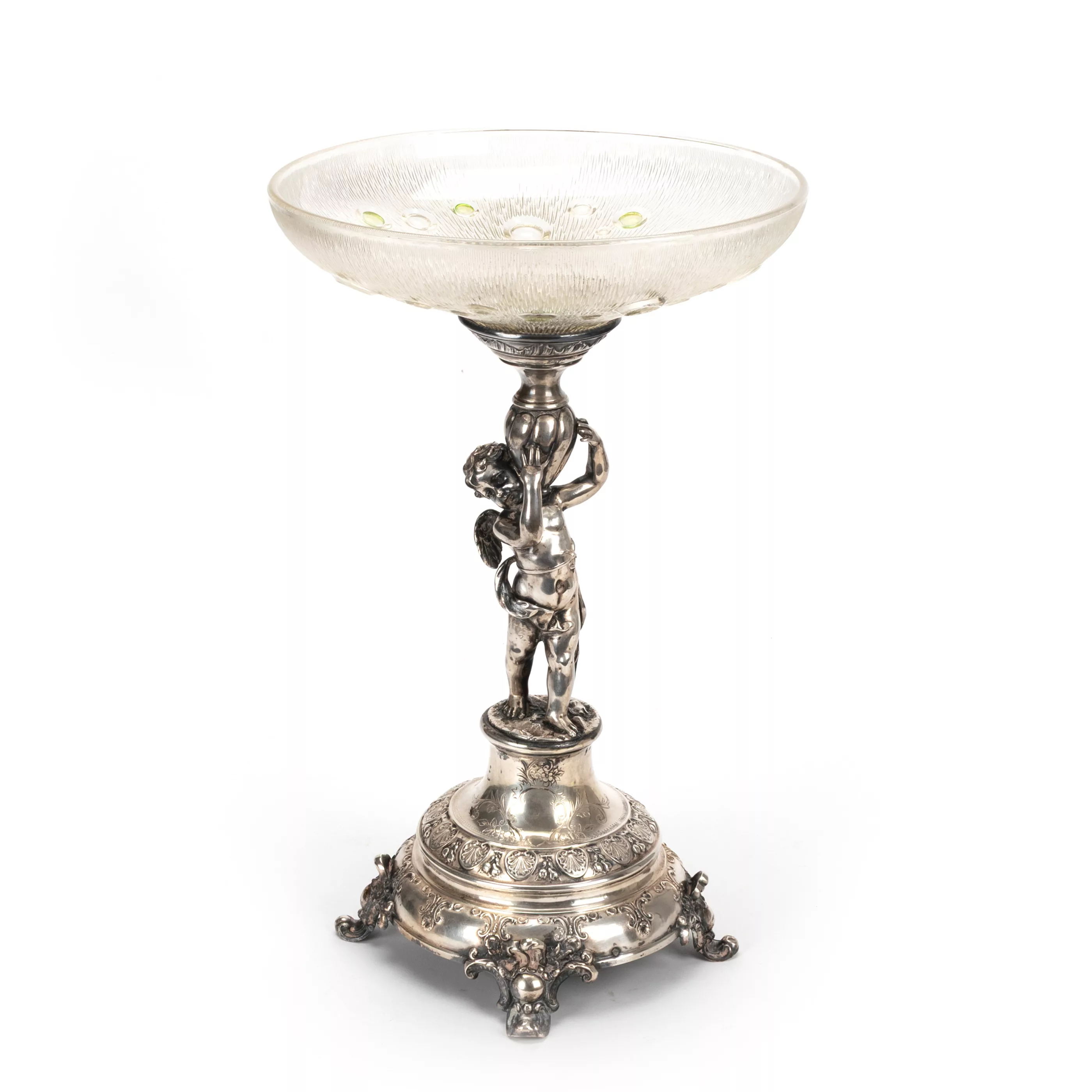 Circa 1900, silver, tested, round, stepped stand on 4 volute feet with rocaille and fruit border, floral decoration, narrow tapering shaft, above a putto figure carrying a glass bowl, fluted glass with bubble decoration, height 41 cm, partially tarnished