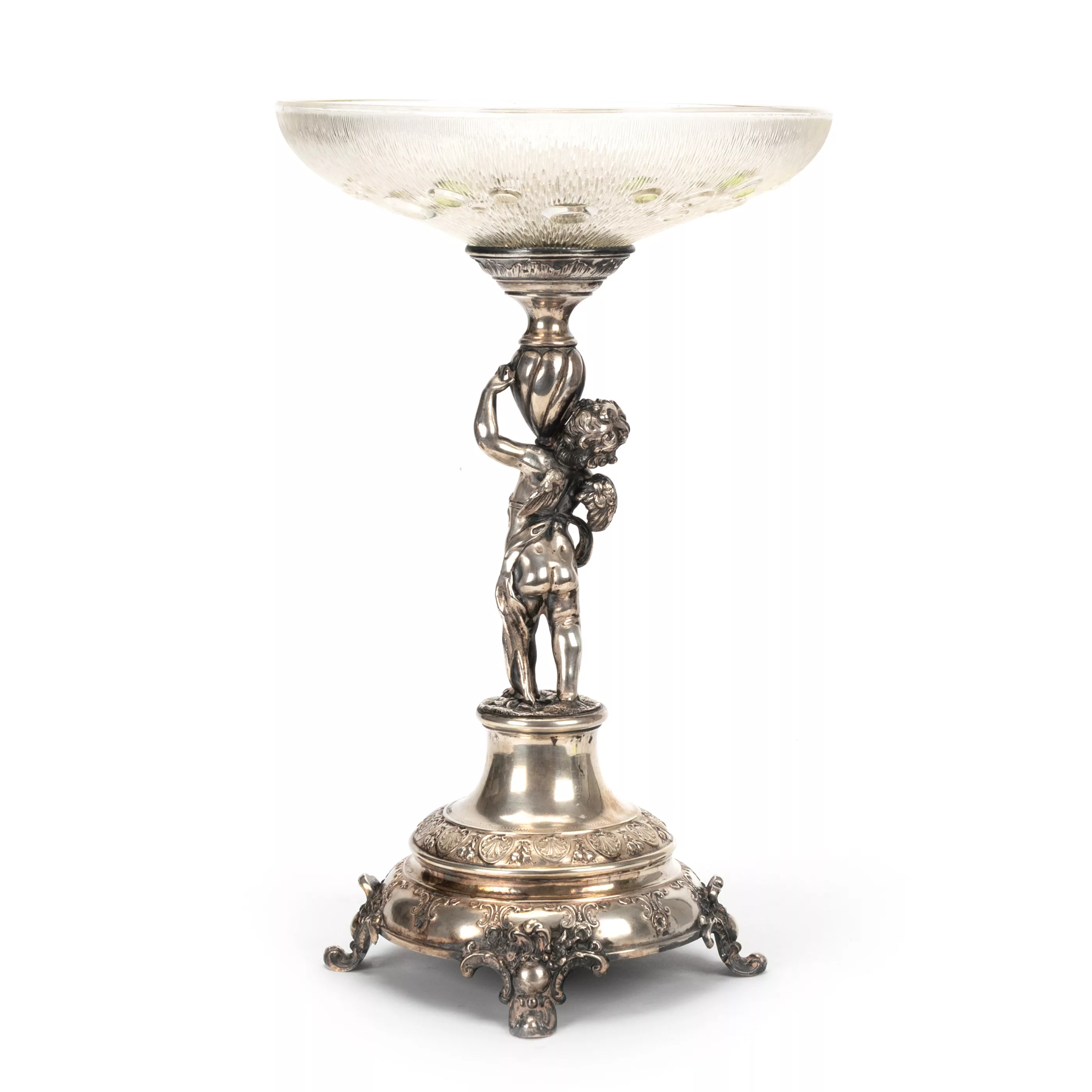 Um 1900, Silber, geprüft, runder, getreppter Stand auf 4 Volutenfüßen mit Rocaille- und Früchtebordüre, Blütendekor, schmal zulaufender Schaft, darüber Puttofigur, die eine Glasschale trägt, Glas geriffelt und mit Bläschendekor, Höhe 41 cm, partiell angelaufen