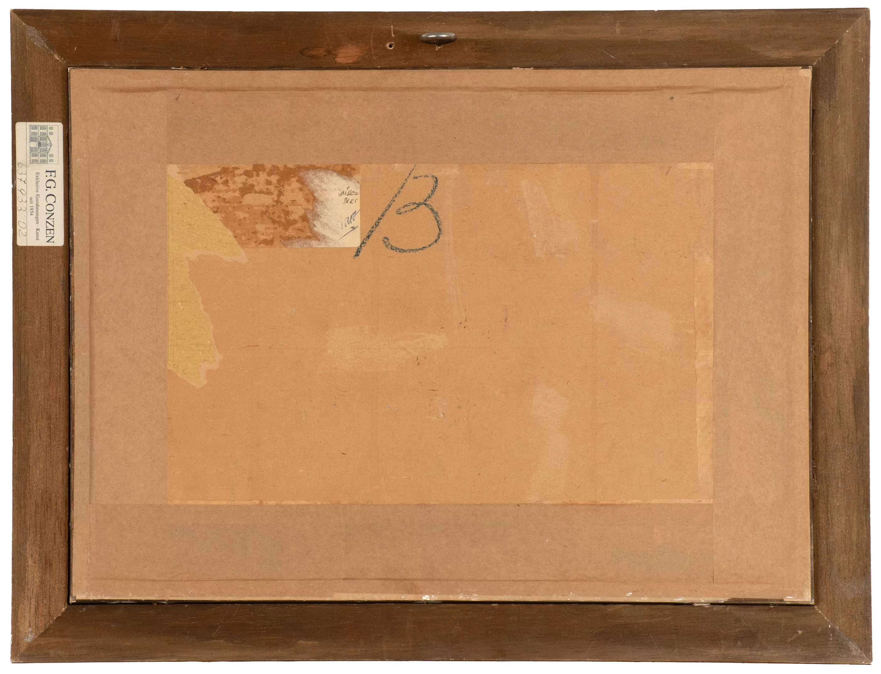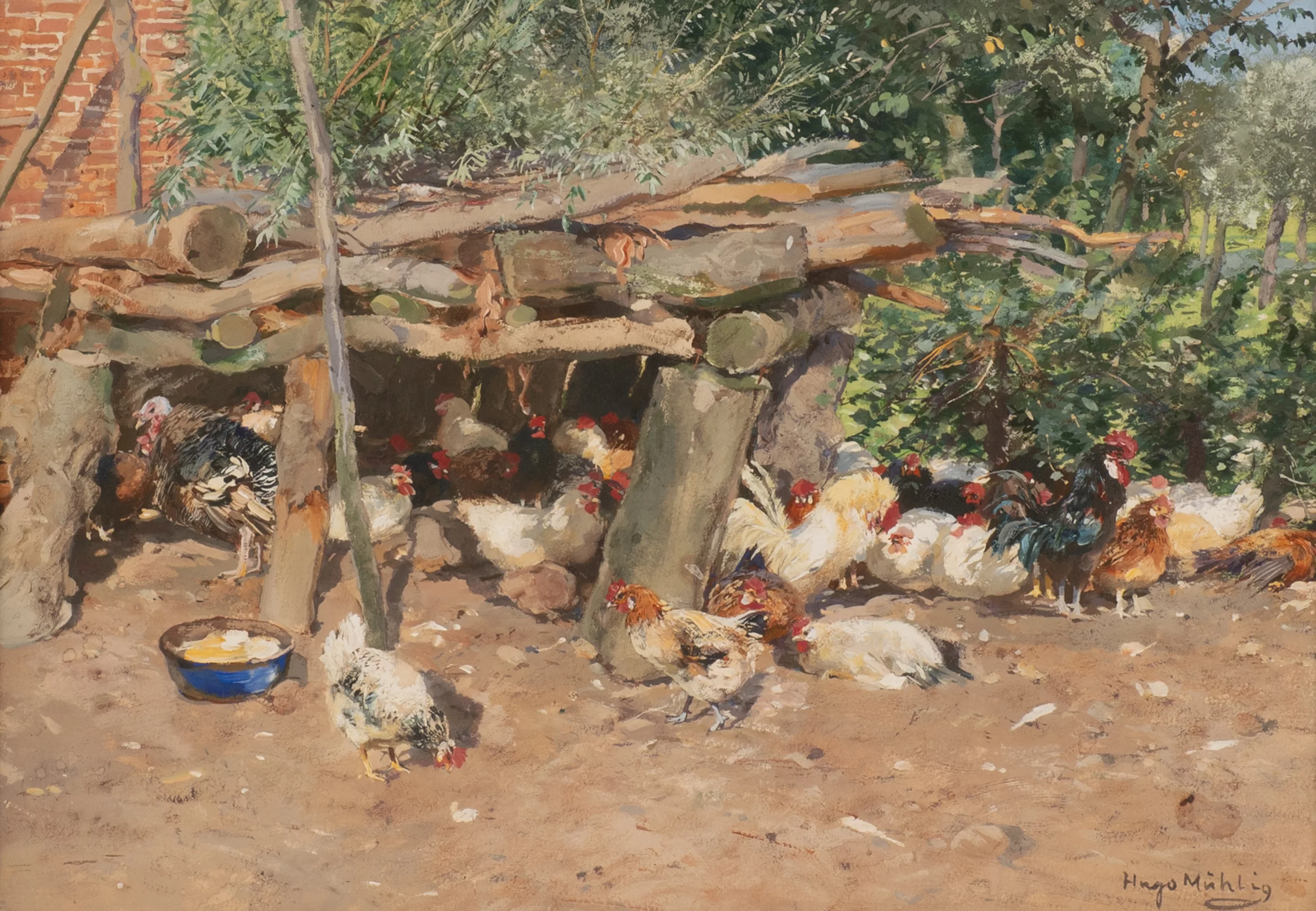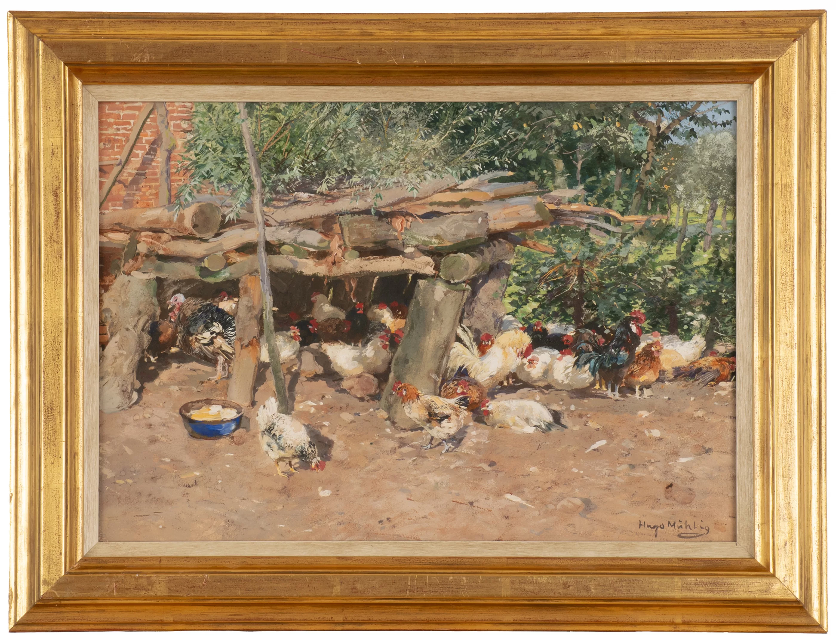 Hühnerstall, Gouache auf festem Karton, 24,5 cm x 35,5 cm Sichtmaß, signiert, partiell minimal fleckig