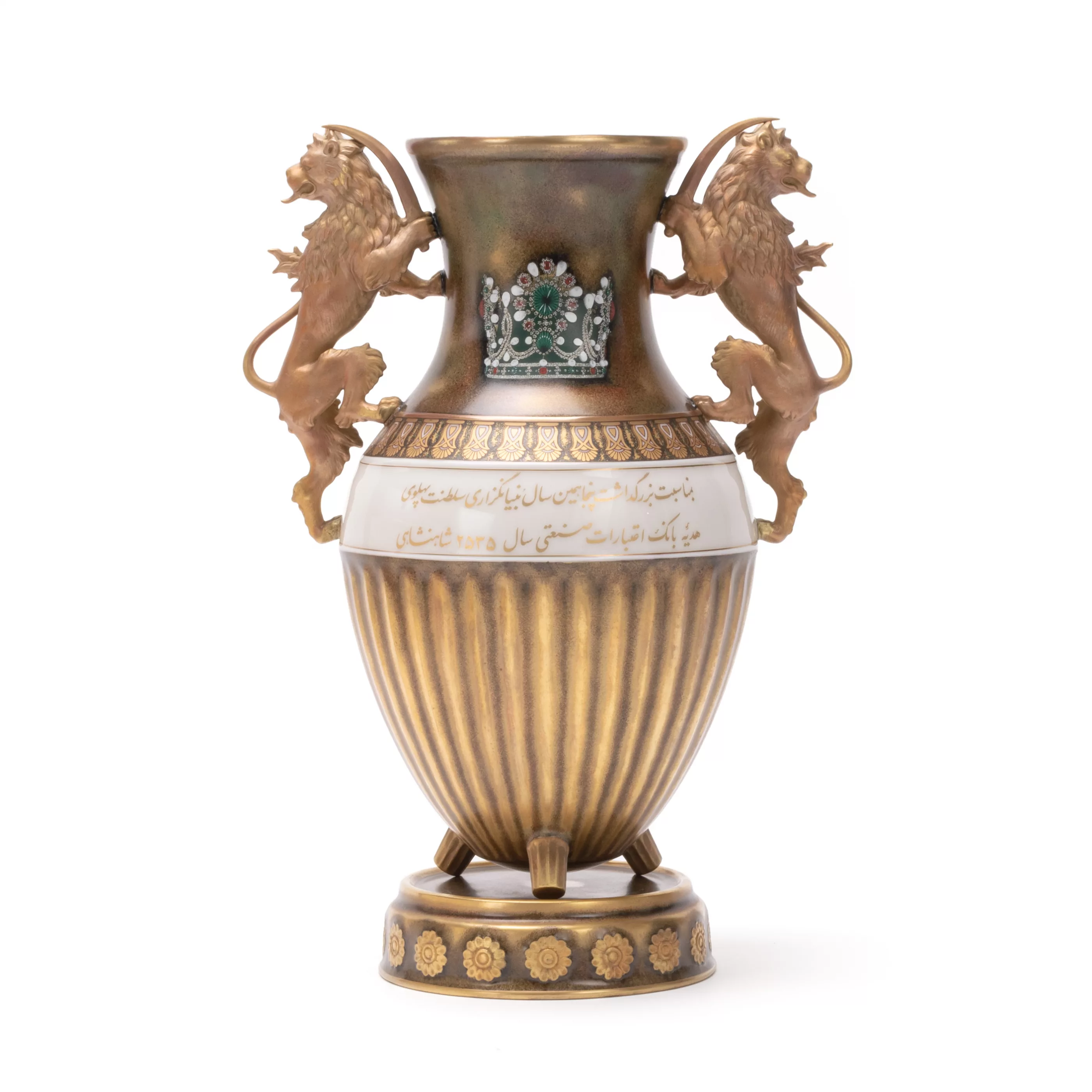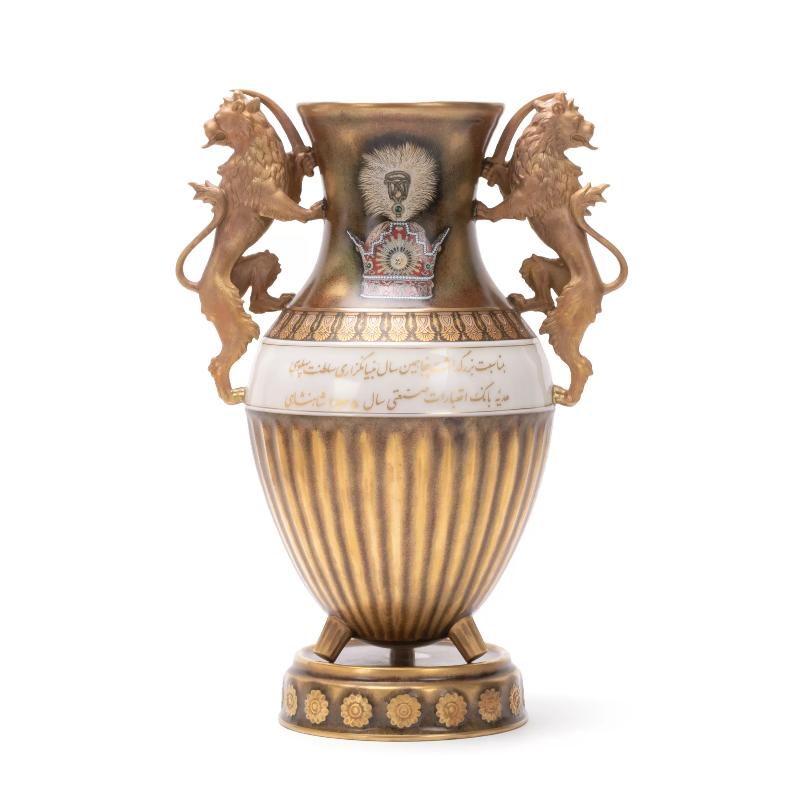 Hutschenreuther, 1977, Porzellan, farbig bemalt und gold staffiert, modelliert nach einem altpersischem Silbergefäß aus dem 4. Jh. v. Chr., herausgegeben von Hutschenreuther zum 50. Jahrestag der Pahlavi-Dynastie, Entwurf Hans Achtziger (1918-2003) um 1975, limitierte Auflage, Nr. 250 von 300 Exemplaren, matt vergoldete Handhaben in Form von Wappen-Löwen mit Krummschwert, vollplastische Ausformung der Krone der Kaiserin und des Schah, persische Inschrift und Papyrusblüten, runder Sockel, Höhe ca. 30 cm, Manufakturmarke, Nummerierung und Bezeichnung, Original-Box, Zertifikat und Broschüre anbei, Zustand A