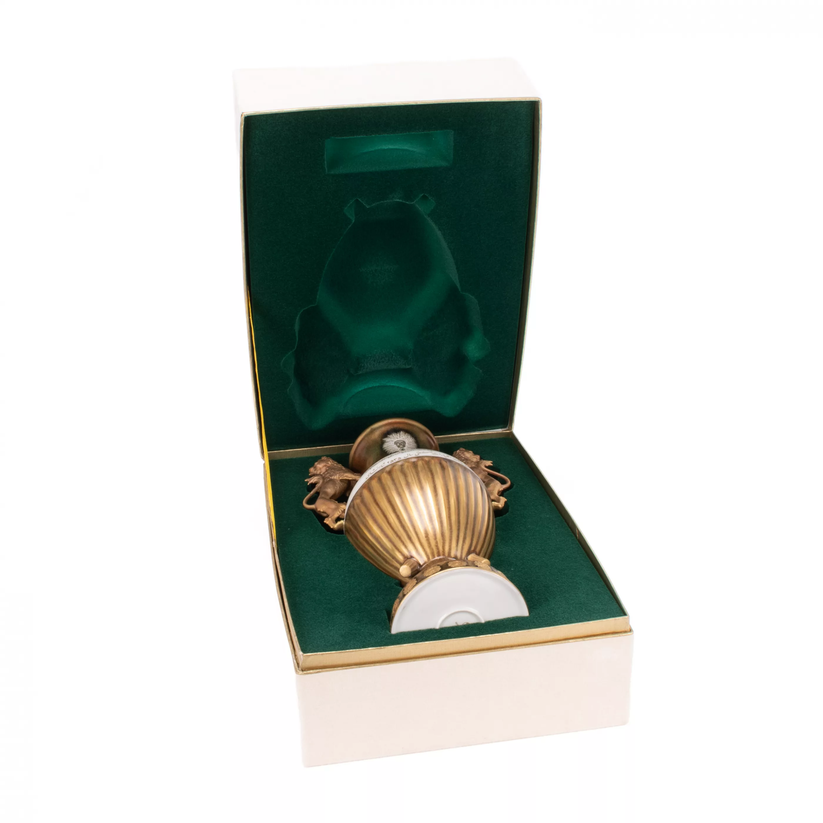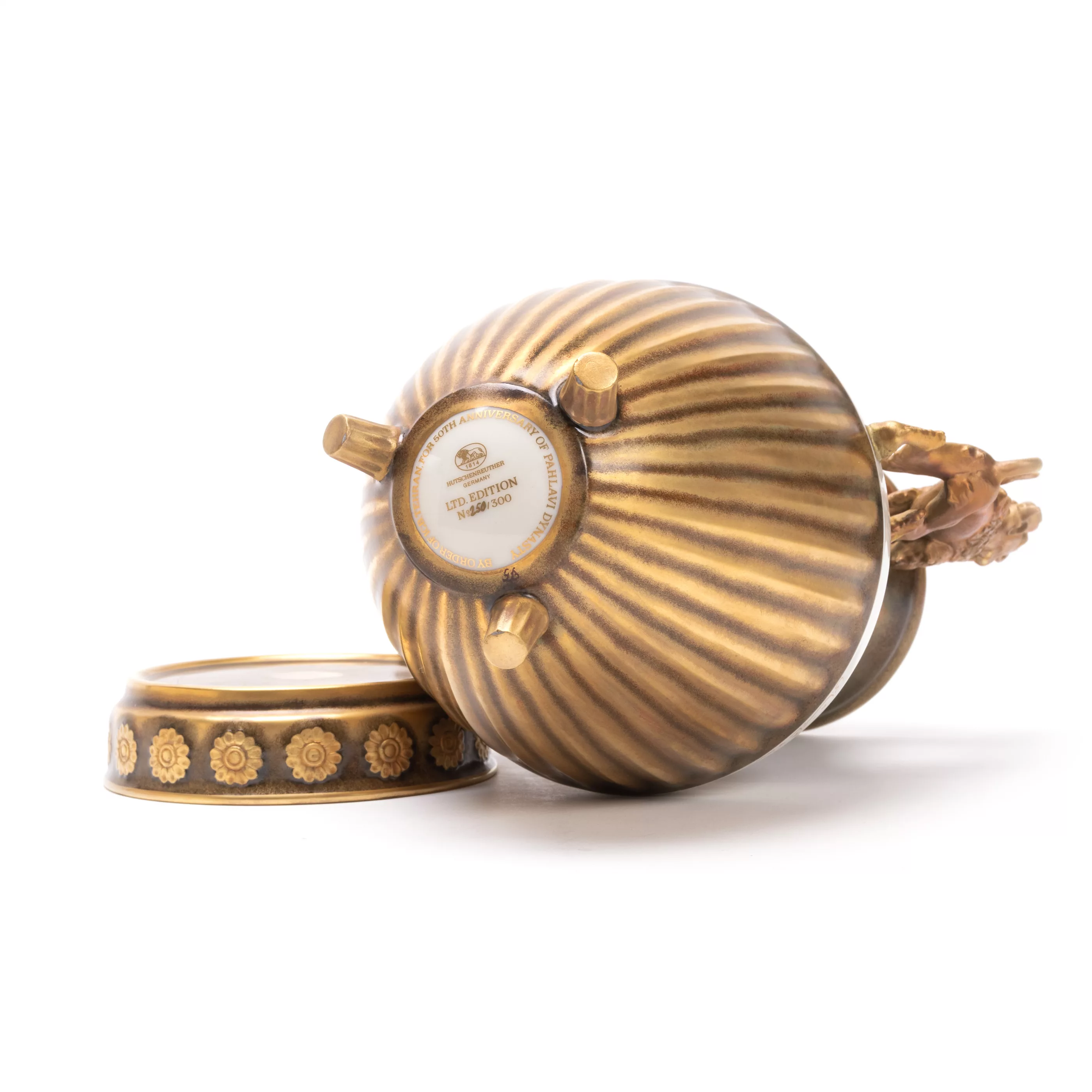 Hutschenreuther, 1977, porcelain, colorfully painted and painted gold, modeled after an ancient Persian silver vessel from the 4th century BC, issued by Hutschenreuther for the 50th anniversary of the Pahlavi dynasty, designed by Hans Achtziger (1918-2003) c. 1975, limited edition, no. 250 of 300 examples, matt gilt handles in the form of heraldic lions with scimitar, fully sculpted crown of the empress and the shah, Persian inscription and papyrus flowers, round base, height approx. 30 cm, manufacturer's mark, numbered and marked, original box, certificate and brochure enclosed, condition A