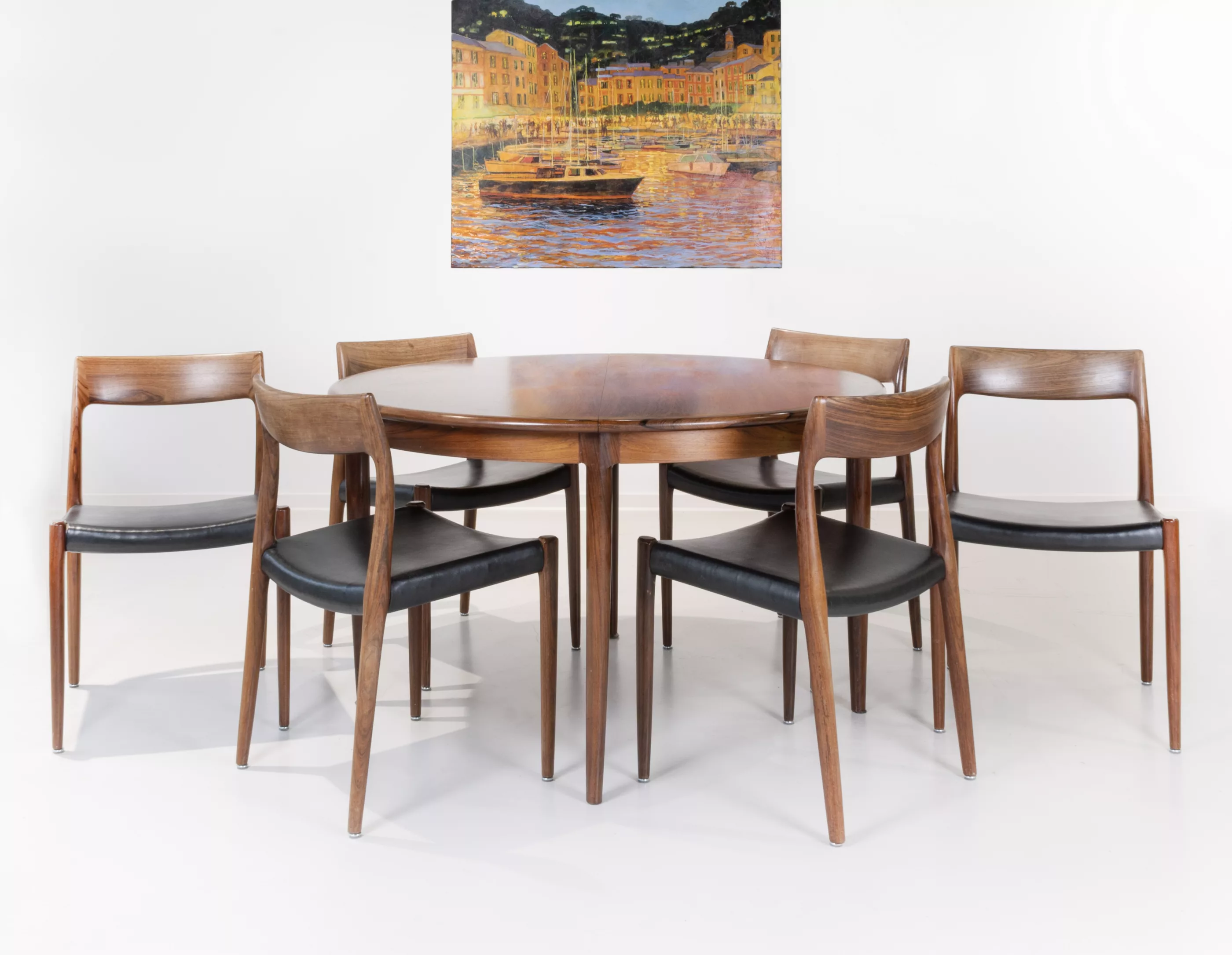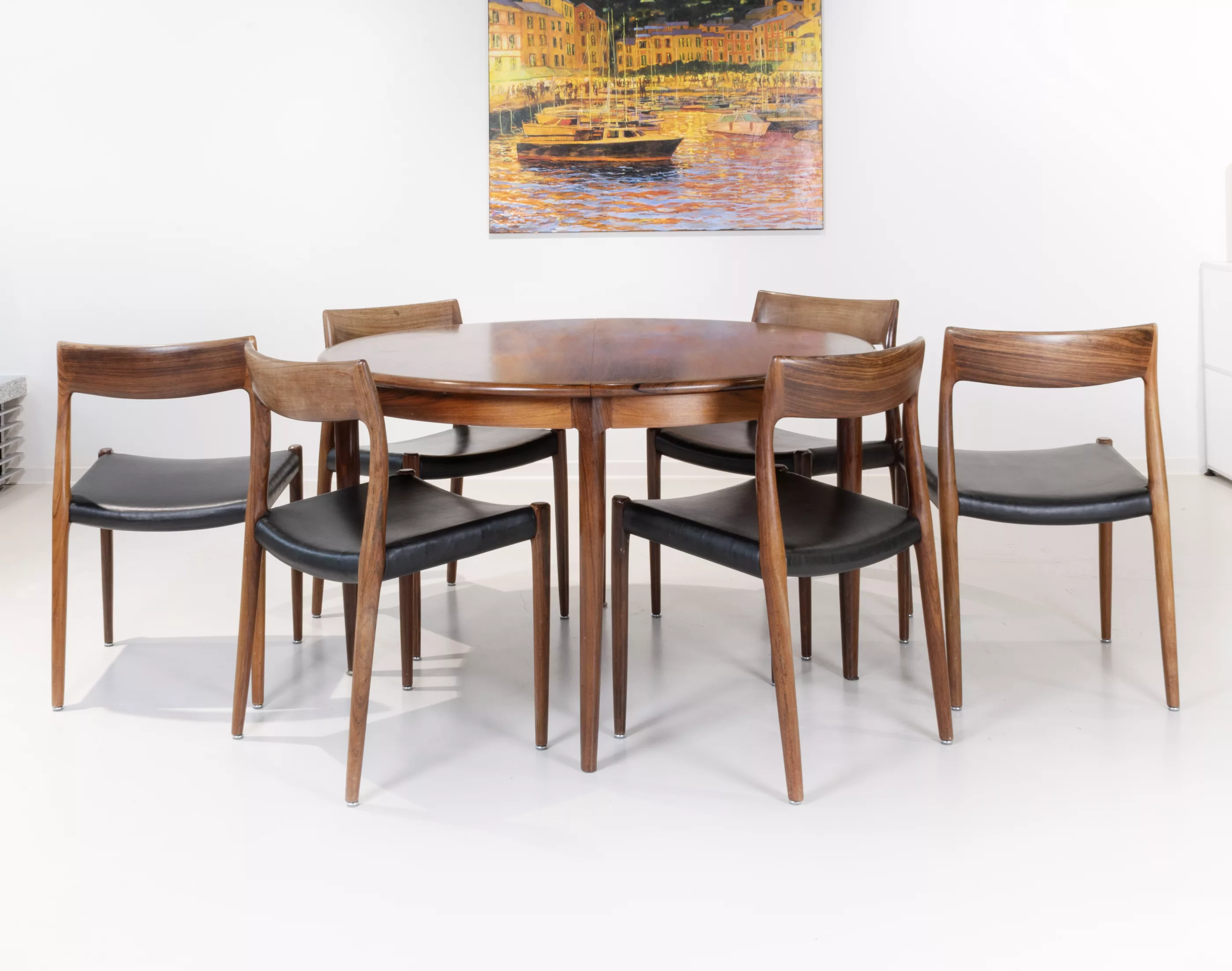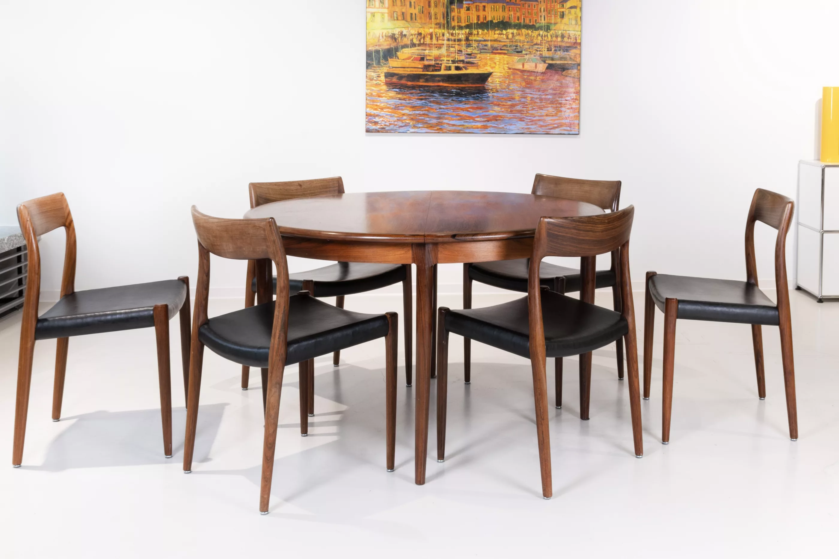 7 pcs, J.L. Möllers Möbelfabrik, Denmark, designed by Niels O. Møller (1920 - 1982), 2nd half 20th century, rosewood*, seats covered with black leather, each with a manufactory chip and 'Danish Furnituremakers Control' chip on the underside, table height 73 cm, Ø 123 cm, chairs each 75 x 49.5 x 45 cm, seat height 45 cm, condition B, with signs of age and wear, stickers partially fallen off *Cites certificate enclosed, due to legal species protection regulations no dispatch to a delivery address outside the European Union