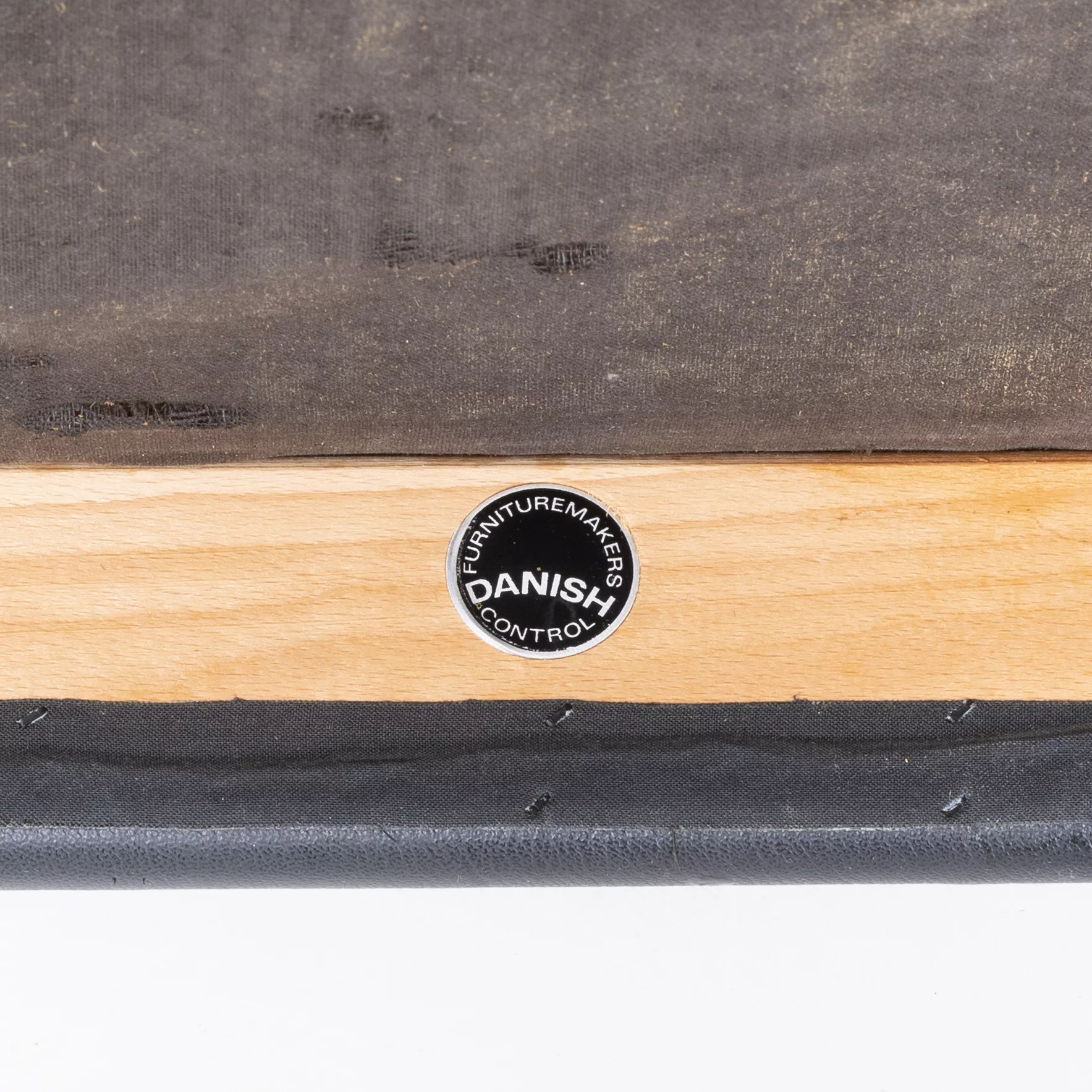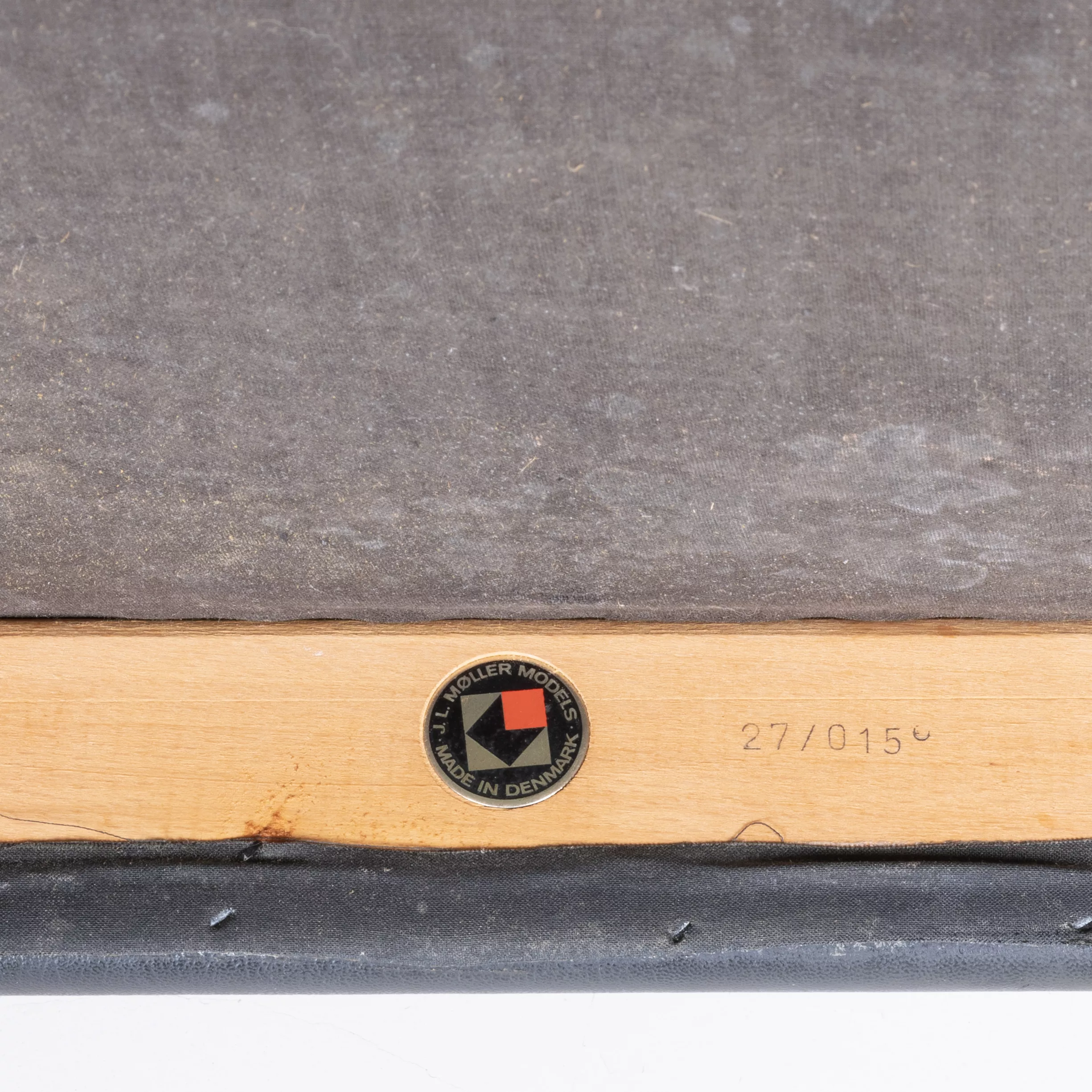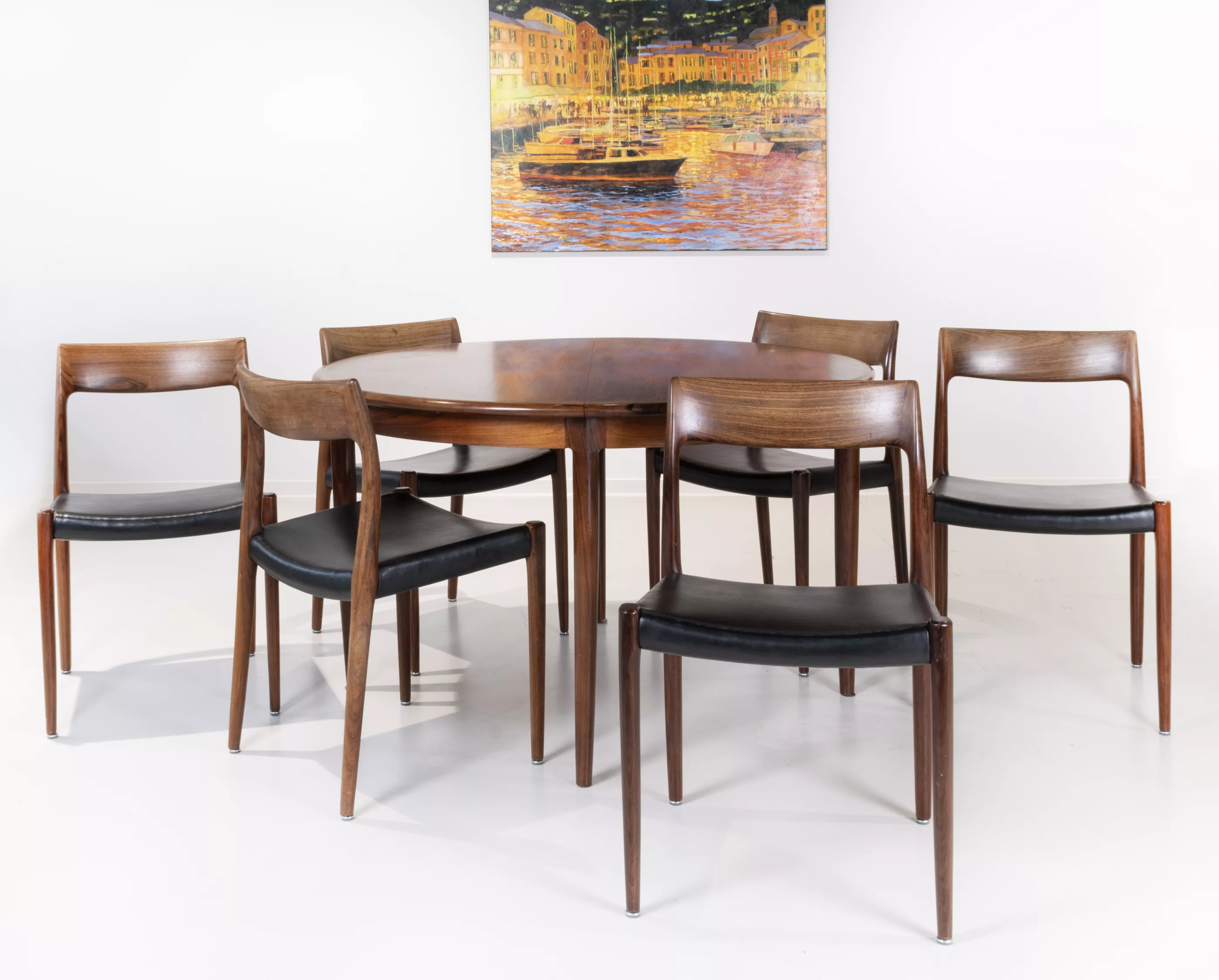 7 pcs, J.L. Möllers Möbelfabrik, Denmark, designed by Niels O. Møller (1920 - 1982), 2nd half 20th century, rosewood*, seats covered with black leather, each with a manufactory chip and 'Danish Furnituremakers Control' chip on the underside, table height 73 cm, Ø 123 cm, chairs each 75 x 49.5 x 45 cm, seat height 45 cm, condition B, with signs of age and wear, stickers partially fallen off *Cites certificate enclosed, due to legal species protection regulations no dispatch to a delivery address outside the European Union