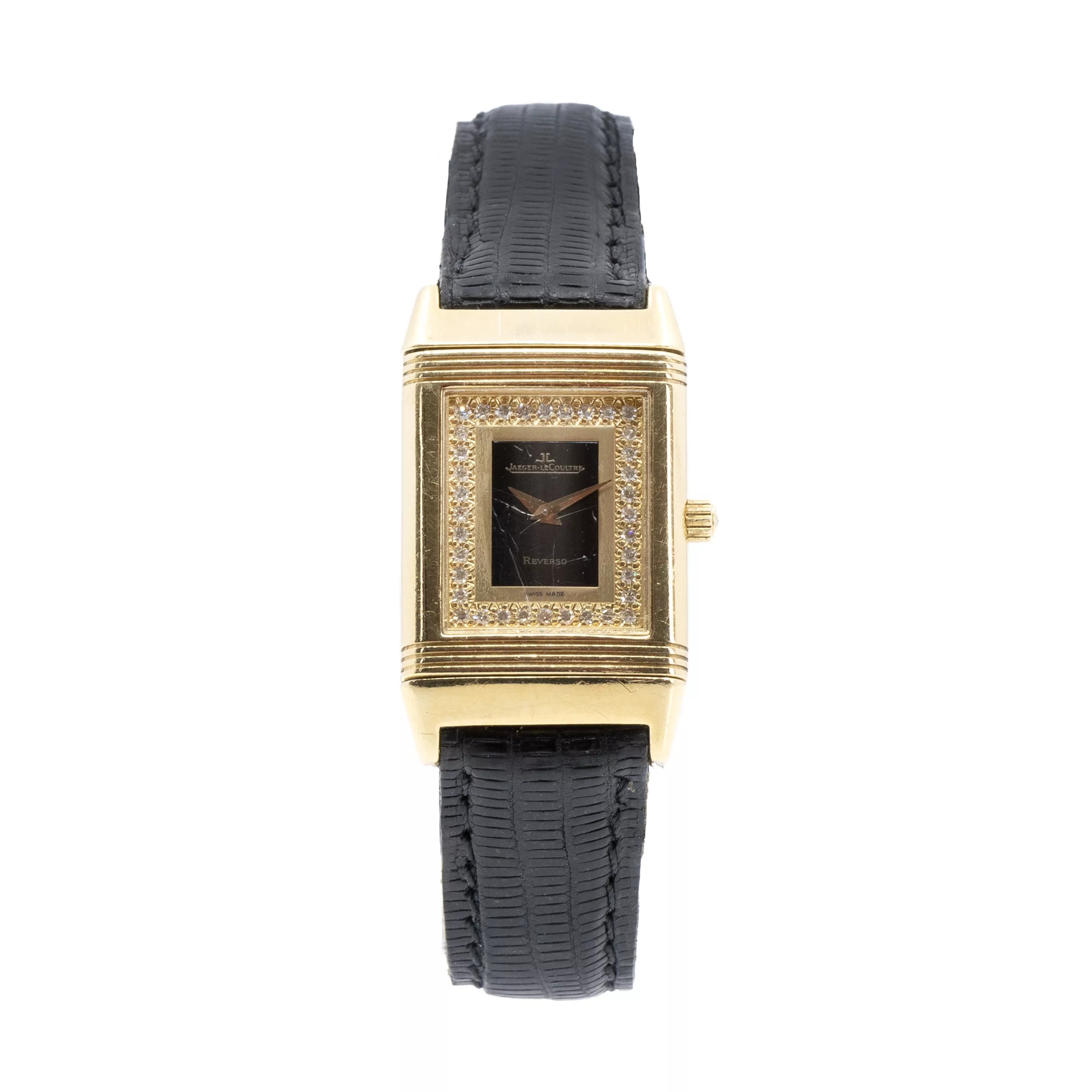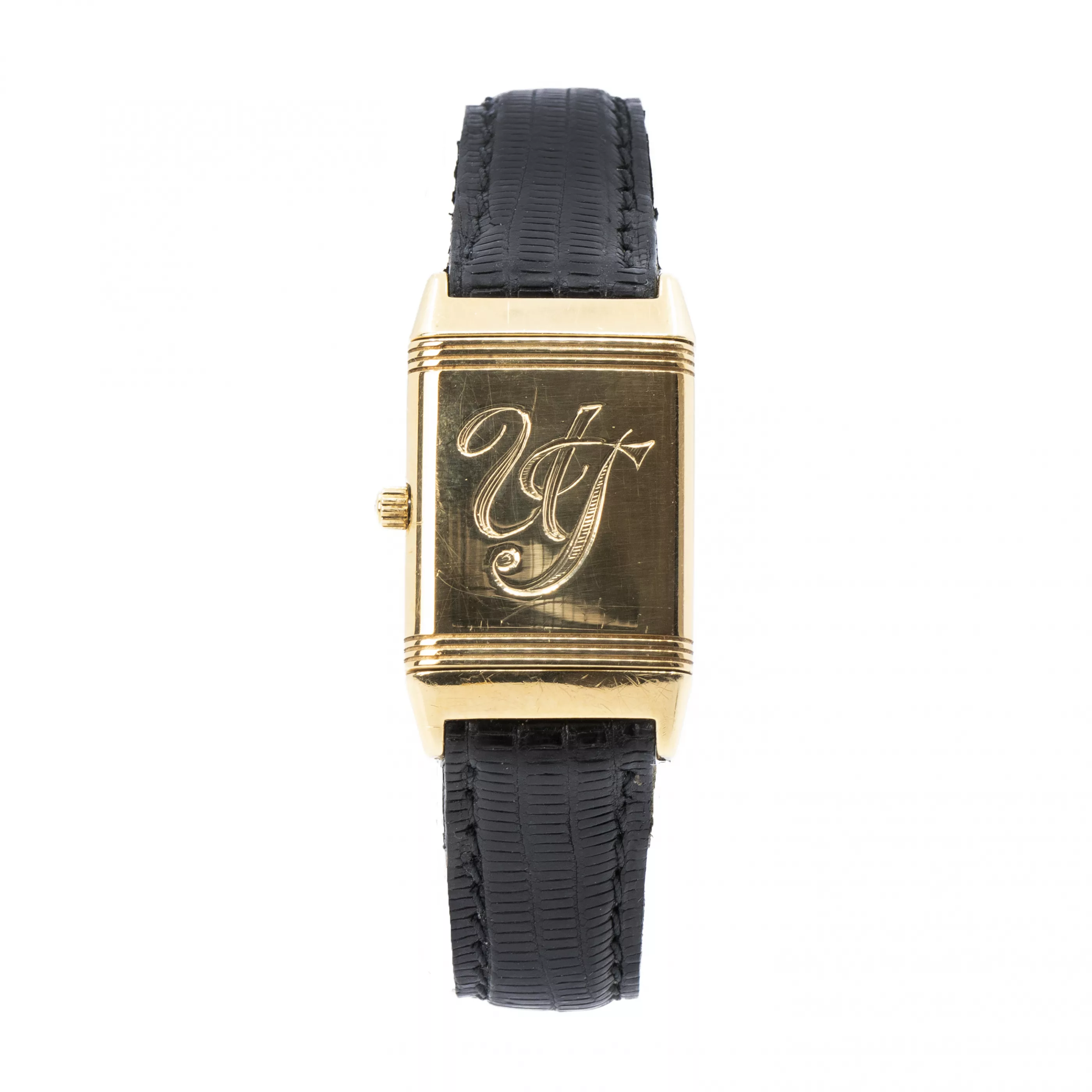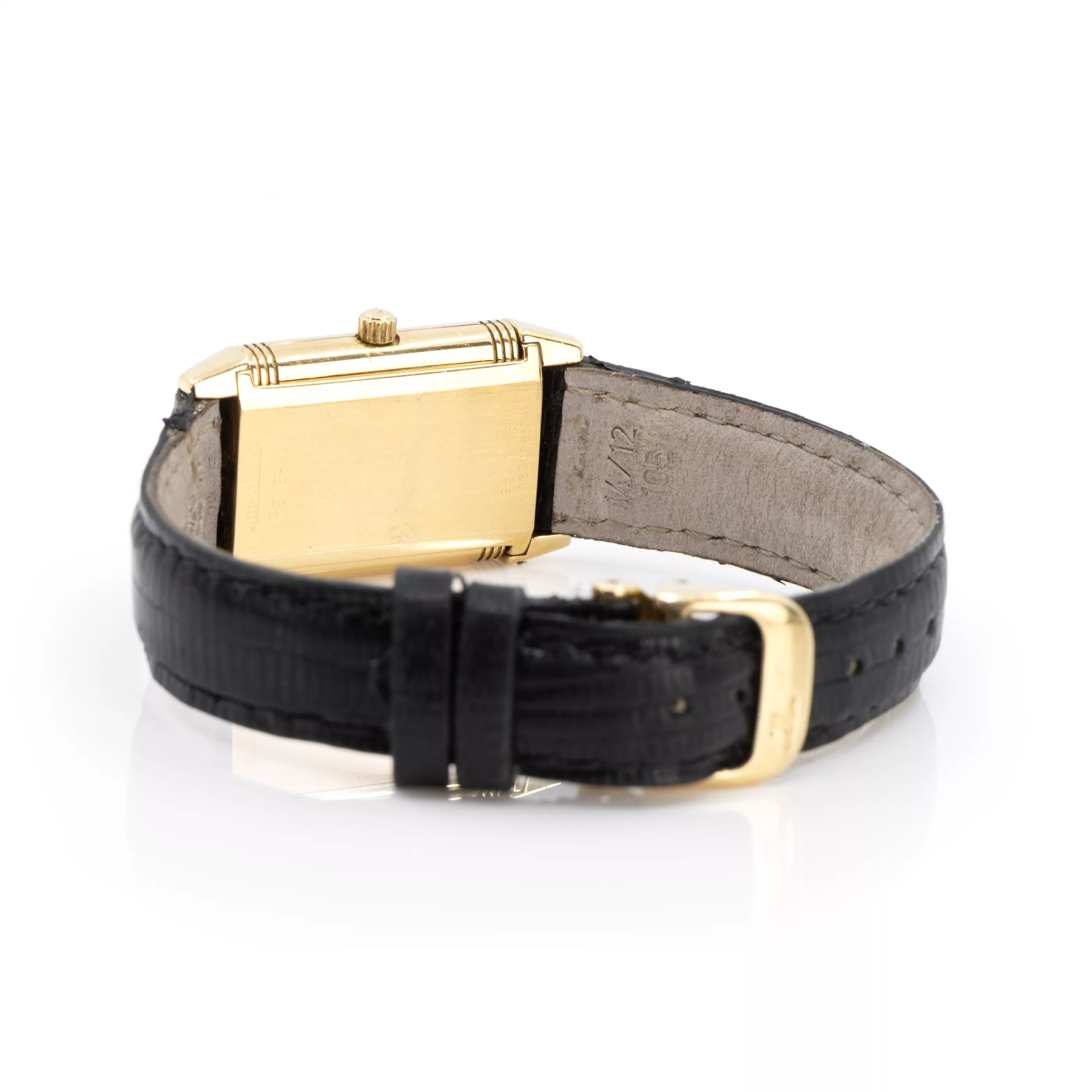 Switzerland, quartz, case no. 1690965, patented reversible case, dial with 34 diamonds, total approx. 0.34 ct, case monogrammed on verso, case 750 yellow gold, hallmarked, dimensions 22 mm x 18 mm, bracelet leather, replaced, original clasp 750 yellow gold, hallmarked, length 18 cm, total weight approx. 42.7 g, function not given, checked, battery change required, condition satisfactory, case with signs of wear, glass with scratches, without original box or papers, note: The buyer's premium is 25% incl. VAT. For the use of the online bidding consoles there is an additional fee of 3% plus VAT (3.57%).