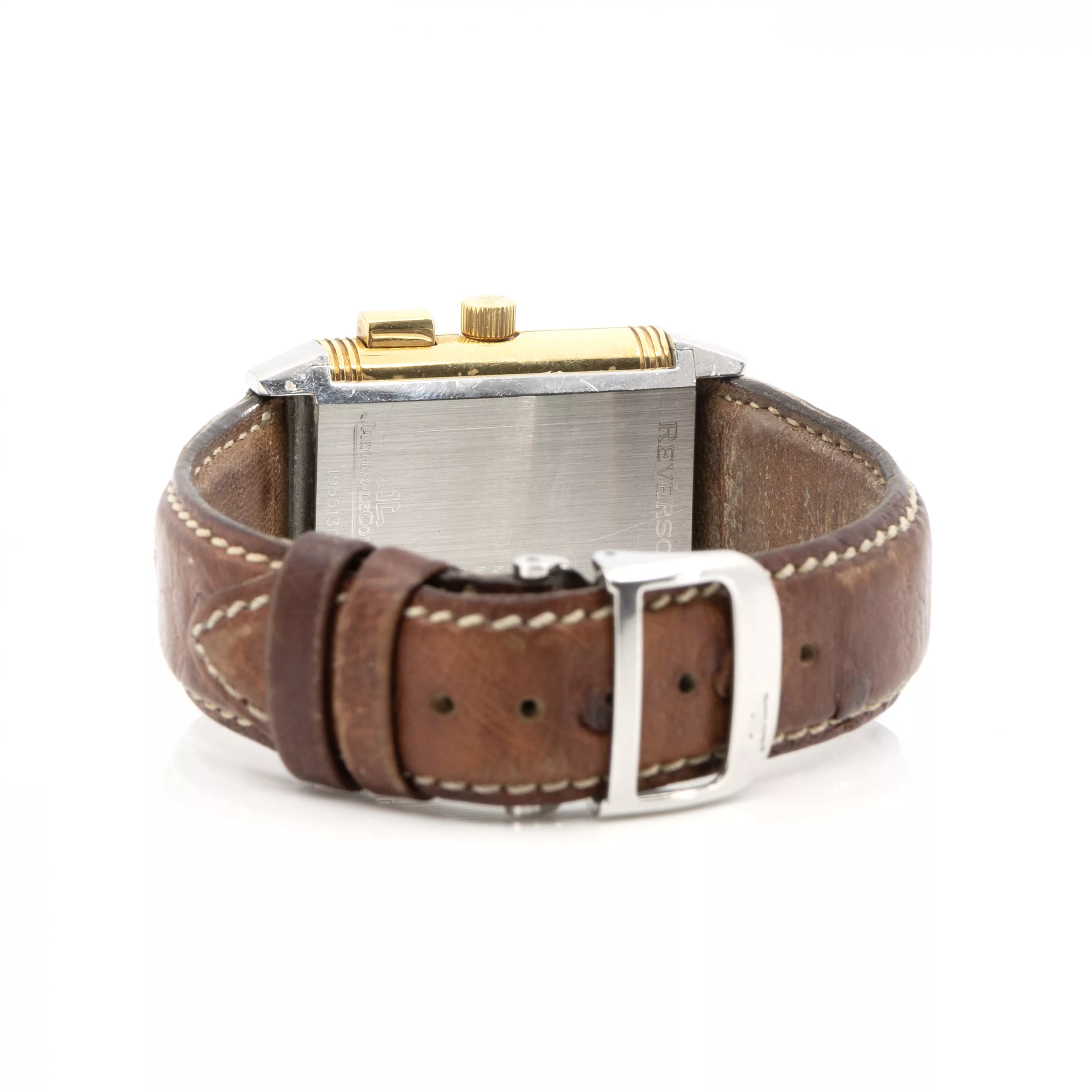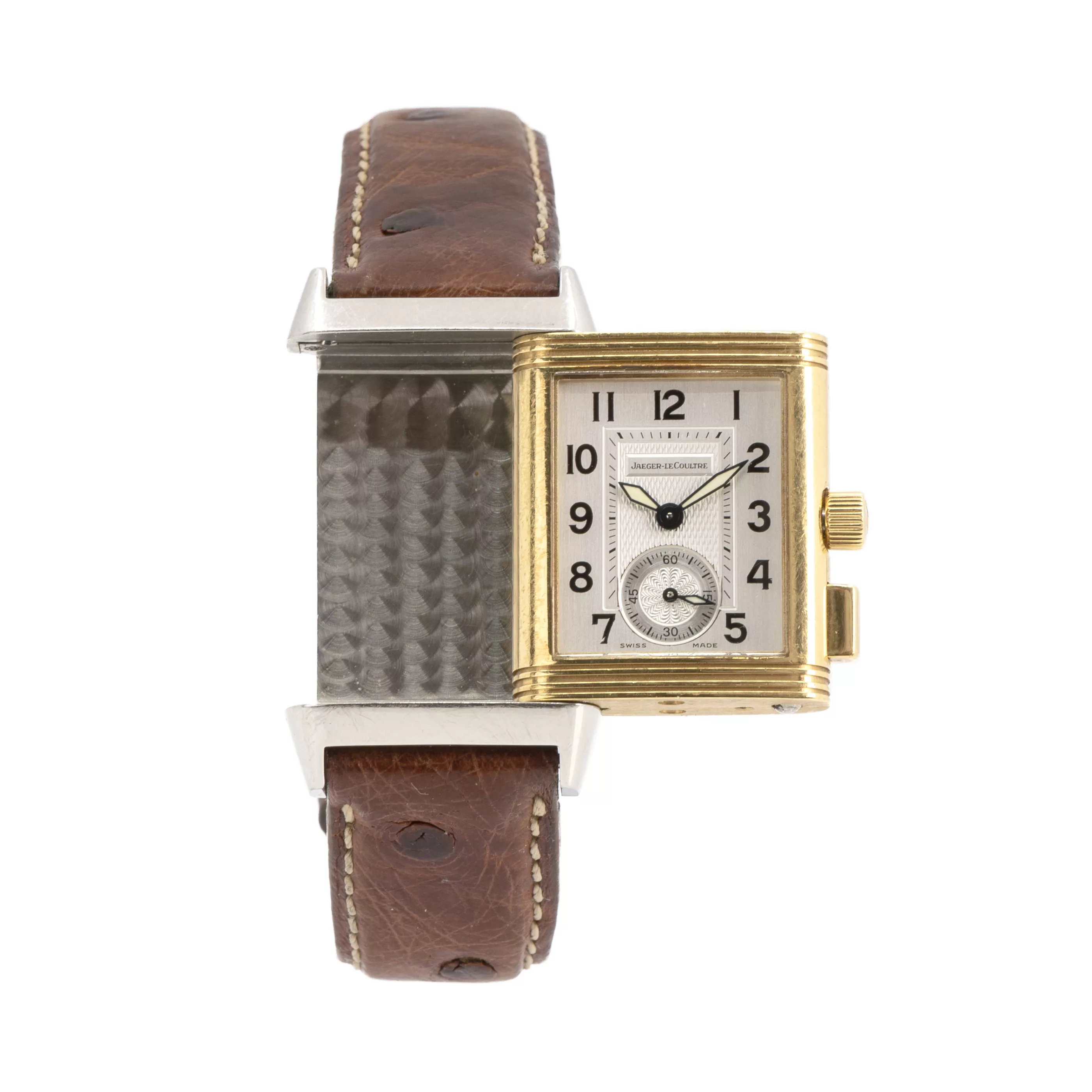 Manual winding, patented reversible case, case no. 1955130 | ref. no. 255.5.82, case steel/18k yellow gold, dimensions 38 mm x 23 mm, bracelet replaced, leather, original folding clasp, steel, length 15 cm, adjustable, total weight approx. 58.2 g, functional, chronograph function defective, tested, condition good, condition and functionality tested by our master watchmaker, without original box or papers, note: The buyer's premium is 25% incl. VAT. For the use of the online bidding consoles there is an additional fee of 3% plus VAT (3.57%).