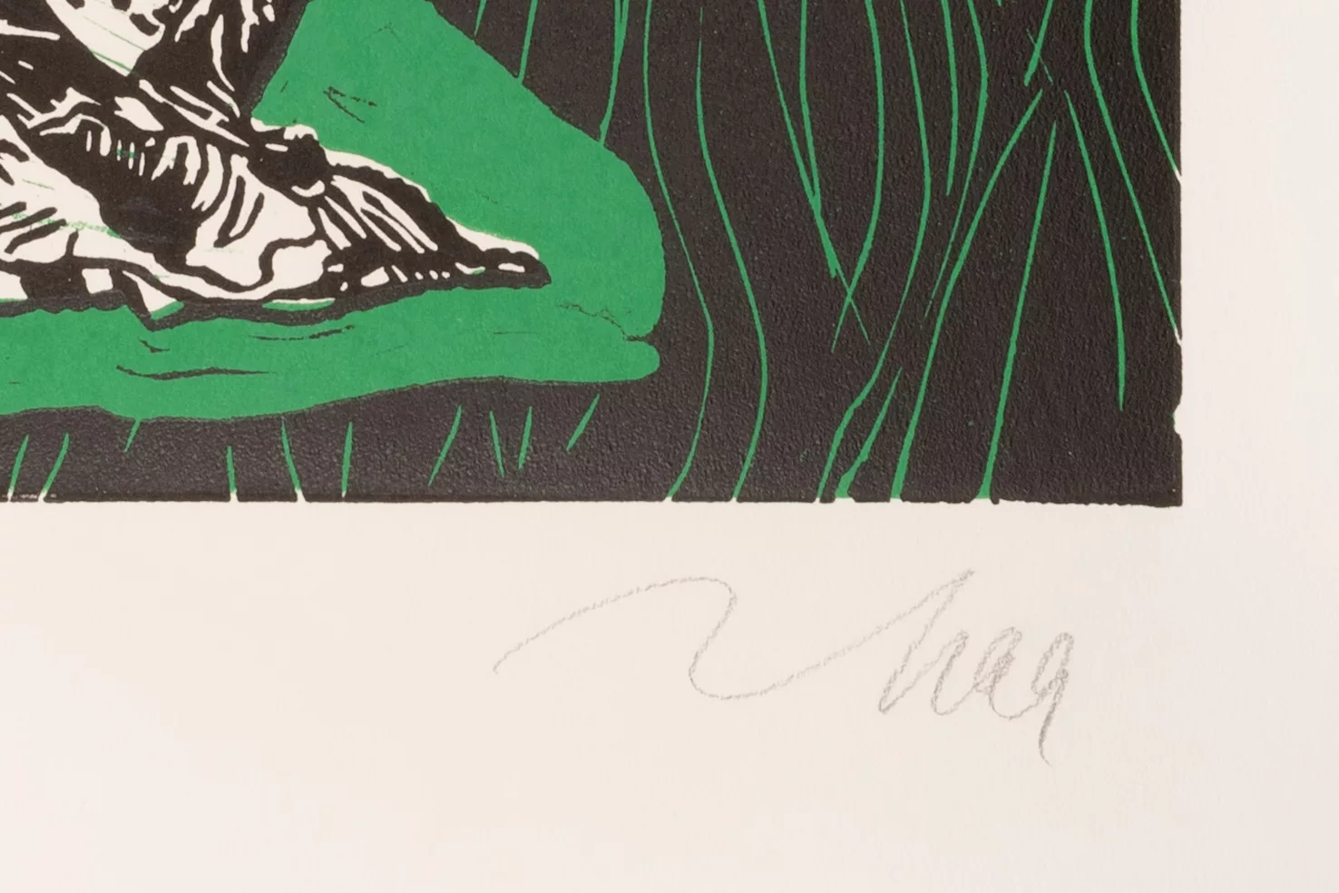 Elbquelle (green), color linocut on Schöllershammer (dry stamp), 59,5 cm x 42 cm print size, 74 cm x 52 cm sheet size, signed, 99 dated, 7/33 numbered, sheet corner minimally bumped