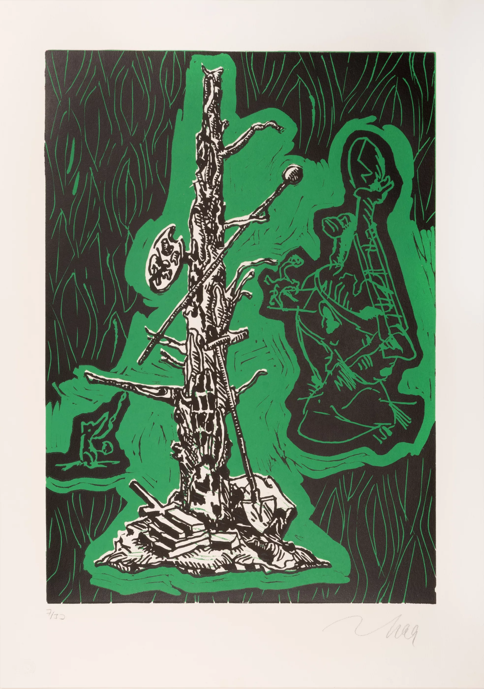 Elbquelle (grün), Farblinolschnitt auf Schöllershammer (Trockenstempel), 59,5 cm x 42 cm Druckmaß, 74 cm x 52 cm Blattmaß, signiert, 99...
