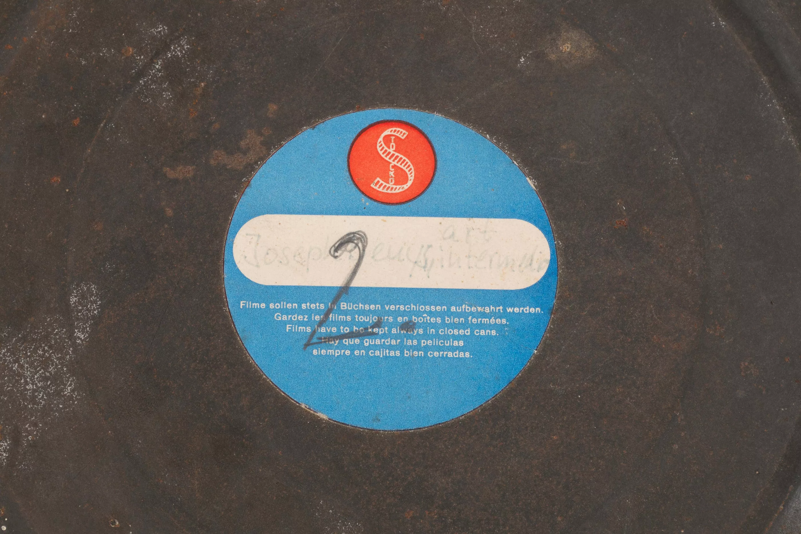 Film reel 'Art intermedia', 16 mm film reel in a metal box, diameter 24.5 cm, signed and titled on label on the front, function untested. The film was last played 10 years ago and shows a happening in the basement of the Art Intermedia gallery, Helmut Rywelskis. The film lasts approx. 15 minutes.