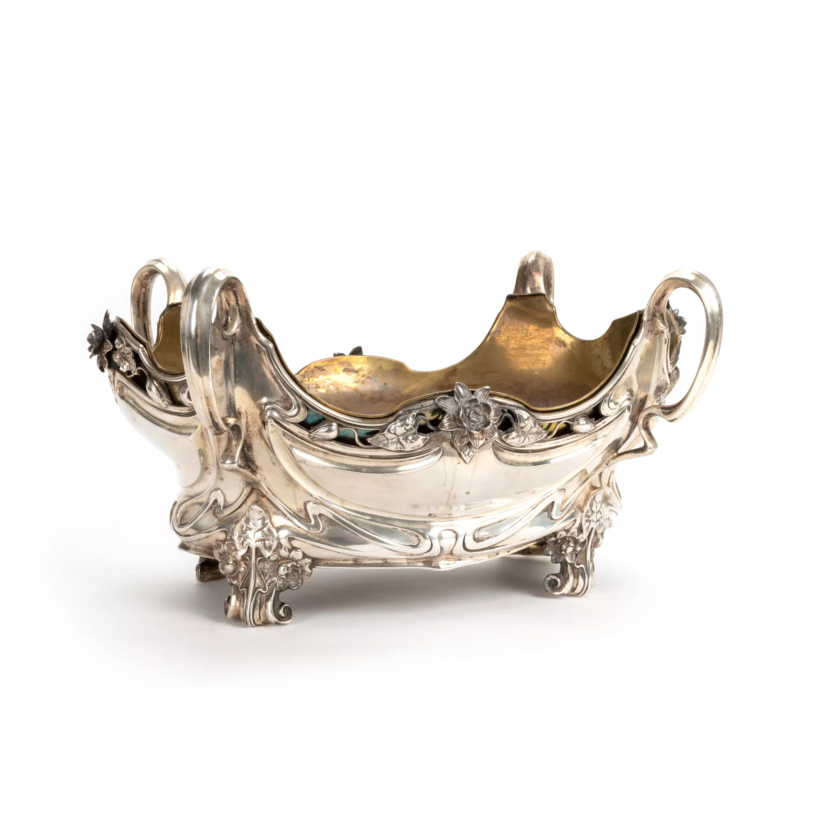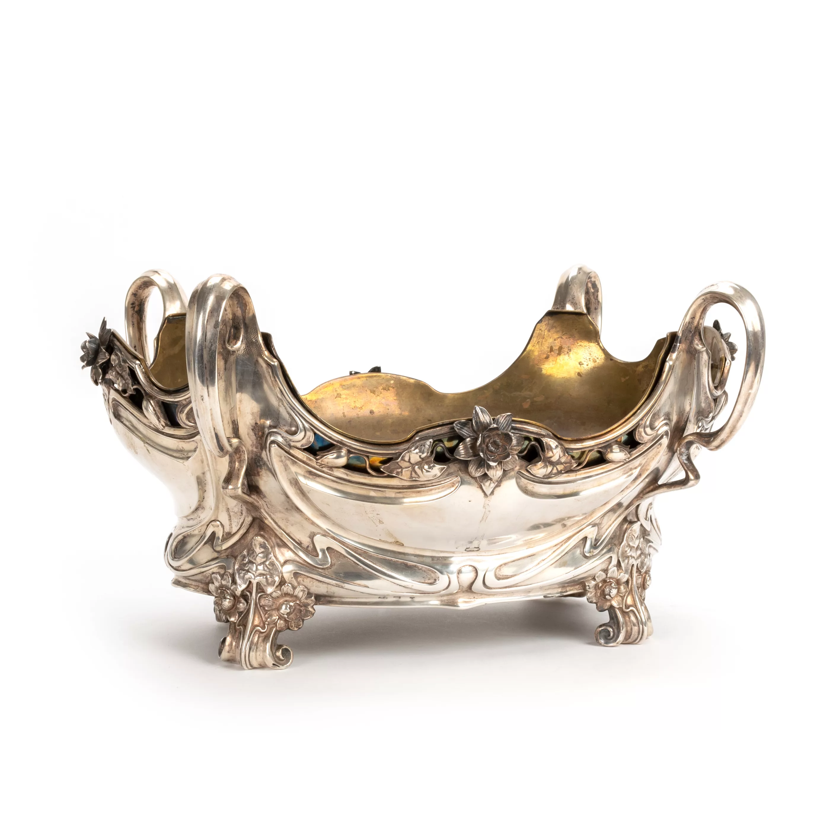 Um 1910, 800 Silber, punziert, Importpunze Österreich 1902-1922, Meisterpunze A.P., ovale Gefäßform auf 4 in Voluten endenden Füßen, 4 geschwungene Ohrenmuschel-Henkel, die Wandungen verziert mit geschwungenen Bändern, Efeublättern und Blütenapplikationen, der Rand geschwungen durchbrochen gearbeitet, mit Messingeinlage, 21,5 x 39 cm x 27,5 cm, Gewicht ohne Messingeinlage ca. 1.364 g, leichte Alters- und Gebrauchsspuren, Standfüße etwas verzogen