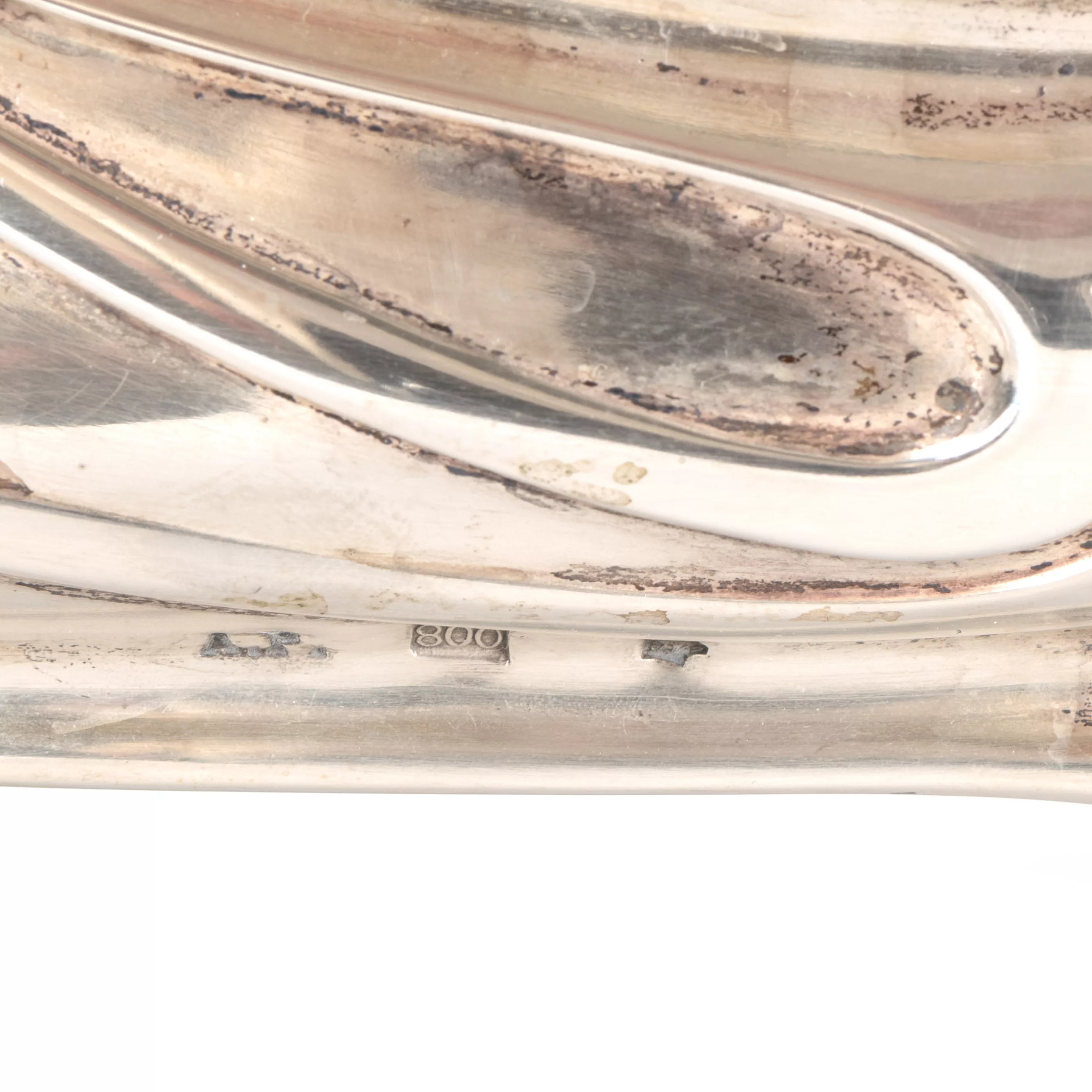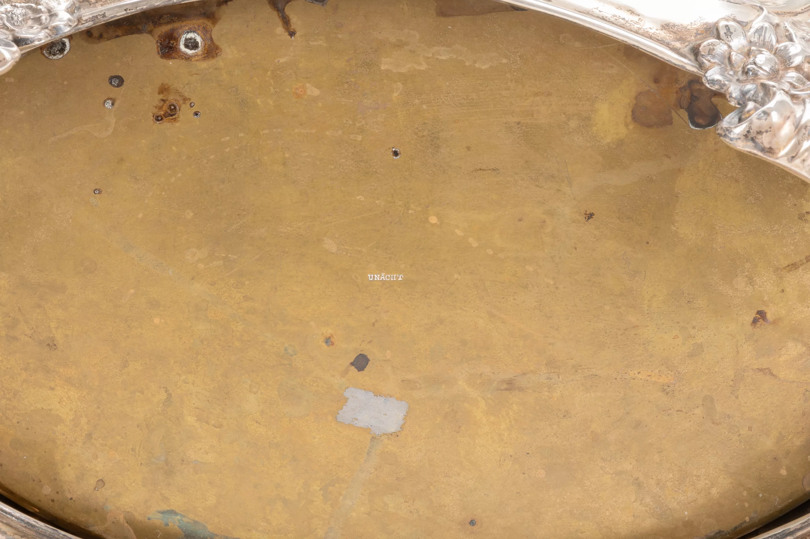 Ca. 1910, 800 silver, hallmarked, import hallmark Austria 1902-1922, master's mark A.P., of oval form on 4 feet ending in volutes, 4 curved ear shell handles, the sides decorated with curved bands, ivy leaves and floral appliqués, the rim open-worked in curved lines, with brass inlay, 21.5 x 39 cm x 27.5 cm, weight without brass inlay approx. 1,364 g, slight signs of age and wear, feet slightly warped