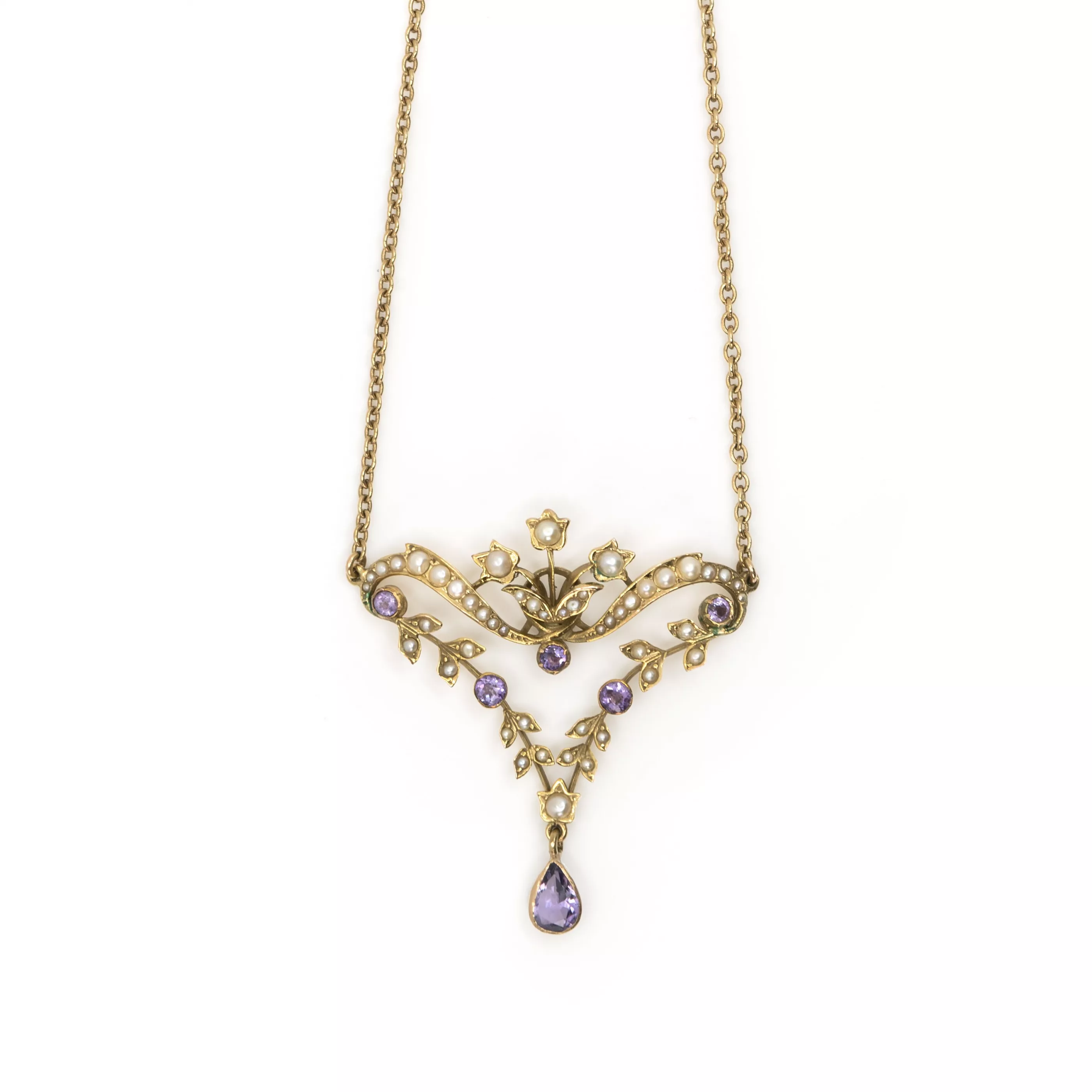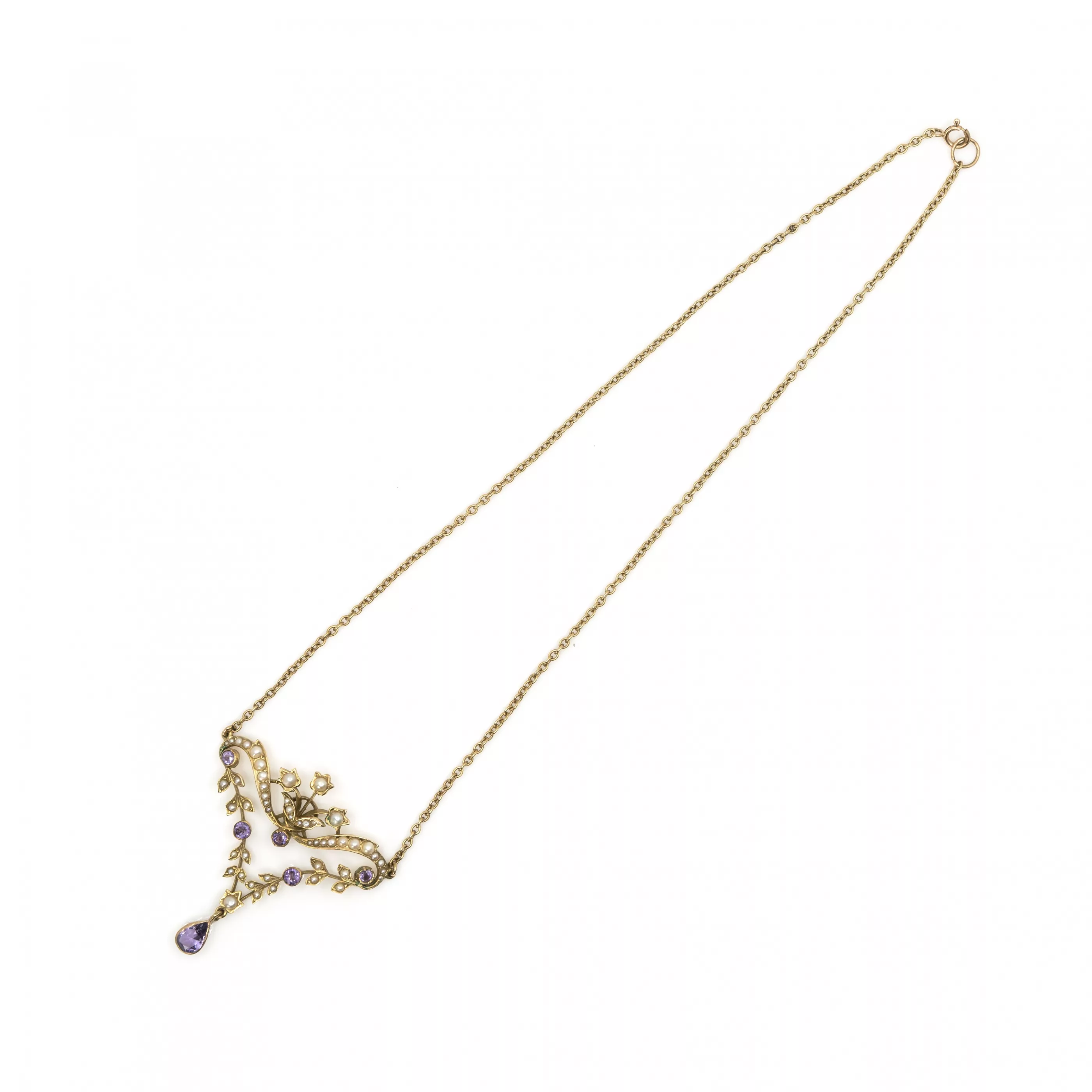 Circa 1900, 585 yellow gold, tested, 5 round faceted amethysts and 1 teardrop cut amethyst, natural pearls, length necklace 38 cm, weight ca. 6,7 g