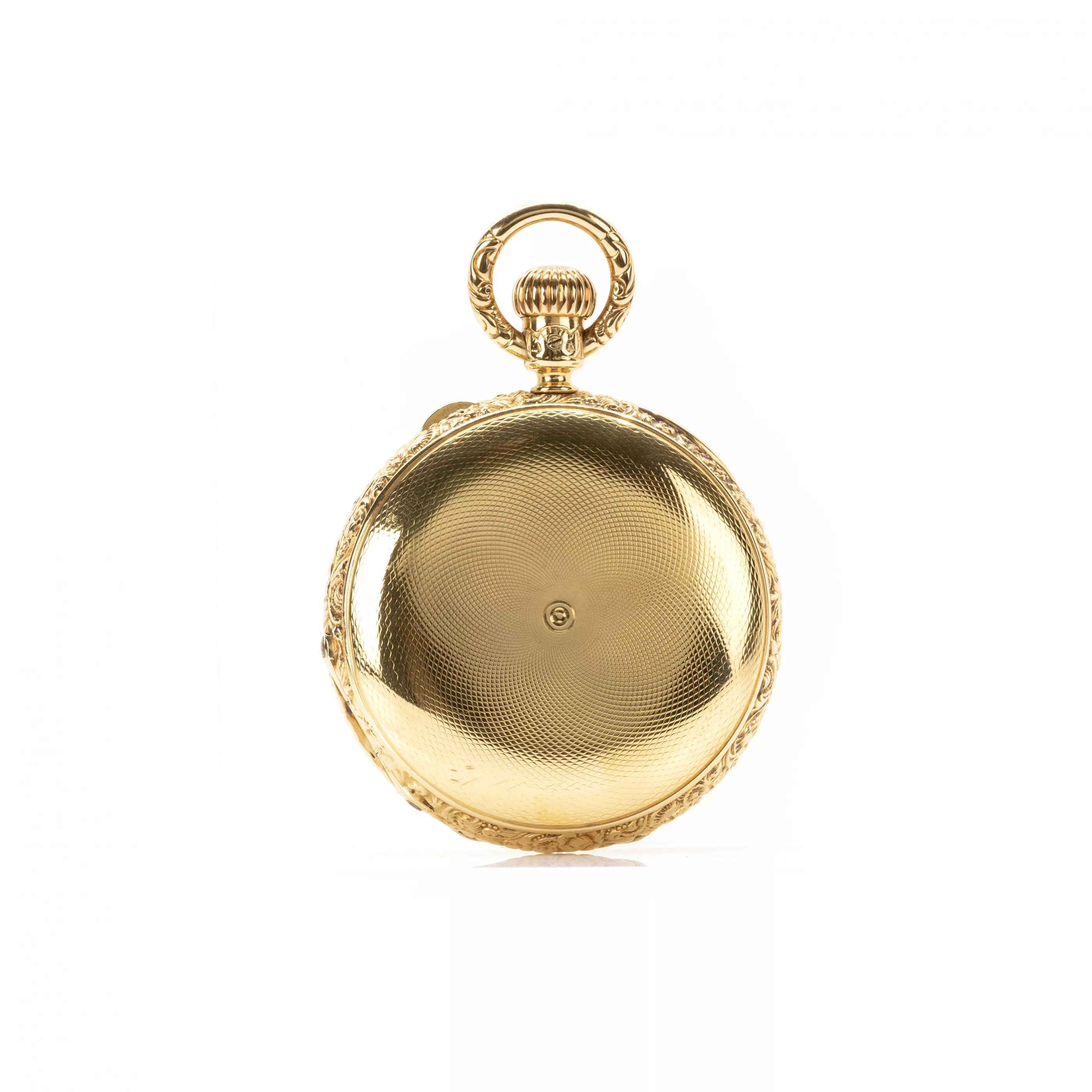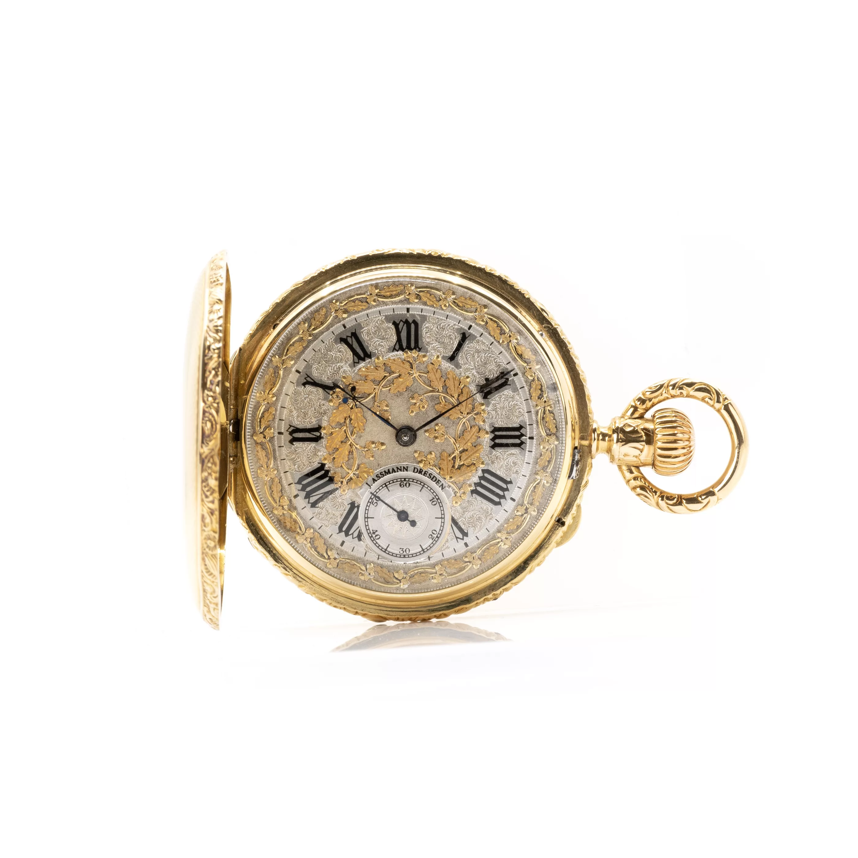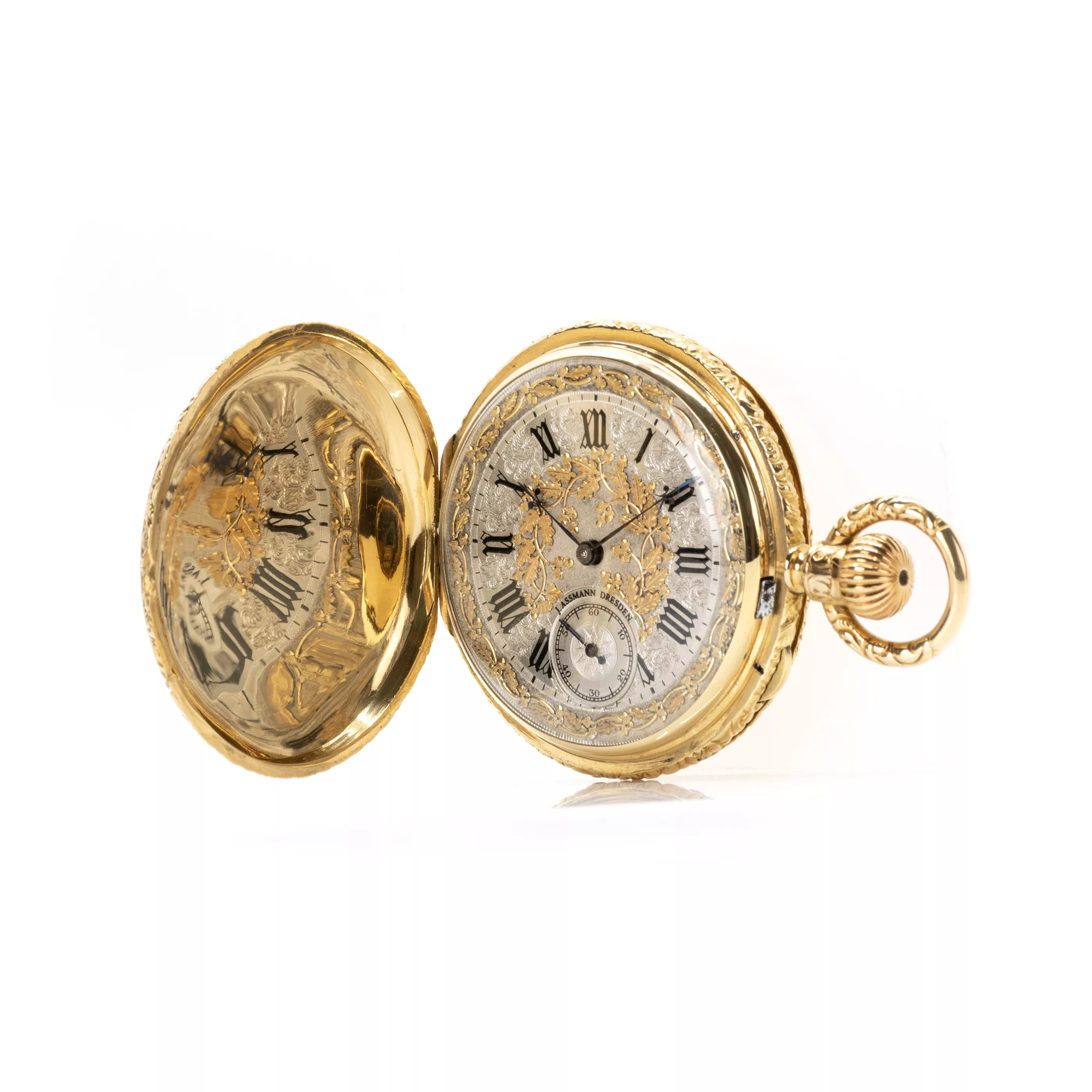 Germany, circa 1870-1873, hand-wound, nickel-plated 3/4 plate movement with stripes, gold chatons, bimetallic compensation balance, diamond endstone, gold anchor, anchor wheel and minute wheel, Breguet balance spring, 750 yellow gold case, hallmarked, 750 yellow gold intermediate cover, watch chain 750 yellow gold, tested, engine-turned case, with floral relief bezels, bow and neck, crown winder with lateral pusher for setting the hands, silver dial, engraved, gilt, stylised roman numerals, small second, centre and minute wheel, Breguet balance wheel, Breguet balance wheel, Breguet balance spring, gold-plated, gold-plated, gold-plated. Dial, engraved, gilt, stylised Roman numerals, small seconds, centre and edge of dial decorated with oak leaves and acorns in gold, blued steel hands in the shape of lilies, dust cover engine-turned and inscribed, case, dust cover and movement no. 4424, diameter 50 mm, weight approx. 120.3 g, chain approx. 37.8 g, function tested, working, condition good/satisfactory, spiral is bent, in need of repair, with original box and copy of purchase receipt with description