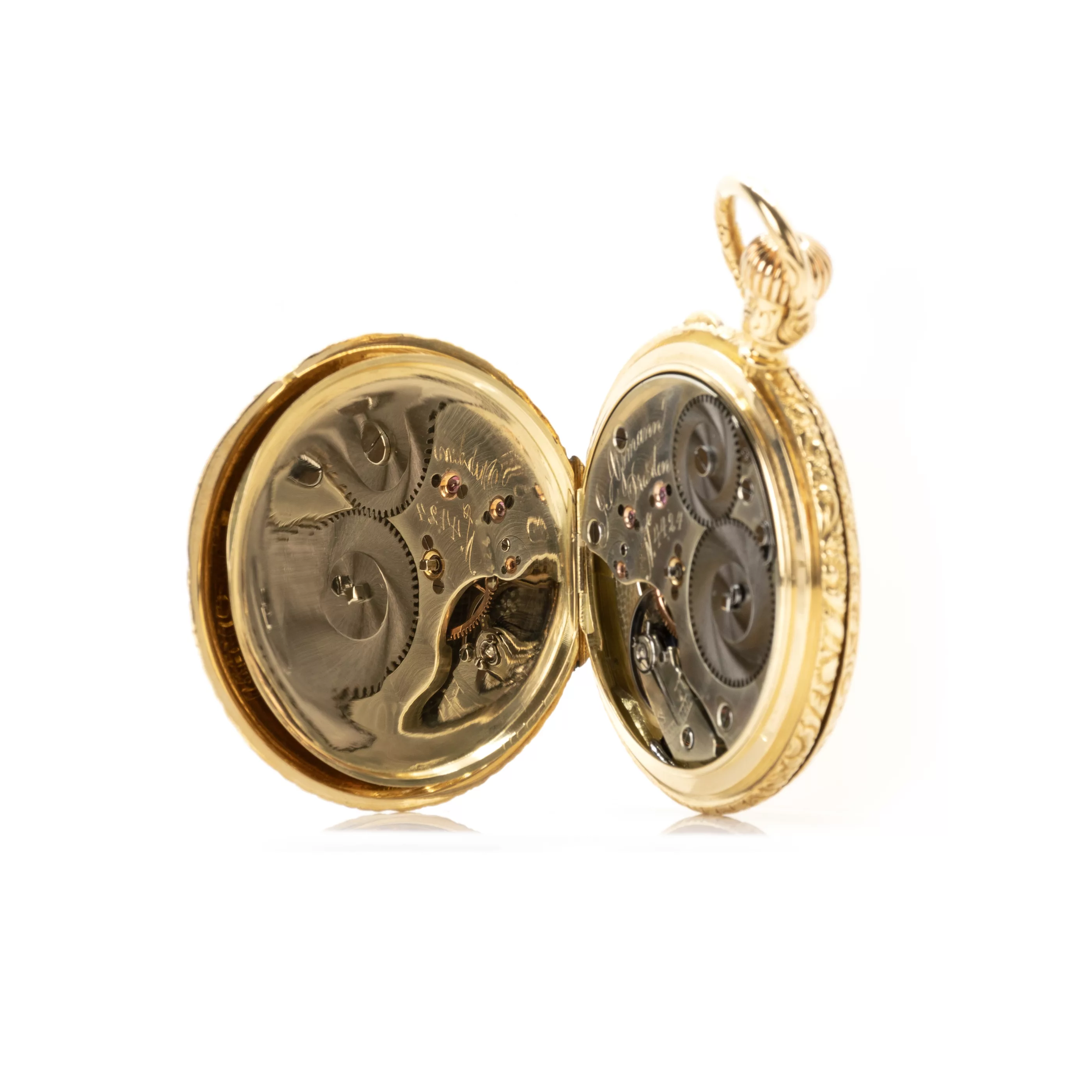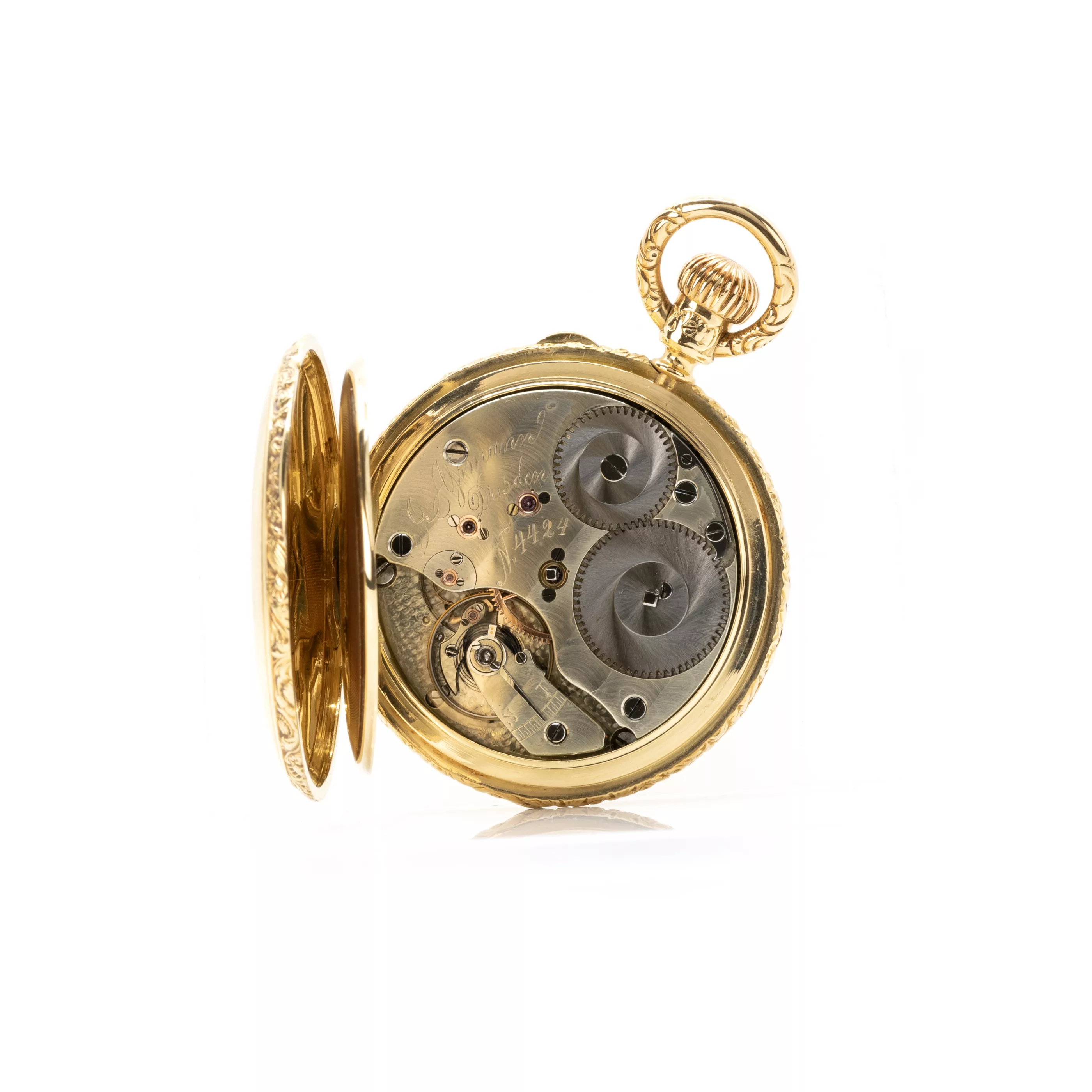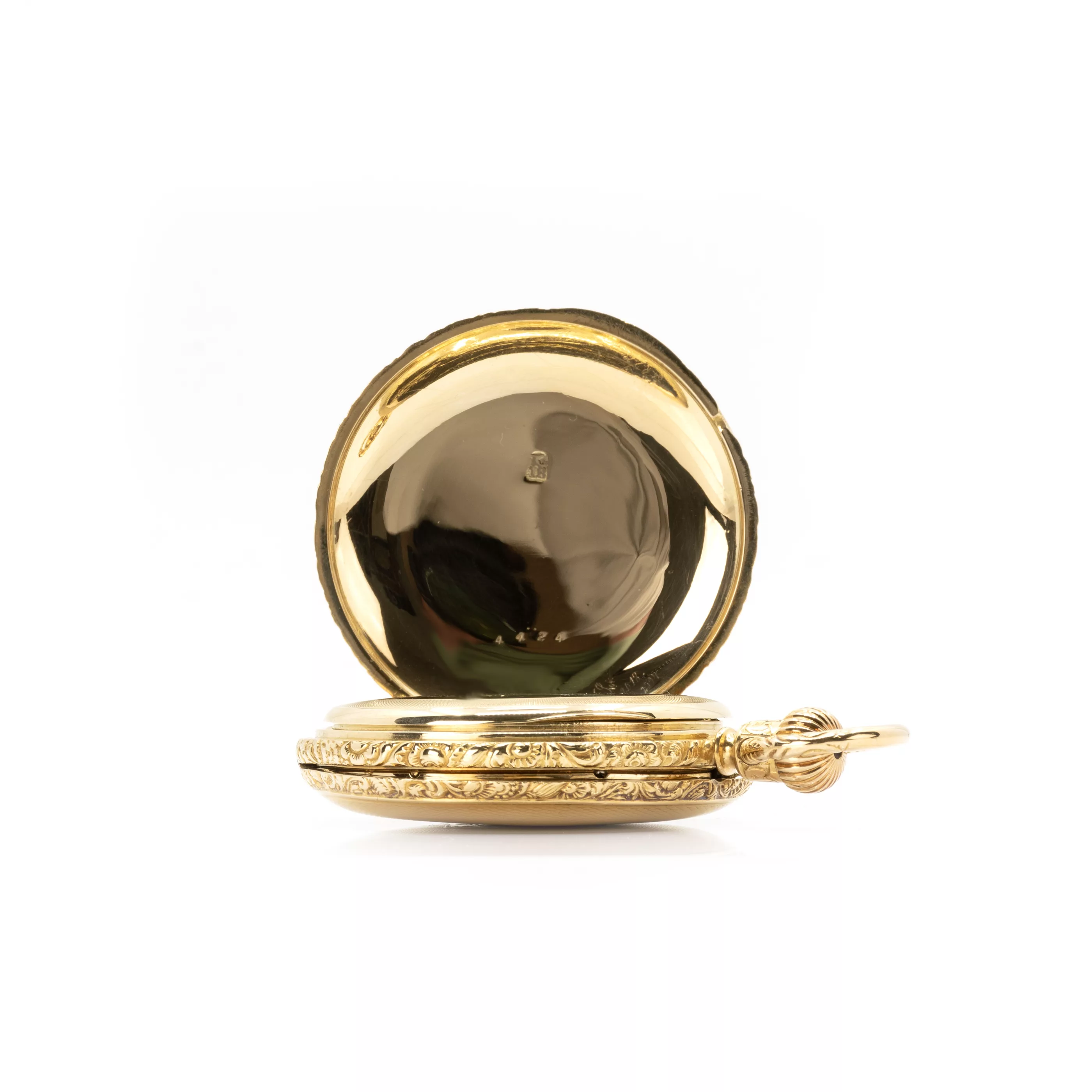Deutschland, um 1870-1873, Handaufzug, vernickeltes 3/4 Platinenwerk mit Streifen, Goldchatons, bimetallische Kompensationsunruh, Diamantdeckstein, Goldanker, -ankerrad und -minutenrad, Breguetspirale, Gehäuse 750 Gelbgold, punziert, Zwischendeckel 750 Gelbgold, Uhrenkette 750 Gelbgold, geprüft, guillochiertes Gehäuse, mit floral reliefierten Lünetten, Bügel und Hals, Kronenaufzug mit seitlichem Drücker zum Stellen des Zeigerwerks, Silberzifferblatt, graviert, vergoldet, stilisierte röm. Ziffern, kleine Sekunde, Zentrum und Zifferblattrand mit Eichenlaub- und Eicheldekor in Gold belegt, gebläute Stahlzeiger in Lilienform, Staubdeckel guillochiert und beschriftet, Gehäuse-, Staubdeckel- und Werk-Nr. 4424, Durchmesser 50 mm, Gewicht ca. 120,3 g, Kette ca. 37,8 g, Funktion geprüft, gangbar, Zustand gut/befriedigend, Spirale ist verbogen, reparaturbedürftig, mit Original-Box und Kopie des Kaufbelegs mit Beschreibung