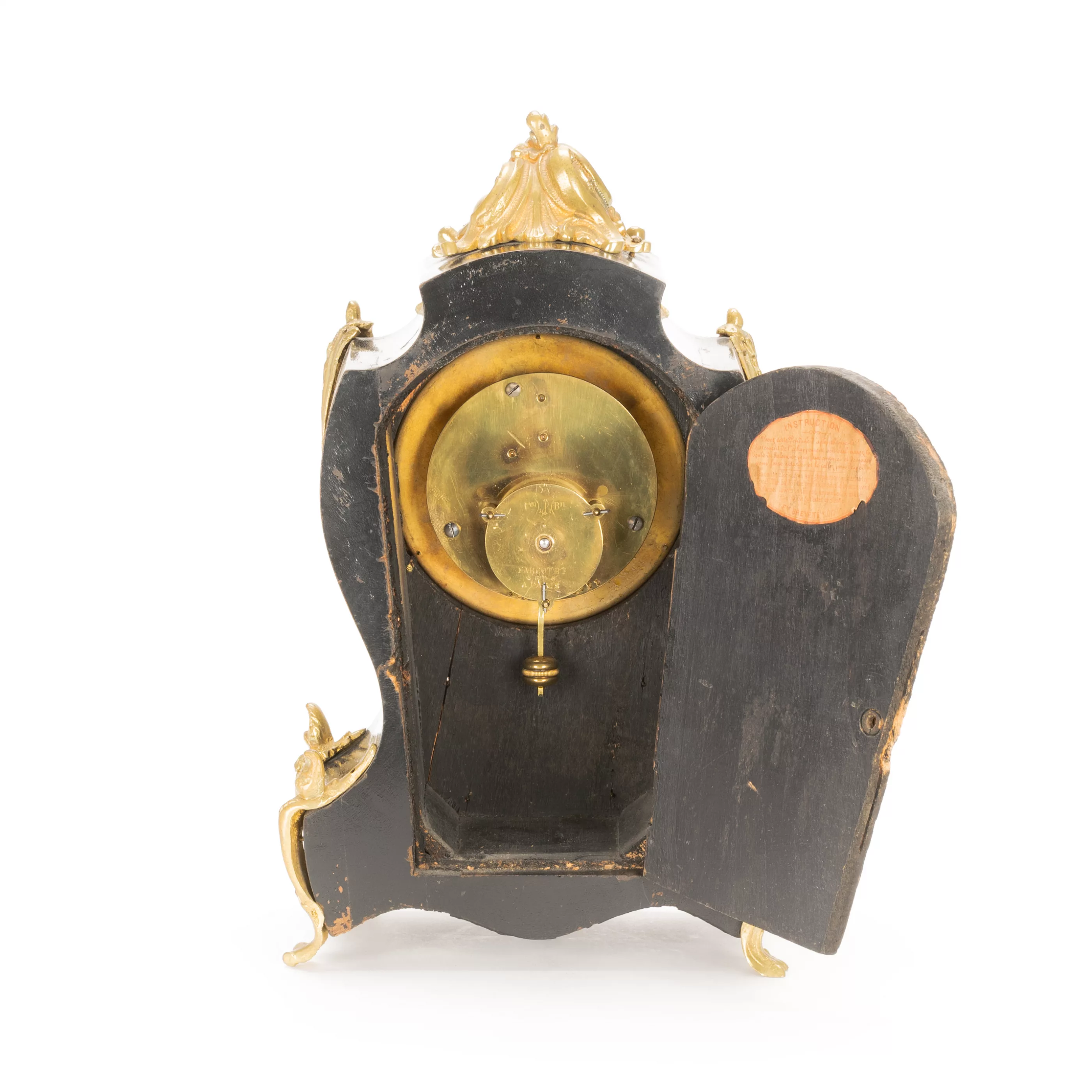Farcot e. Paris, France, circa 1860, dark lacquered wooden case, fire-gilt bronze mountings in rocaille forms, brass dial with enamel cartouches, black Roman numerals, blued hands, fixed pendulum, movement inscribed and numbered on the reverse, height 31 cm, function tested, starts, stops, in need of repair, case partially cracked. Farcot E. Paris patented the visible escapement in 1859.