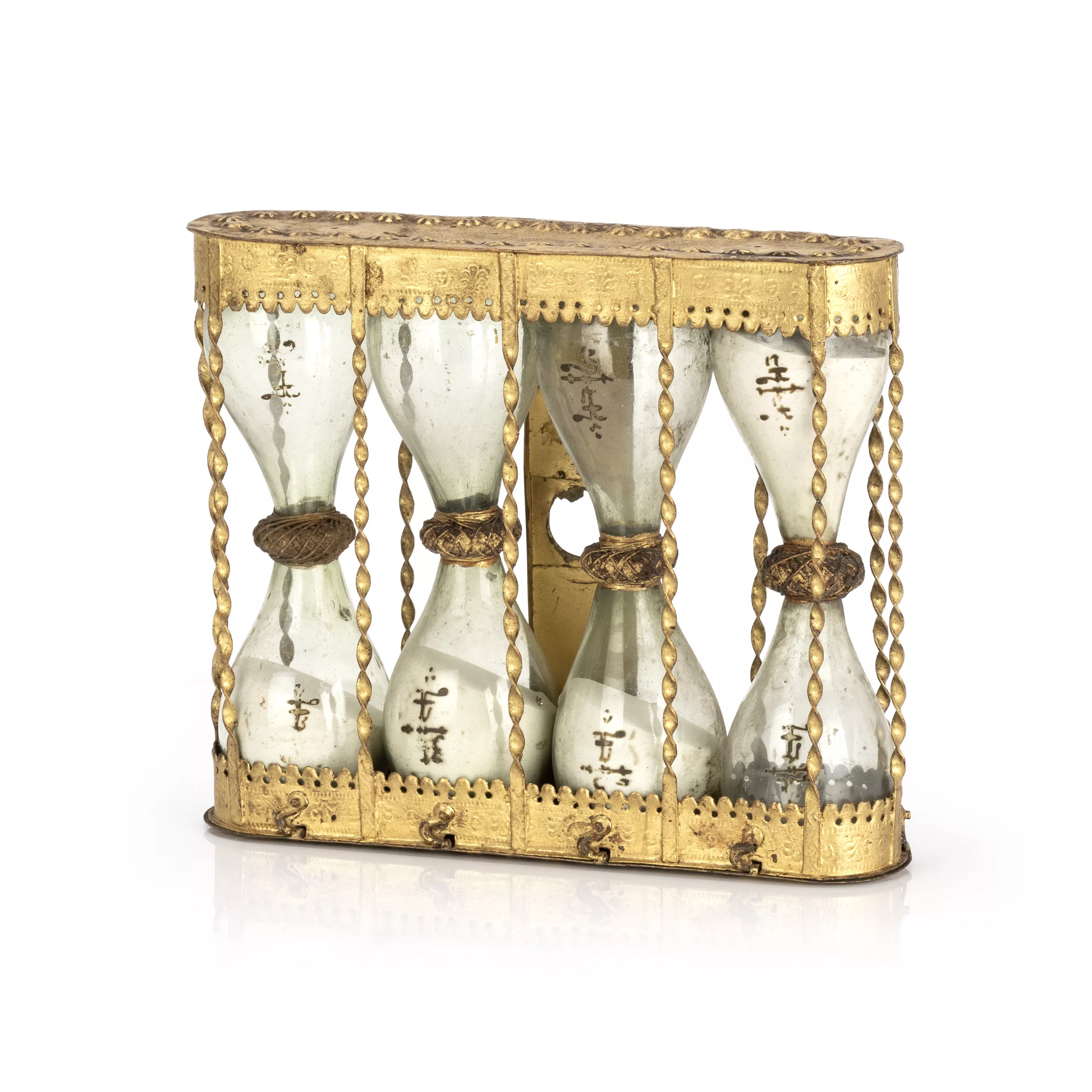 Deutschland, 18. Jh., Messing, getrieben, ziseliert und patiniert, Glas-Sanduhren mittig mit Karton und Schnur ummantelt, weißer Marmorsand, das Glas handbeschriftet, 18,5 x 22 cm, eine Sanduhr nicht funktionstüchtig, Alters- und Gebrauchsspuren. Typische drehbare barocke Kanzeluhr oder Predigtuhr, um die Dauer der Predigt vorzugeben. In der Regel enthielt das erste Glas Sand für eine Viertelstunde, das Zweite für eine Halbe Stunde, das Dritte für eine Dreiviertelstunde und das Vierte für eine volle Stunde.