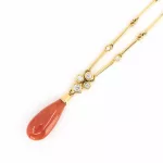 750 yellow gold, hallmarked, 6 brilliant and princess cut diamonds, total approx. 0.20 ct, H, vs, drop shaped coral pendant, length 39.4 cm, weight approx. 13.5 g. CITES - no shipping outside the EU