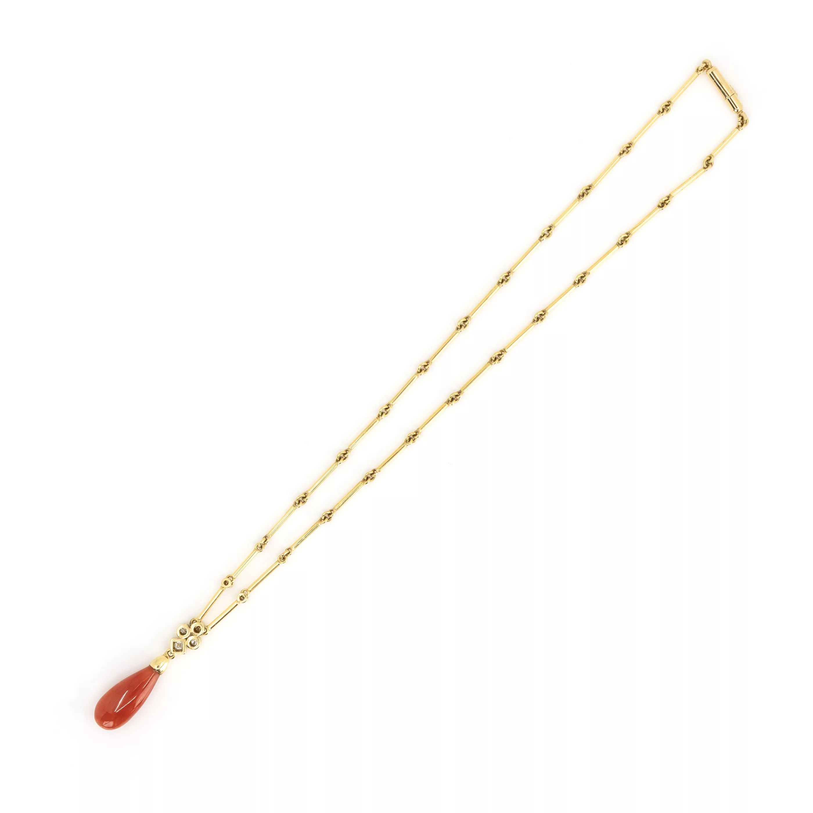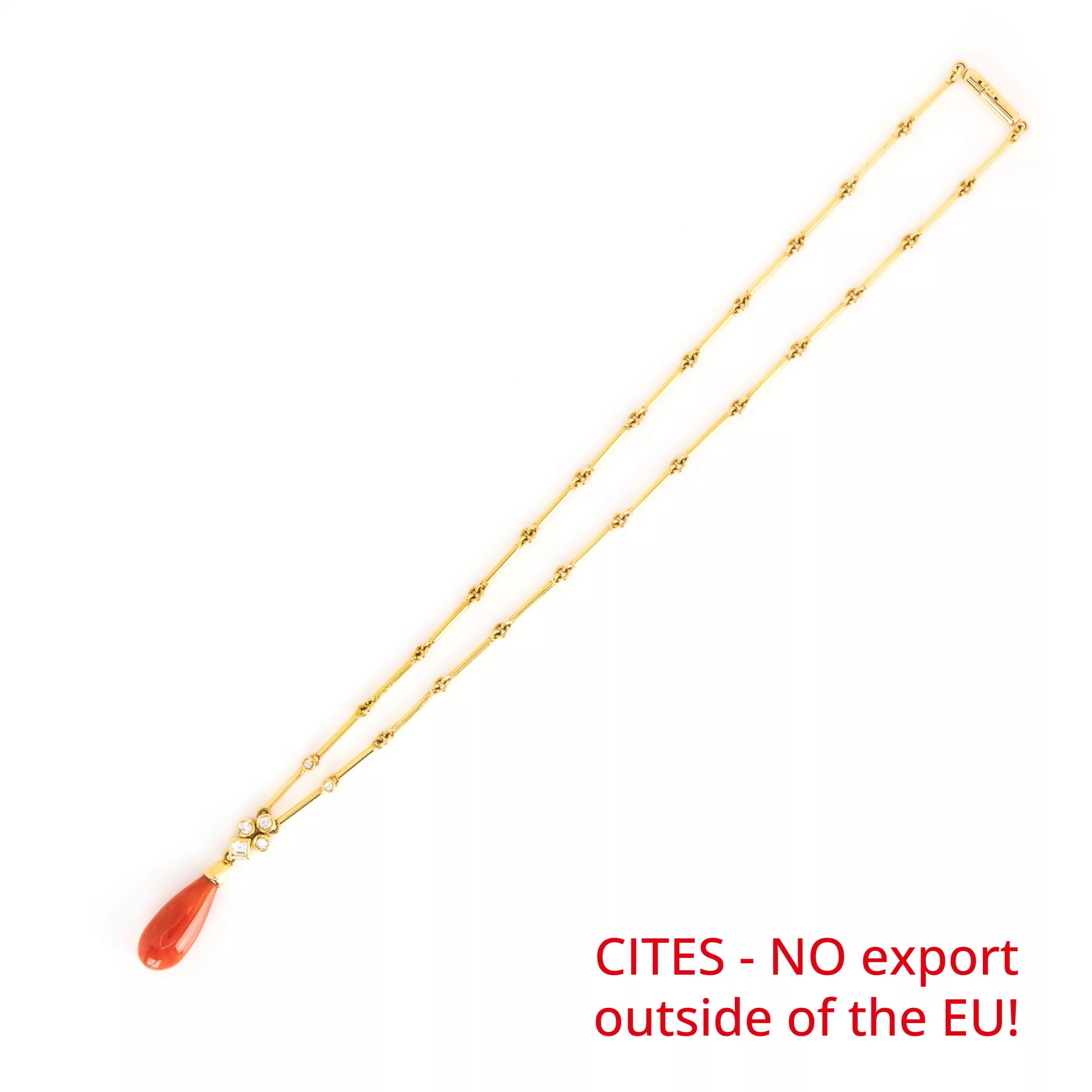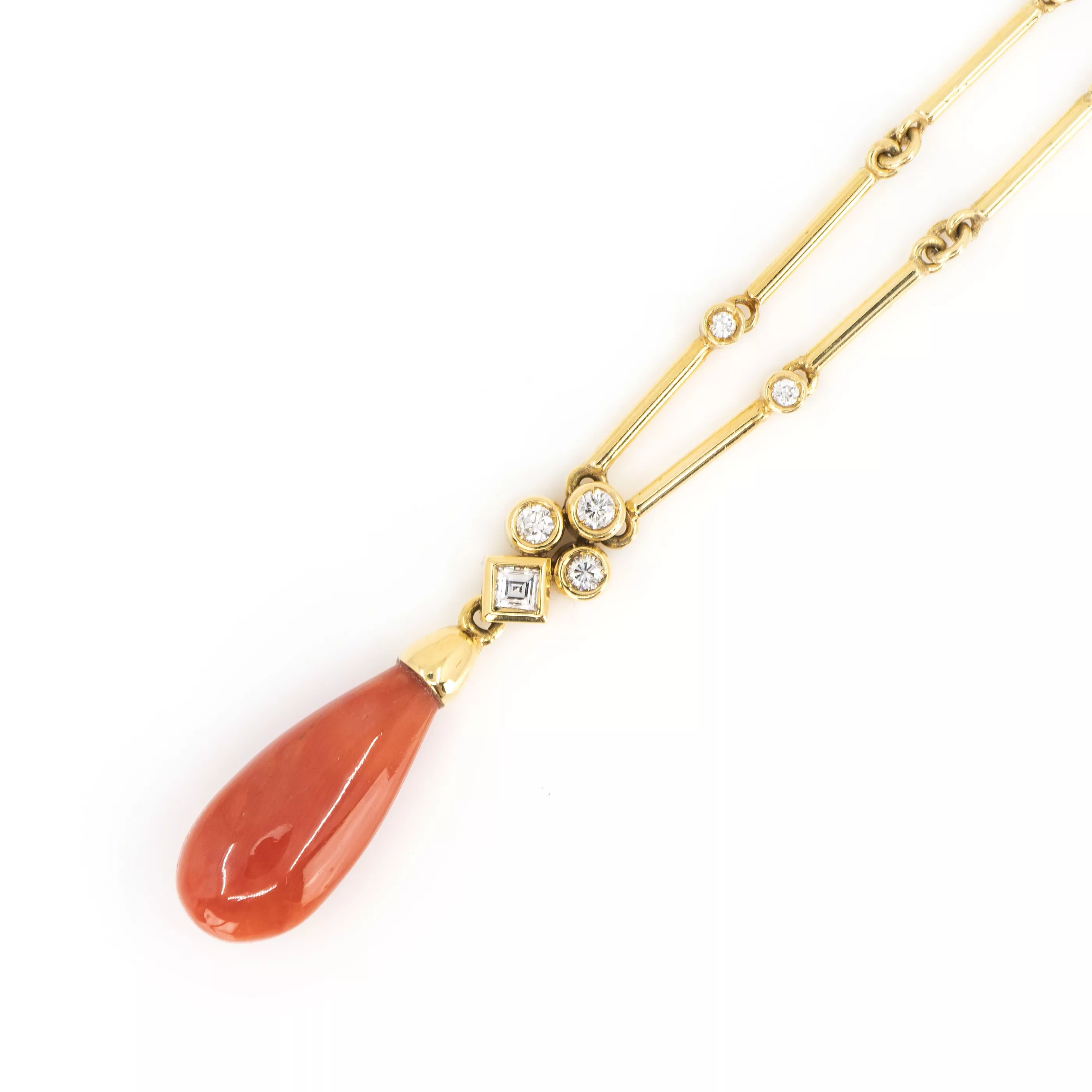 750 Gelbgold, punziert, 6 Diamanten im Brillant- und Prinzessschliff, gesamt ca. 0,20 ct, H, vs, Korallenanhänger in Tropfenform, Länge 39,4 cm, Gewicht ca. 13,5 g. CITES - kein Versand außerhalb der EU