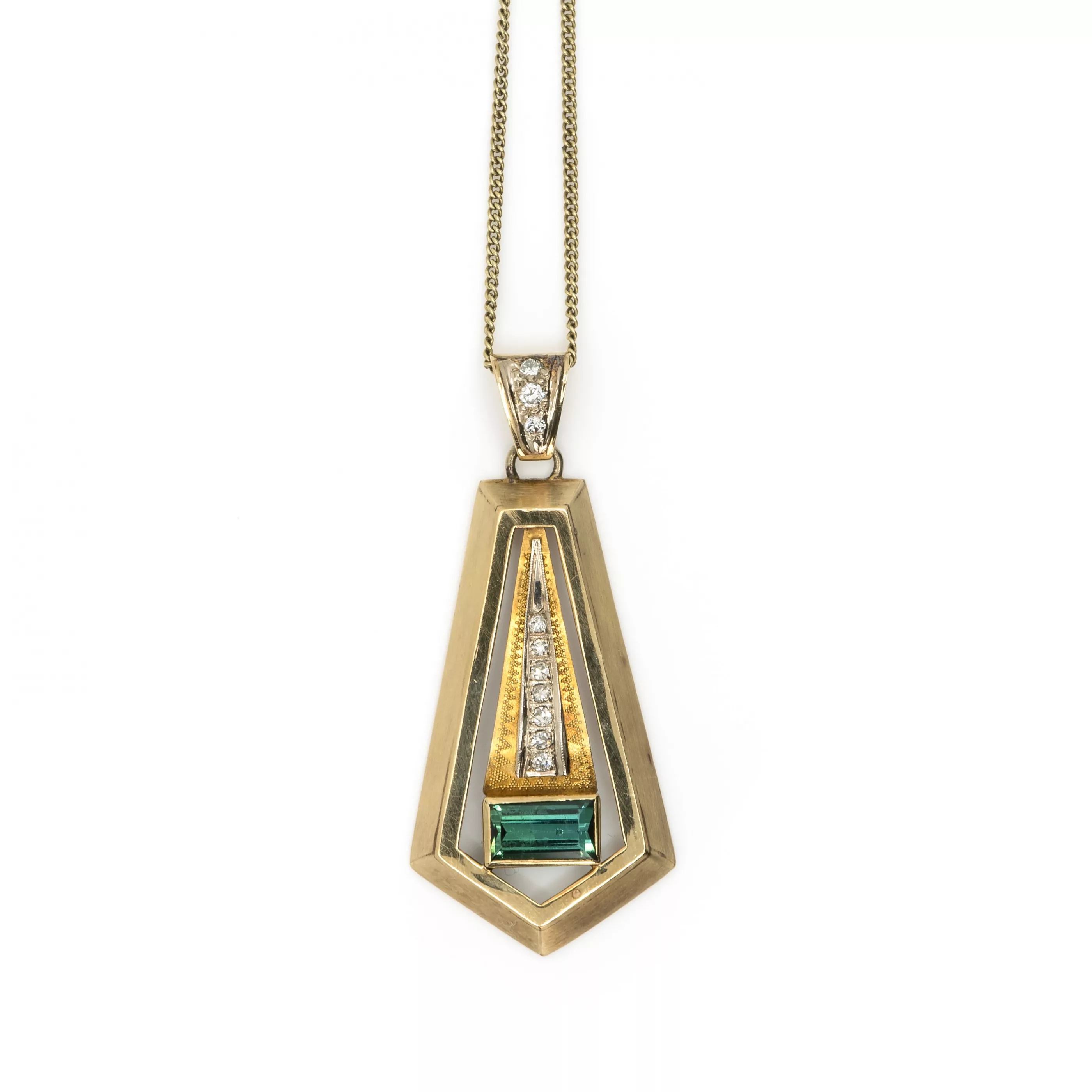 necklace and pendant 585 yellow gold, hallmarked, 9 brilliant and octagonal cut diamonds, total ca. 0,25 ct, H, vs-si, rectangular faceted tourmaline, ca. 1,50 ct, length necklace 60,5 cm, length pendant 5,5 cm, total weight ca. 13,5 g, tourmaline with minimal wear marks