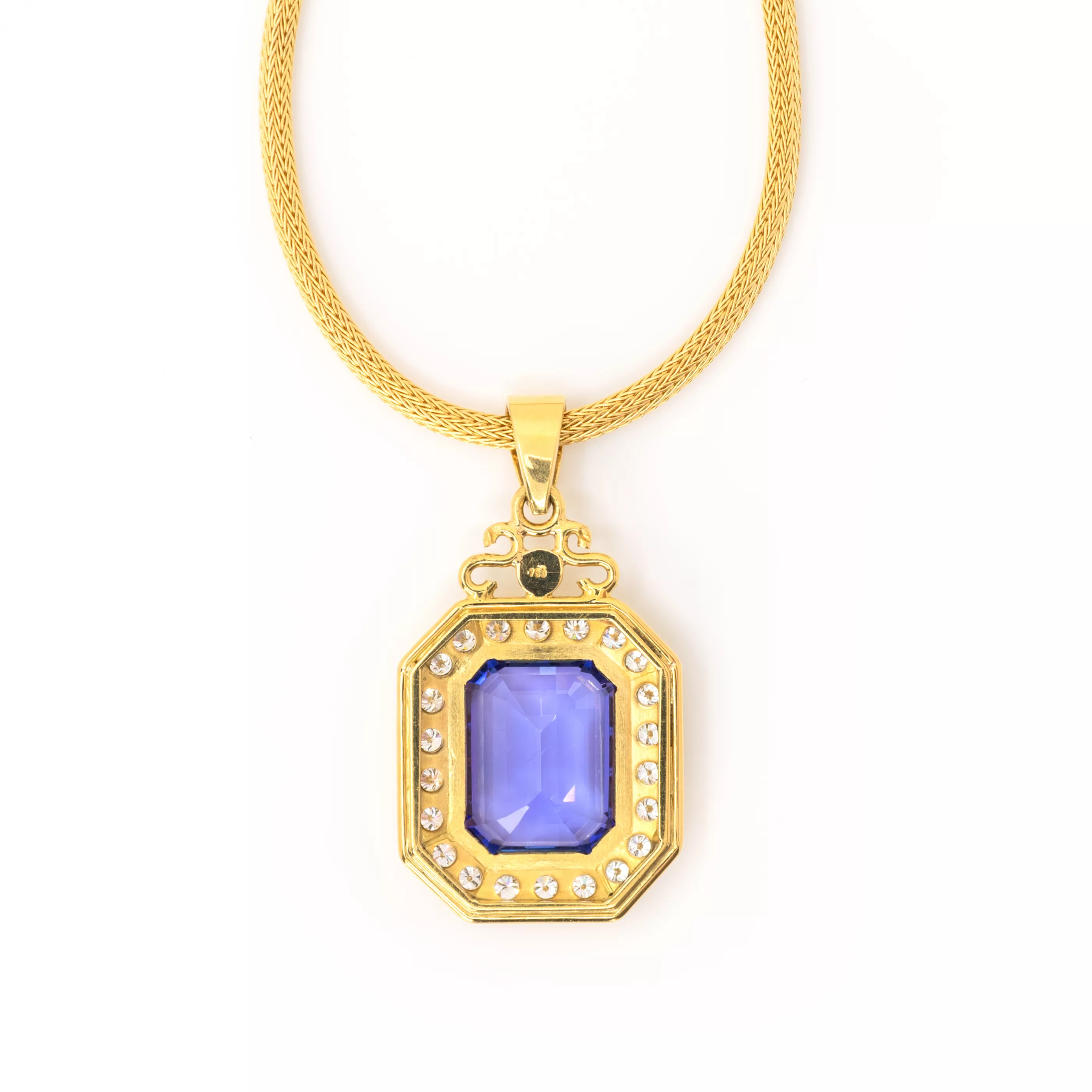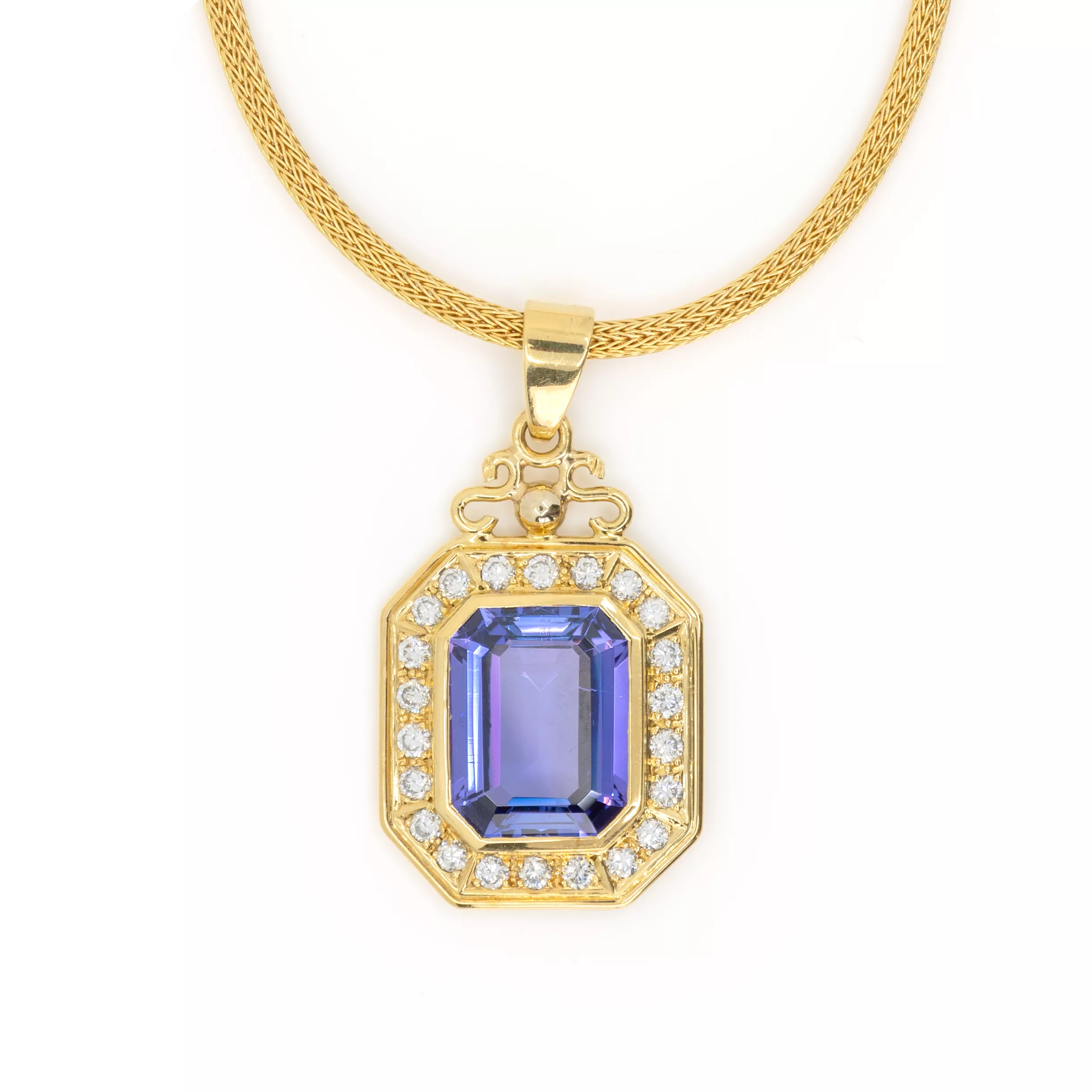 Schlauchkette 585 Gelbgold, punziert, Anhänger 750 Gelbgold, punziert, 22 Diamanten im Brillantschliff, gesamt ca. 0,88 ct, G-H, vs-si, Tansanit im Smaragdschliff, ca. 10,0 ct, 15 mm x 12 mm, Länge Kette 43,5 cm, Länge Anhänger 4 cm, Gesamtgewicht ca. 19,9 g