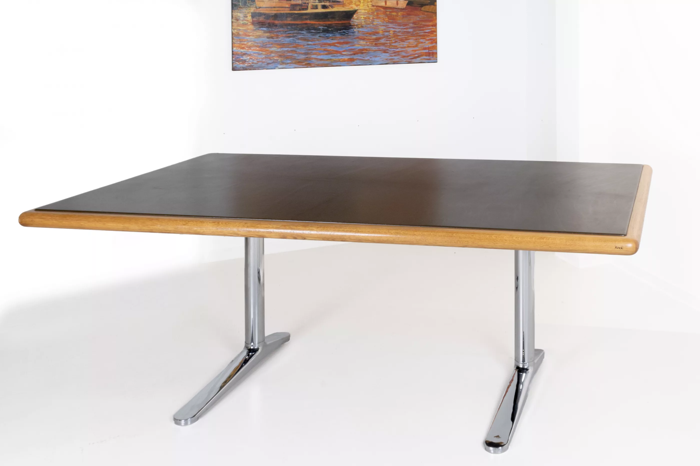 Knoll International, USA, Entwurf von Warren Platner (1919 - 2006), Stahl, Eichenholz, braunes Rindsleder, mit Herstellerstempel an der Tischplatte, 75 x 198,5 x 109 cm, Zustand B, partiell Alters- und Gebrauchsspuren, partiell Bereibungen und kleine Kratzer im Leder