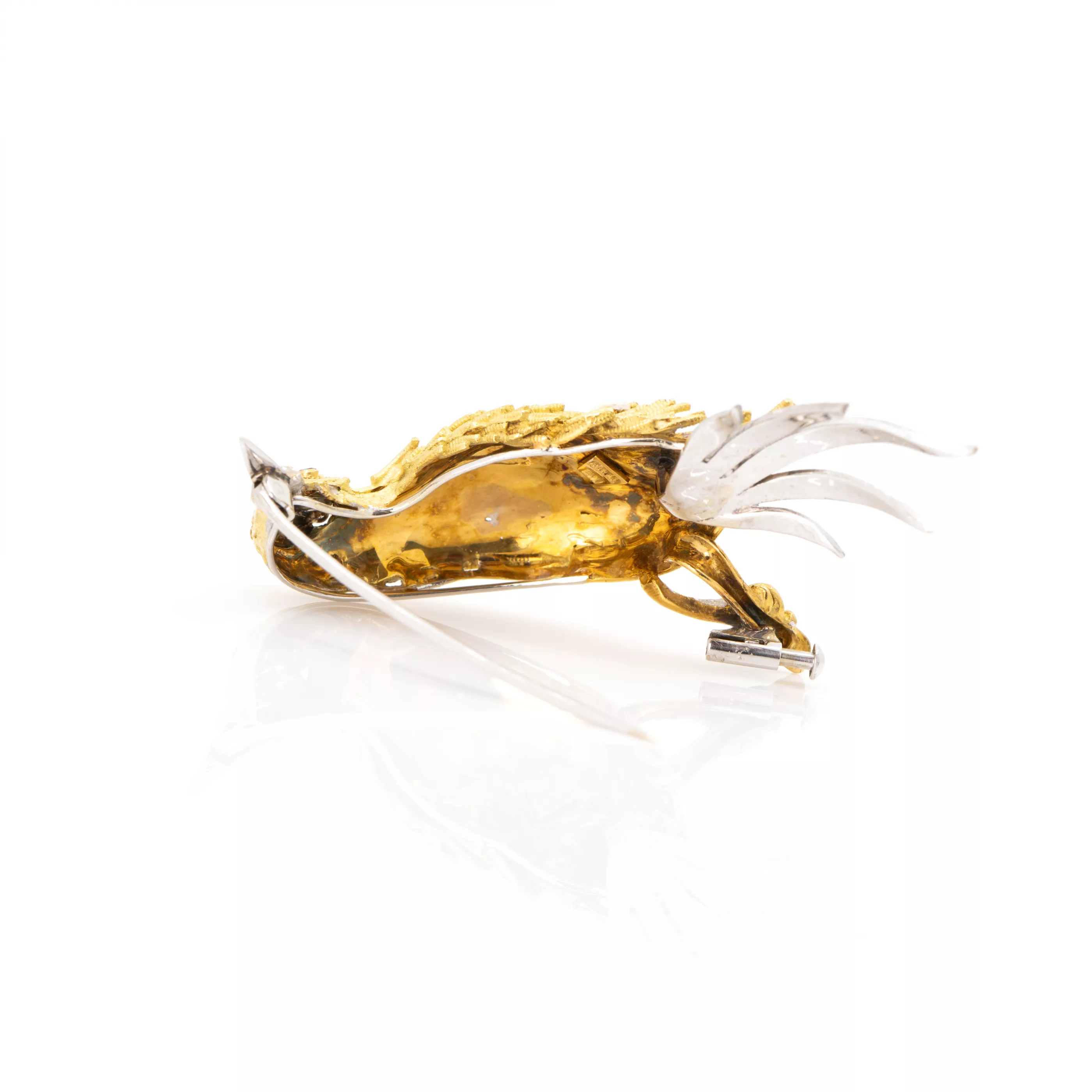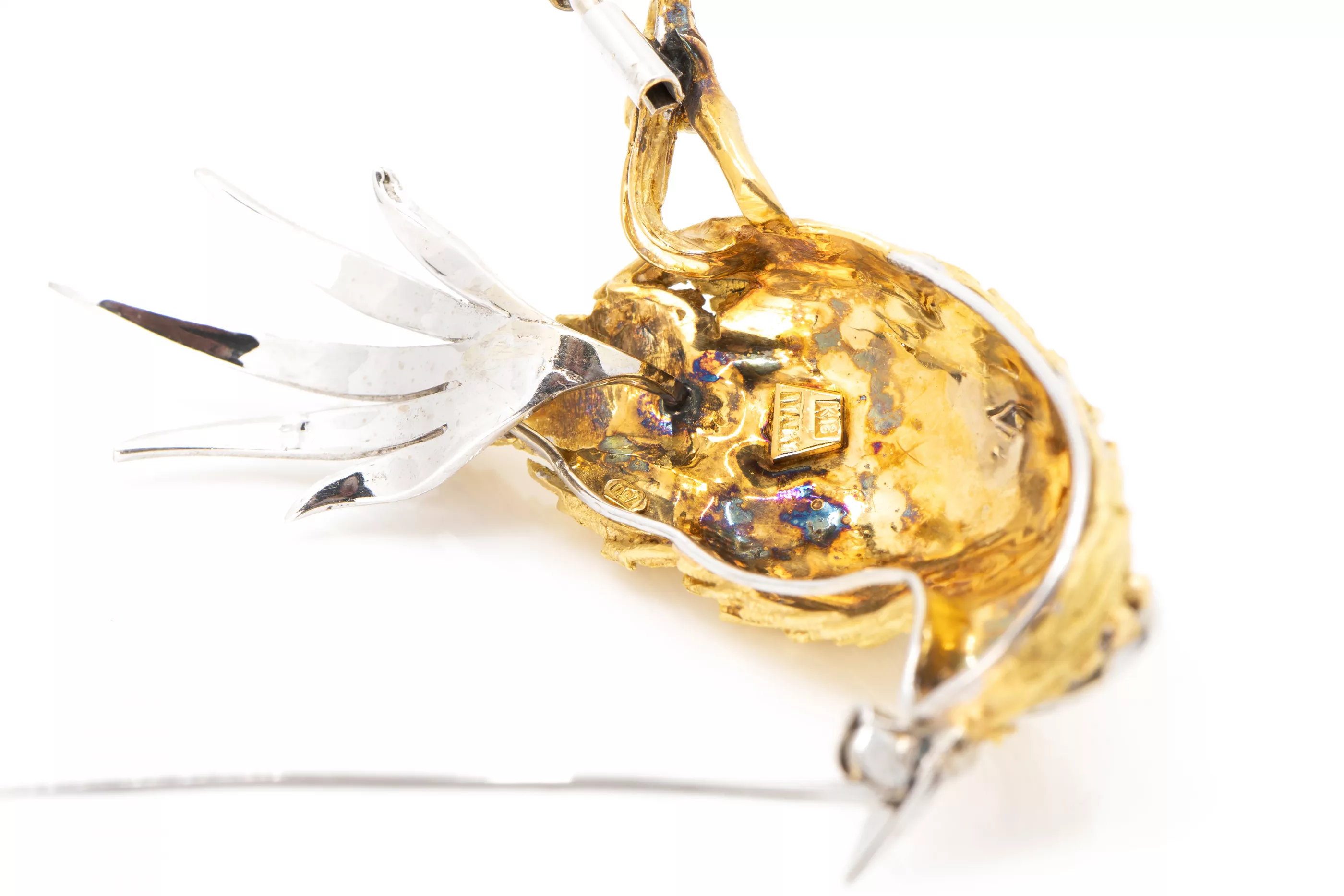 Italien, 750 Gelb- und Weißgold, punziert, 2 Diamanten im Brillantschliff, gesamt ca. 0,02 ct, ein kleiner Smaragd als Auge, Länge 6,2 cm, Breite 4,5 cm, Gewicht ca. 17,7 g